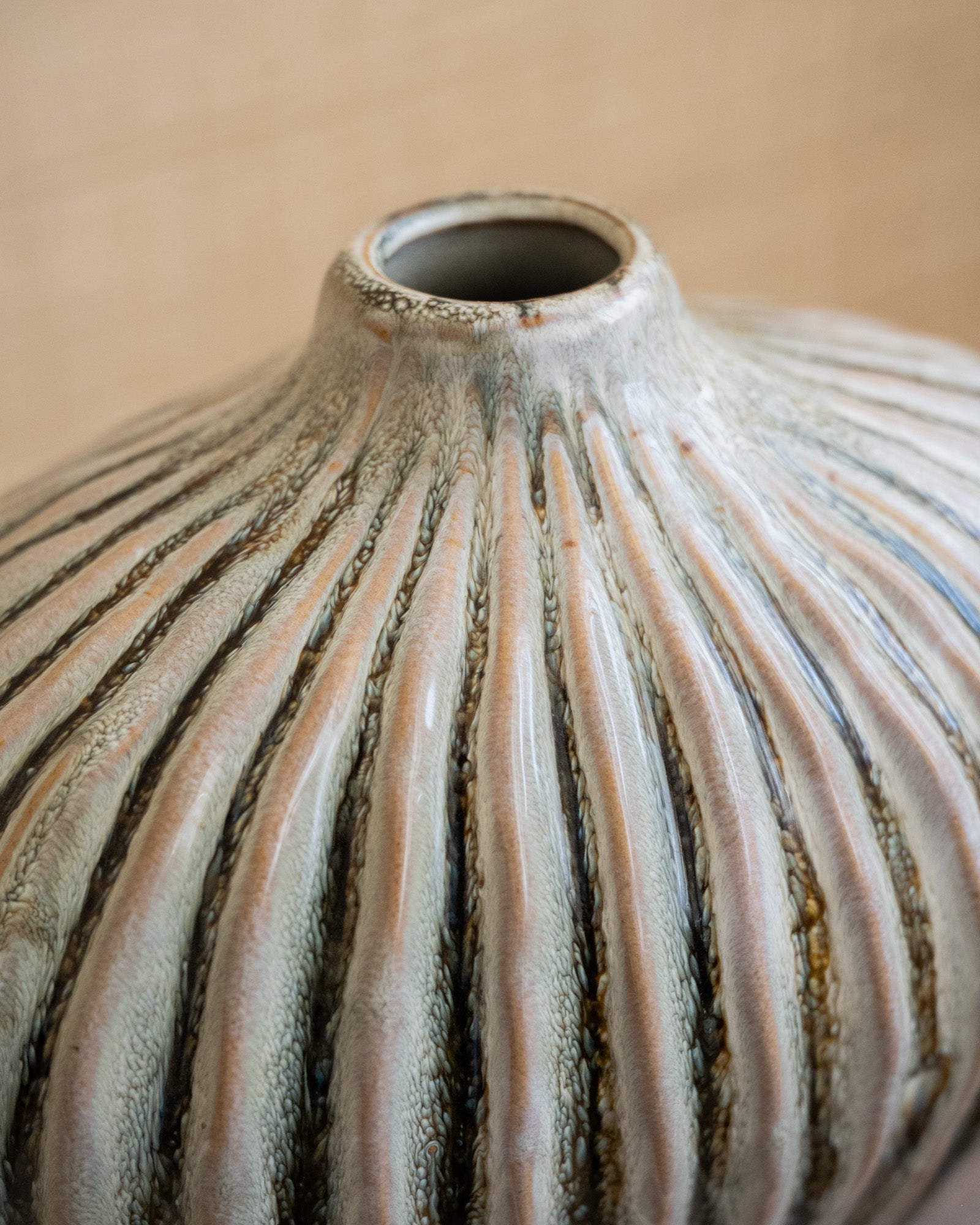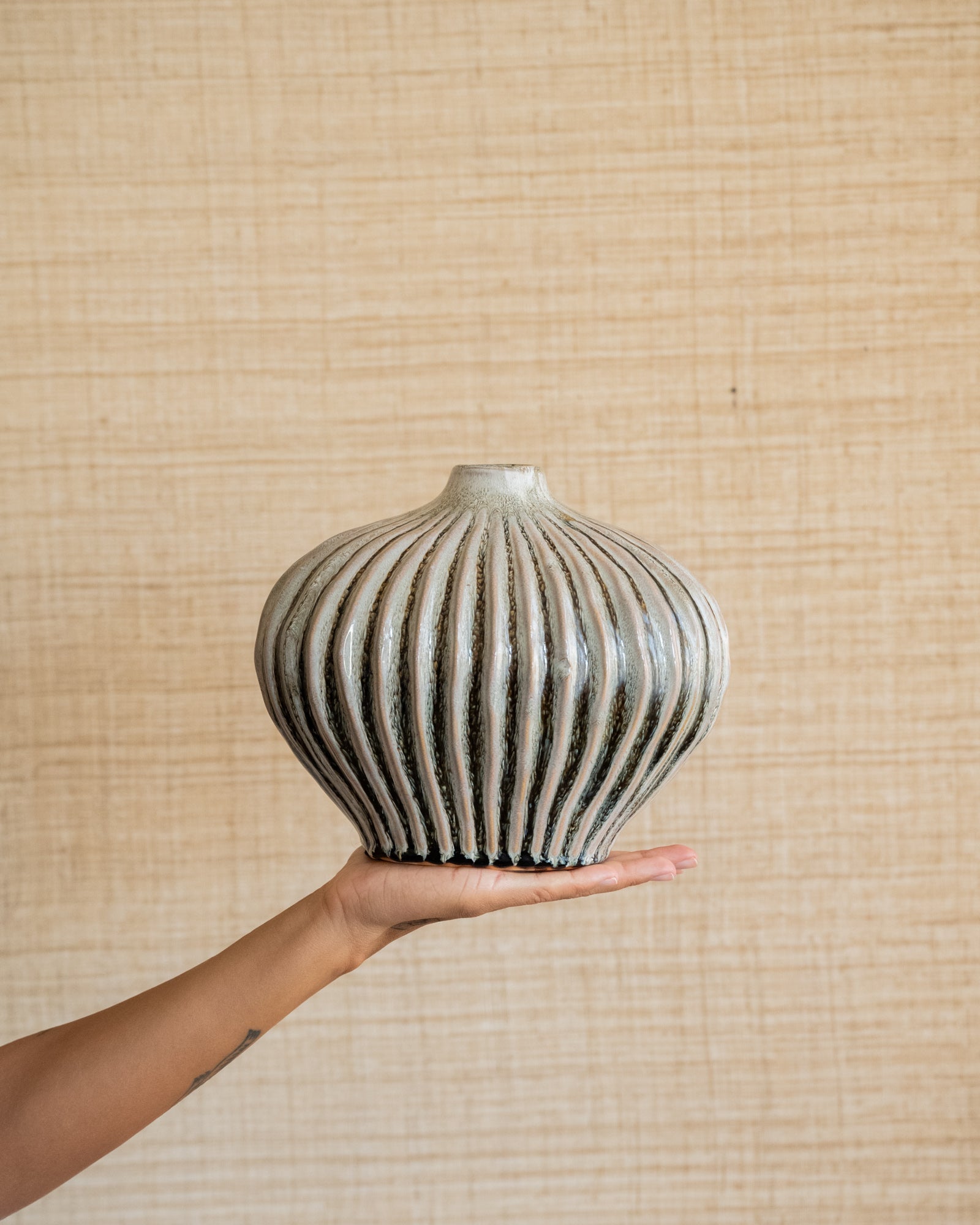 Verleihen Sie Ihrem Interieur mit dieser dekorativen Vase einen eleganten und stilvollen Look. Das organische Design und die dezente Rippenstruktur machen dieses Stück zu einem echten Hingucker. Schön allein oder kombiniert mit ein paar einzelnen Zweigen oder Trockenblumen.