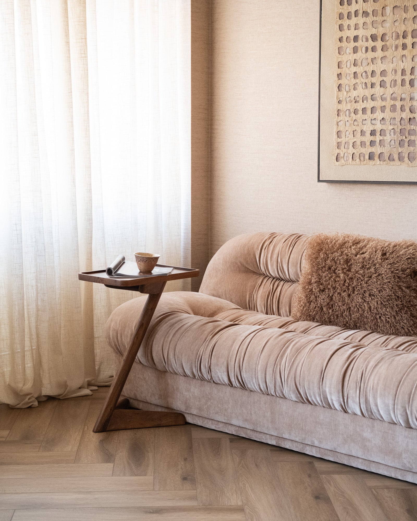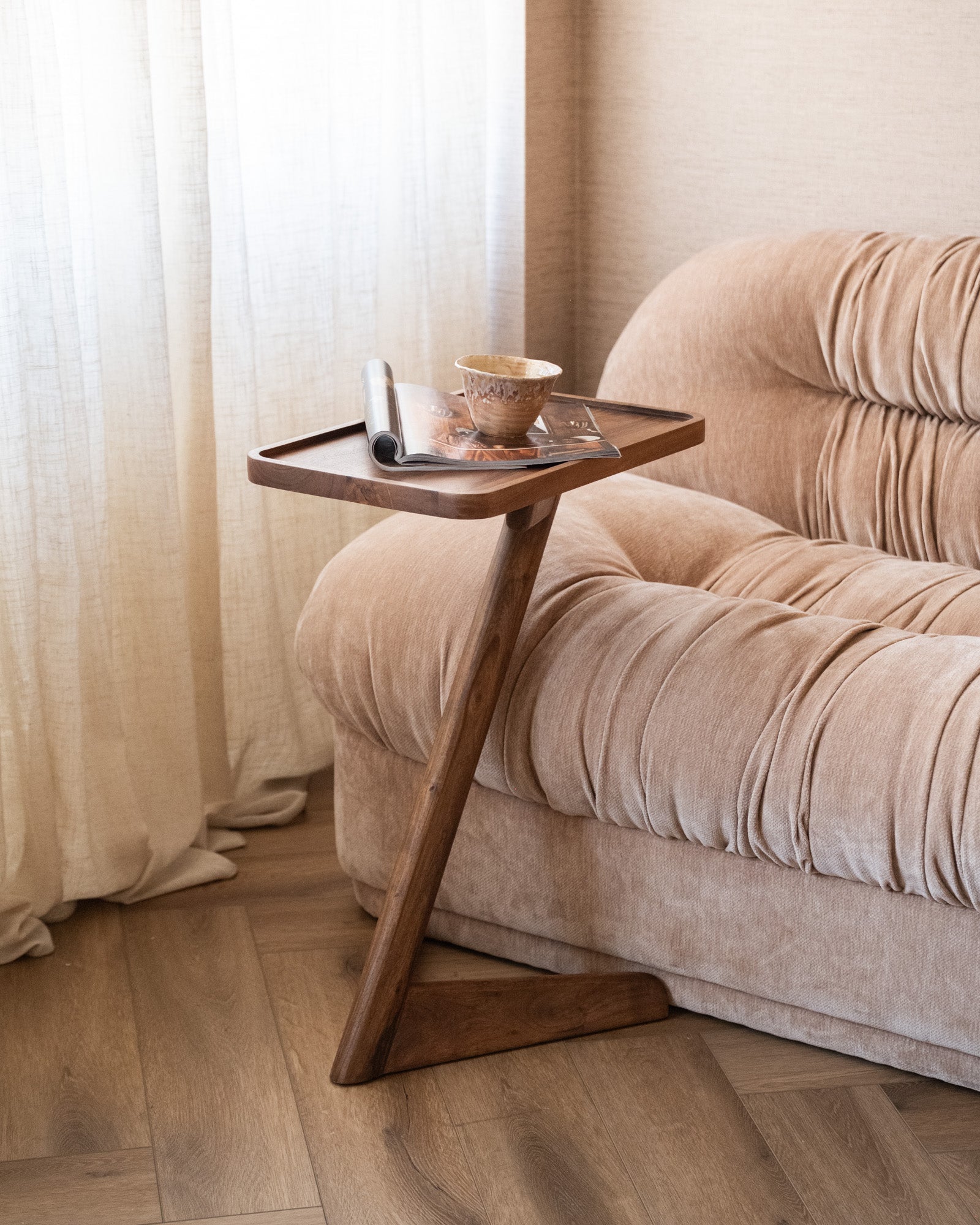 Dieser wunderschöne Beistelltisch aus massivem Akazienholz besticht durch seine warme, braune Farbe. Er passt perfekt an die Wand, macht aber auch neben oder hinter dem Sofa oder als Laptopständer neben dem Sofa eine gute Figur. Mit einer hübschen Tischlampe oder Vase ist er perfekt ergänzt. Er fügt sich harmonisch in ein Japandi-Interieur ein!