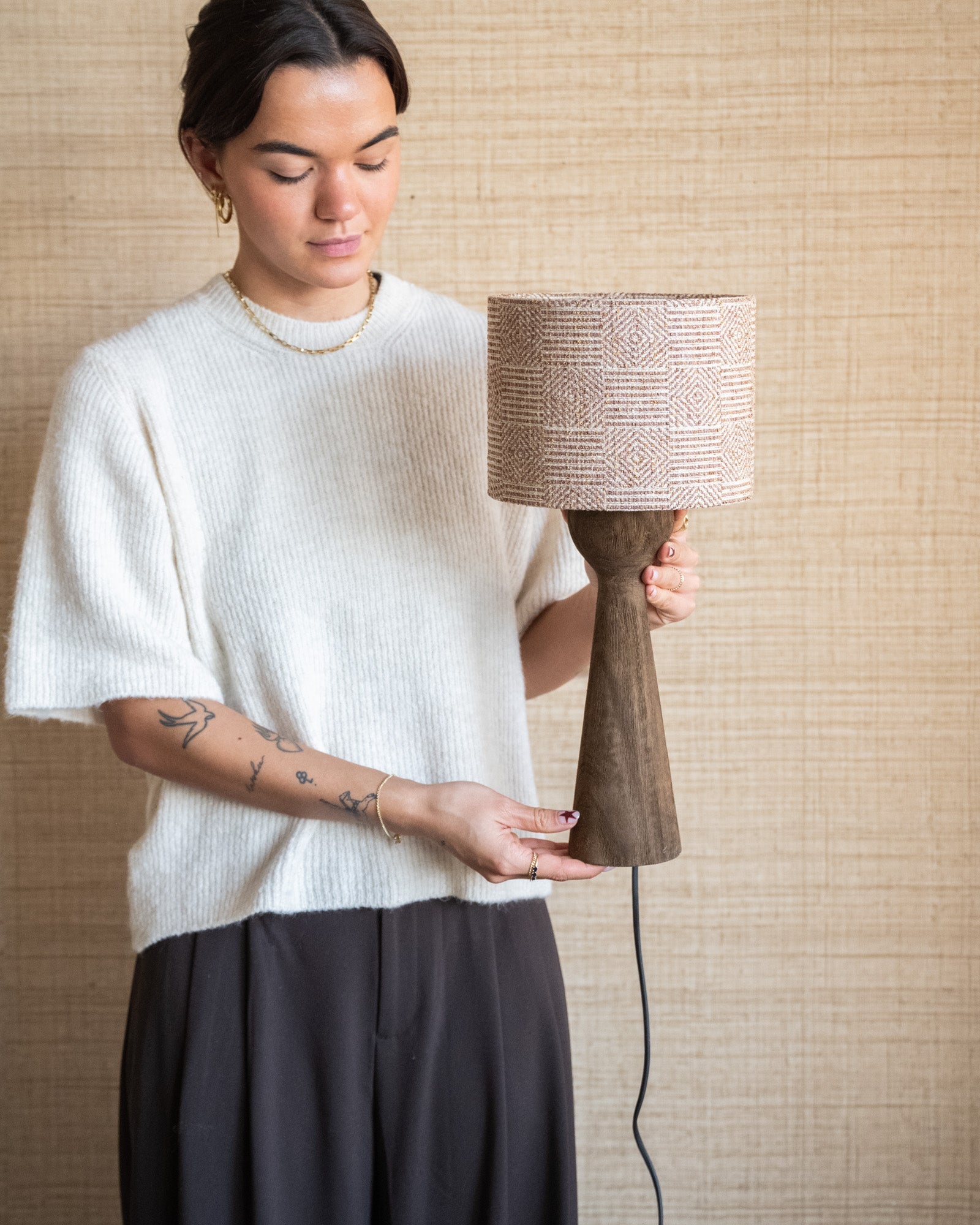 Die Festina Ravi Tischleuchte in Braun ist eine elegante Tischleuchte mit einem schlanken Holzfuß in warmem Braunton und einem Stoffschirm mit grafischem Muster. Die Kombination aus Holz und Stoff erzeugt eine stimmungsvolle Beleuchtung und eine natürliche, warme Atmosphäre im Wohnzimmer, Schlafzimmer oder Flur. Sie eignet sich perfekt als dekorative Tischleuchte auf Kommode, Nachttisch oder Beistelltisch in japanischen, modernen oder warmen, minimalistischen Interieurs.