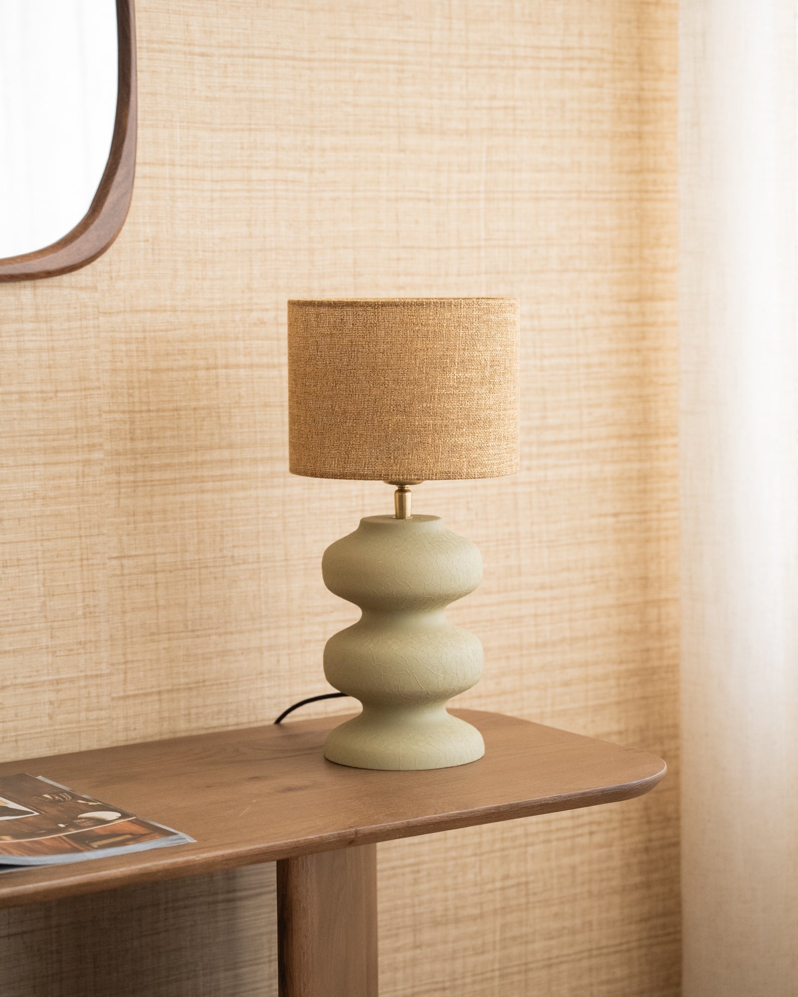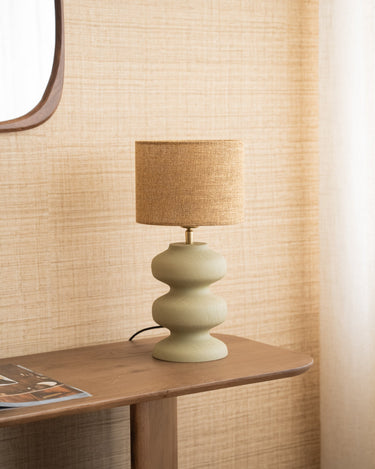 Die Tischleuchte Soroca Aiko Green verleiht Ihrem Zuhause ein warmes und stilvolles Ambiente. Der skulpturale Fuß in einem sanften Grünton mit dezenter Craquelé-Textur harmoniert perfekt mit dem Lampenschirm aus Naturstoff. Ideal für Kommode, Beistelltisch oder Nachttisch: Sie spendet sanftes, stimmungsvolles Licht und setzt elegante Akzente in Ihrem Interieur.