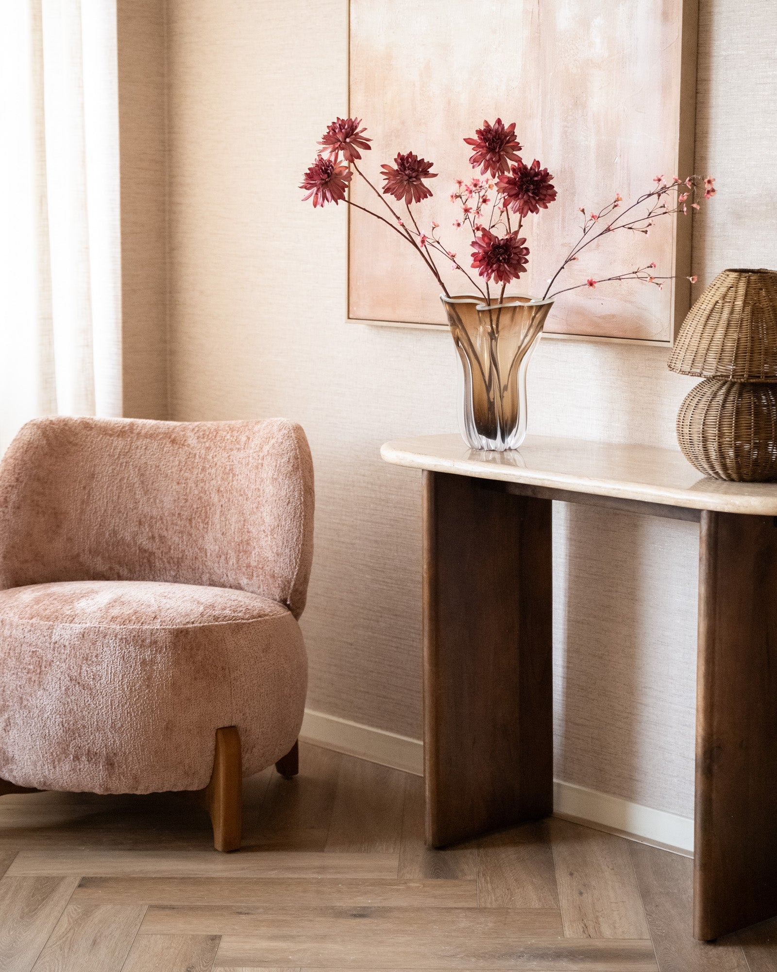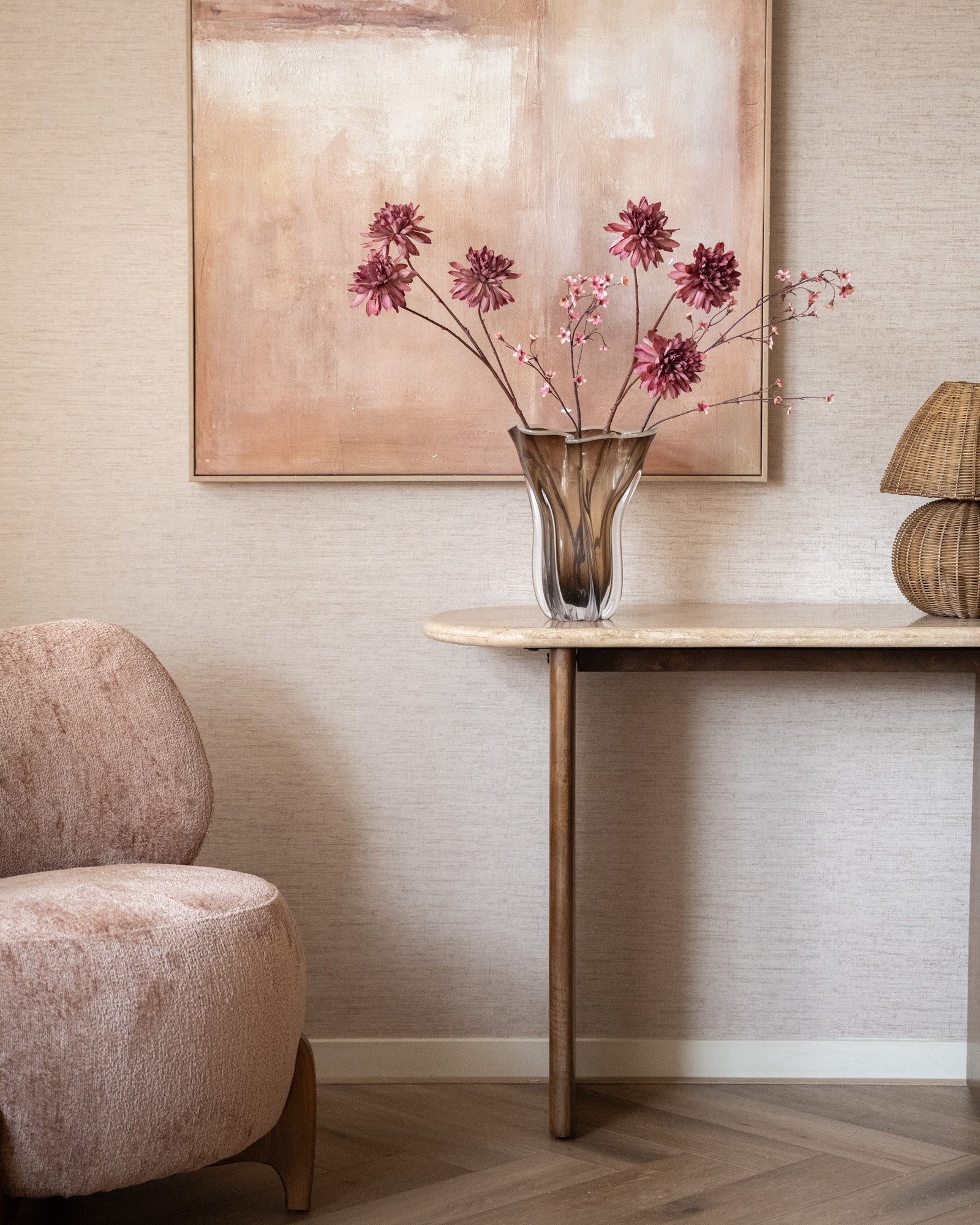 Die braune Glasvase von Kazuno ist eine elegante Vase mit organischer Form und warmem Braunton. Das transparente Glas und der gewellte Rand verleihen ihr einen verspielten und zugleich stilvollen Charakter. Sie eignet sich perfekt für einzelne Blumen, Zweige oder als dekoratives Einzelstück in einem modernen oder warmen Interieur.