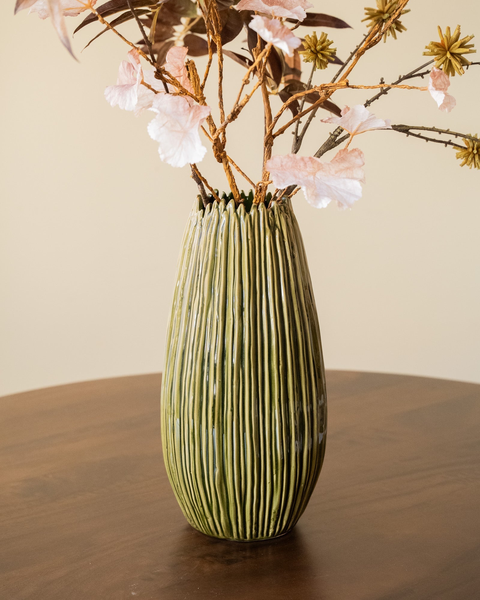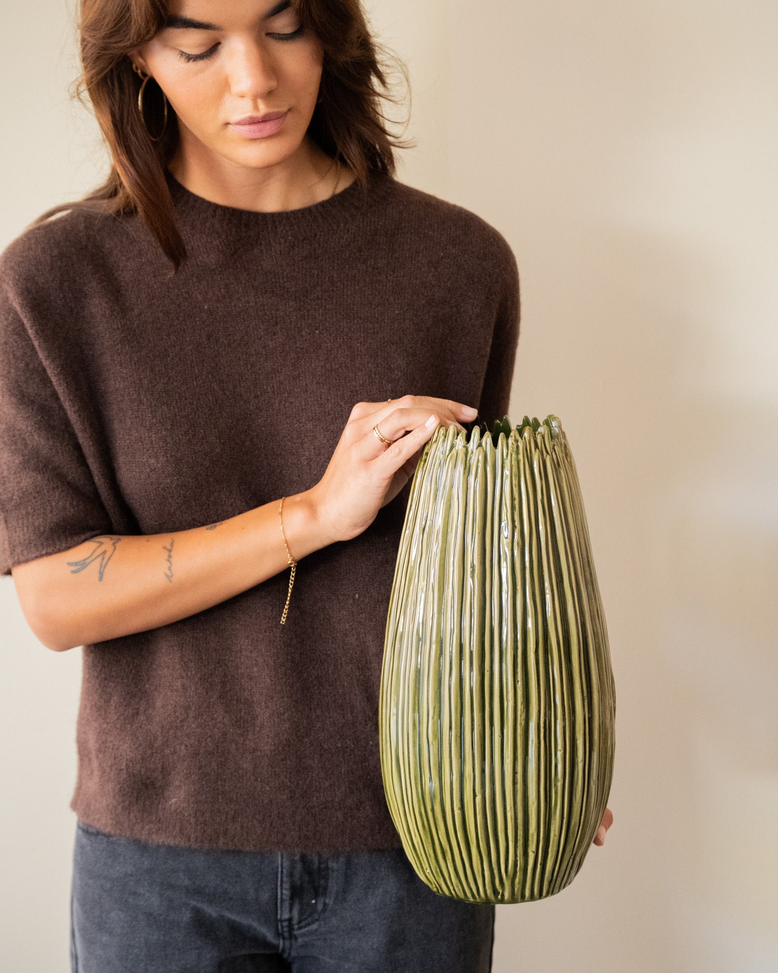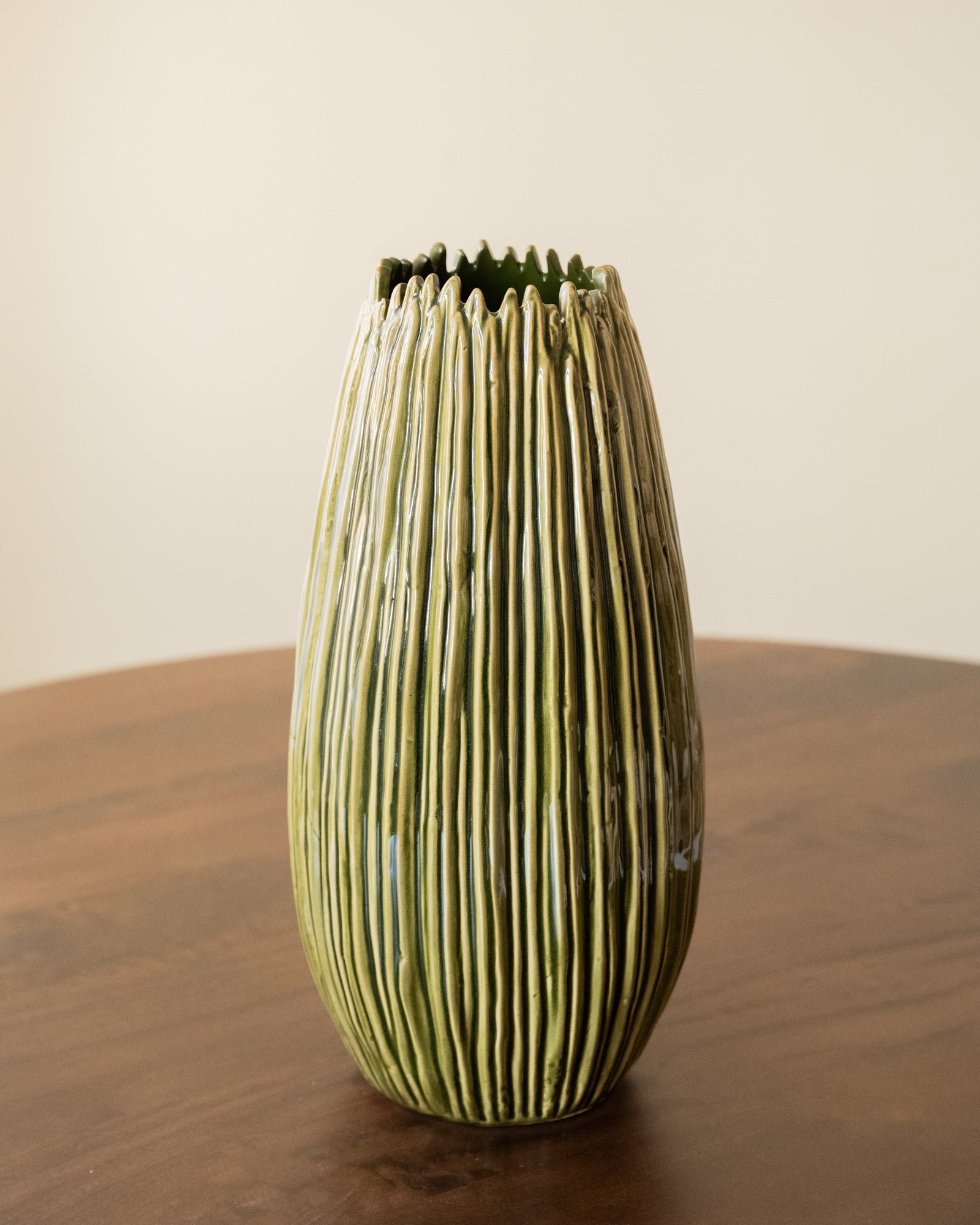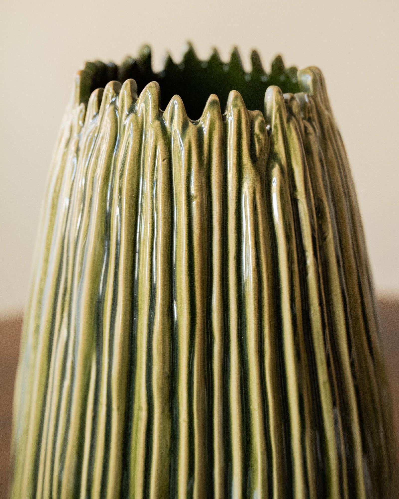 Die Dekovase Kopra Green ist eine Keramikvase mit einem markanten, organischen Reliefdesign und einer tiefgrünen Glasur. Die verspielten Linien verleihen der Vase ein modernes und natürliches Aussehen, perfekt für Kunstblumen, Trockenblumen oder als Blickfang auf einem Tisch oder Sideboard. Ein echter Hingucker, der Ihrem Interieur sofort eine frische und stilvolle Note verleiht.