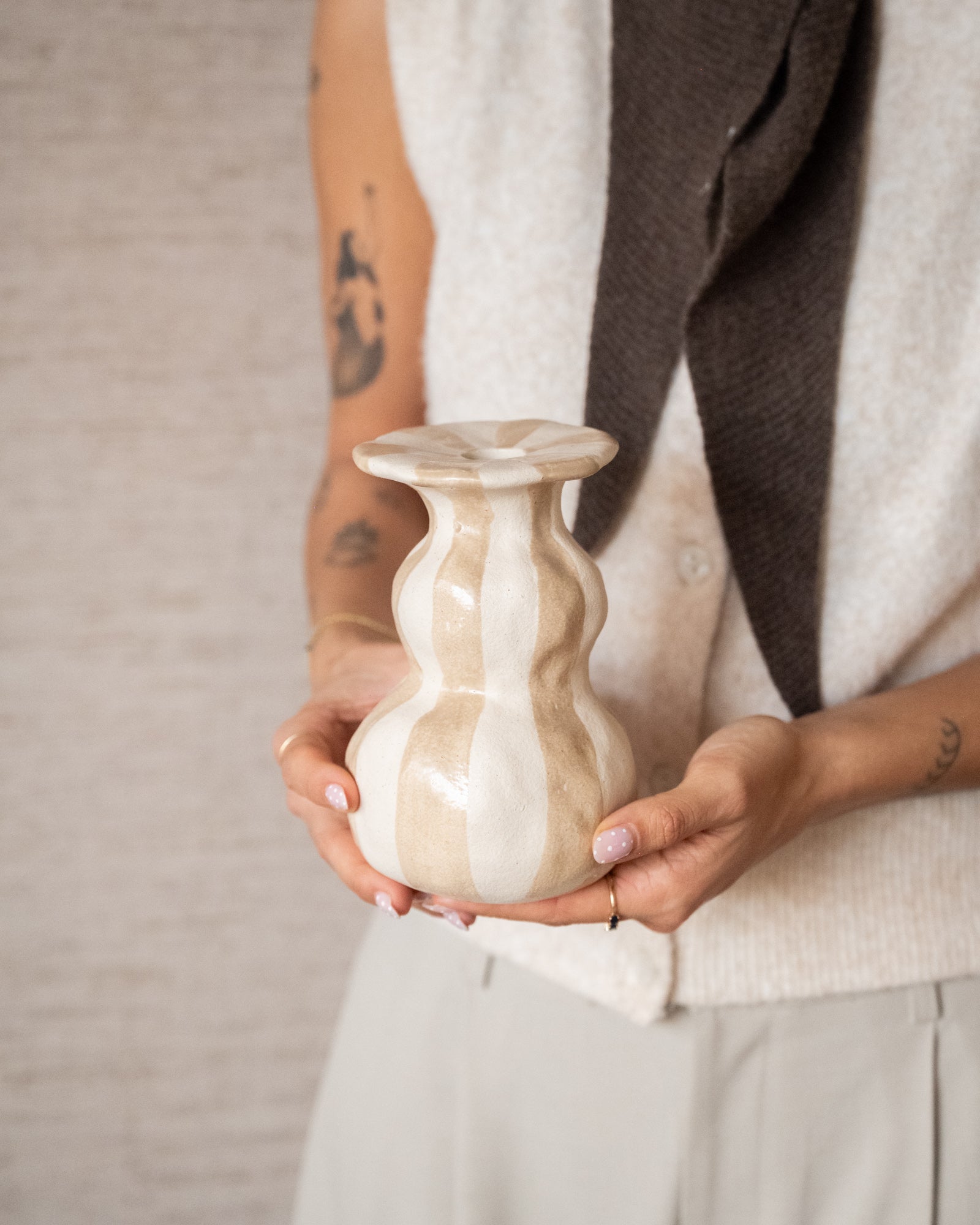 Verleihen Sie Ihrem Zuhause mit dem Keramik-Kerzenhalter Larisa einen Hauch von Glanz. Die weißen und beigen Streifen sorgen für einen verspielten, fast zirkusartigen Look, der perfekt zu einer kreativen und gemütlichen Atmosphäre passt. Es macht auch Spaß, die beiden Varianten zu kombinieren!