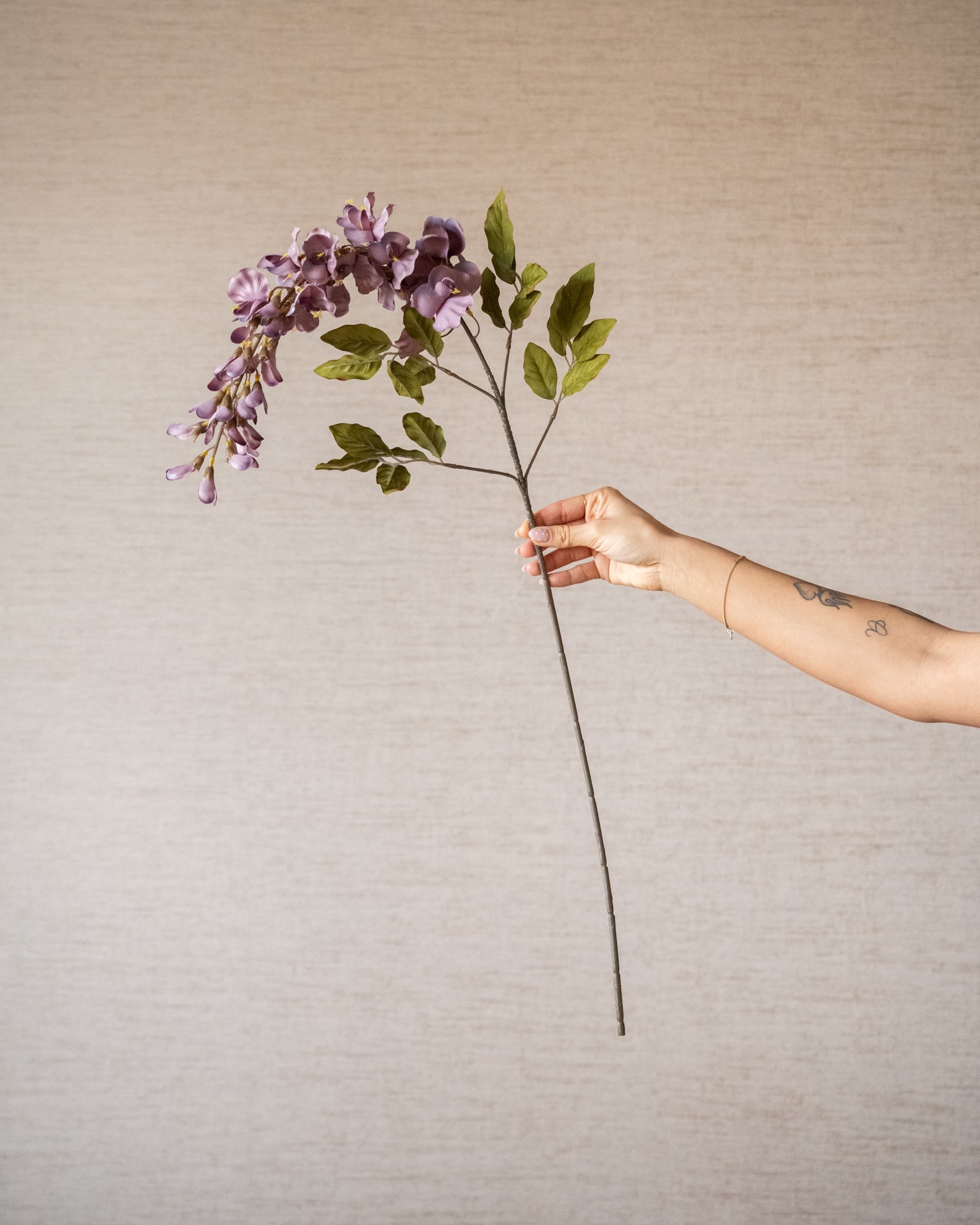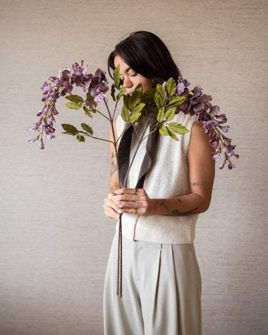 Die künstliche Flieder-Glyzinie verleiht Ihrem Zuhause mit ihren eleganten, herabhängenden Blüten in einem zarten Fliederton ein sanftes, romantisches Ambiente. Dank ihrer naturgetreuen Details und des flexiblen Stiels eignet sich diese Kunstblume perfekt, um sie einzeln in einer Vase zu arrangieren oder in einem verspielten Strauß zu kombinieren. Ideal für alle, die Blumen lieben, aber einen pflegeleichten Look bevorzugen und sich das ganze Jahr über an einem frischen und stilvollen Ambiente erfreuen möchten.