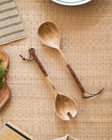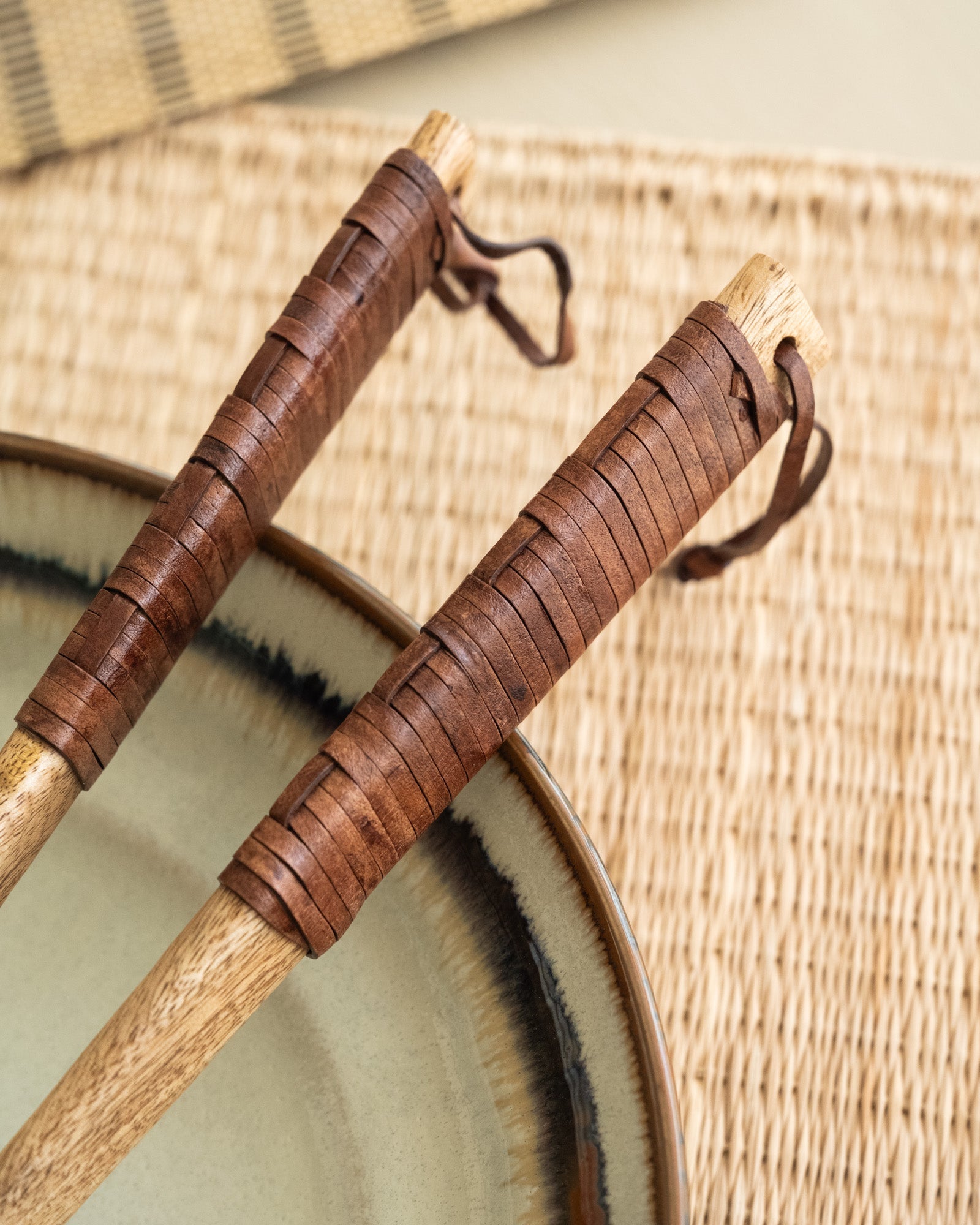 Servieren Sie Salate stilvoll mit diesem handgeschnitzten Salatbesteck aus Mangoholz mit Lederdetails. Dank der natürlichen Maserung und Farbnuancen des Holzes ist jedes Stück ein Unikat. Die Kombination aus robustem Holz und kräftigen Lederakzenten verleiht jedem Tisch eine warme, elegante Note.