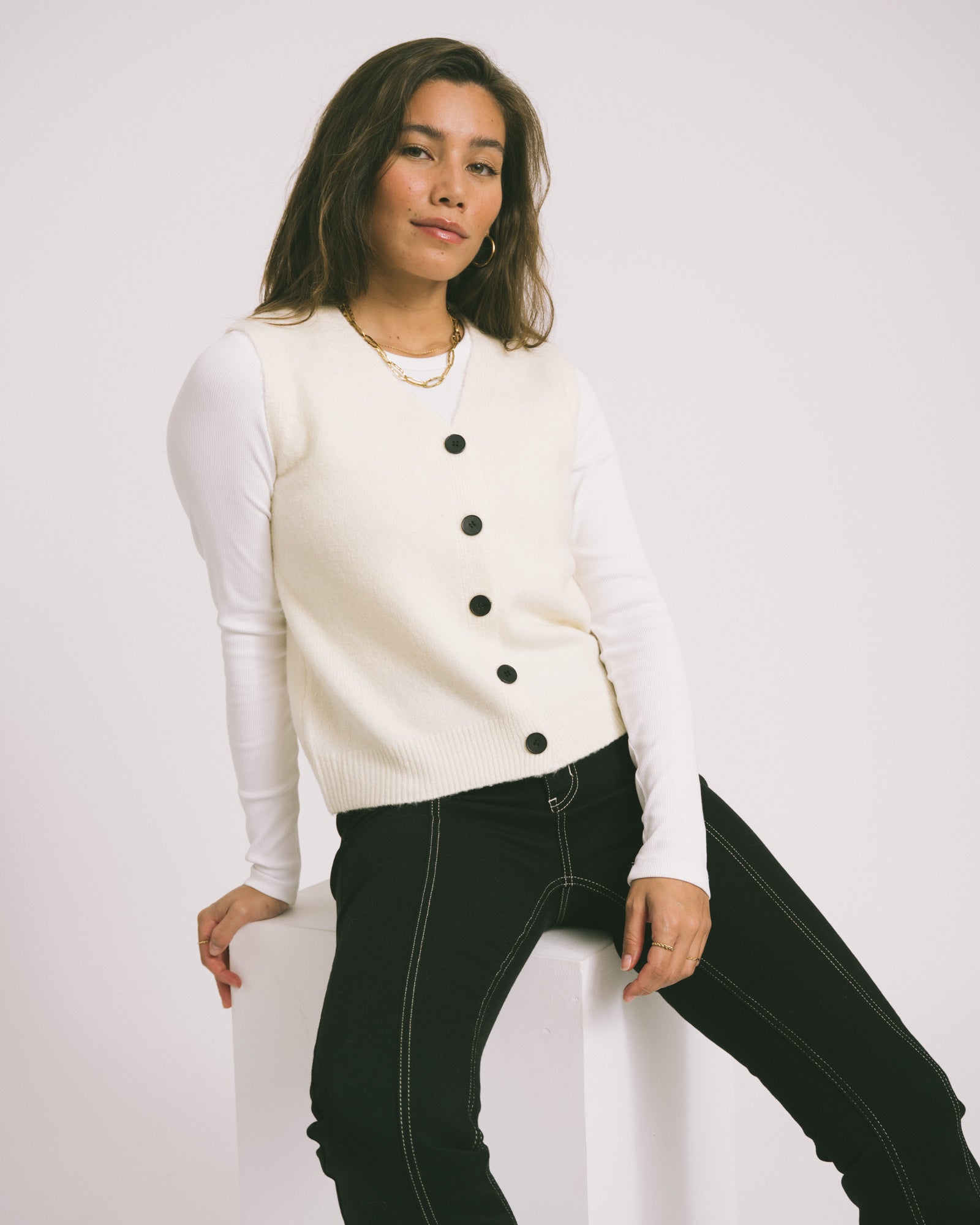 Die Lisa Weste ist Ihr neuer Begleiter für jede Jahreszeit. Diese ärmellose Strickjacke eignet sich perfekt für einen warmen Sommertag, aber auch ideal zum Tragen im Winter. Der weiche Strick, der tiefe V-Ausschnitt und die schwarzen Knöpfe verleihen ihr einen zeitlosen Look.
