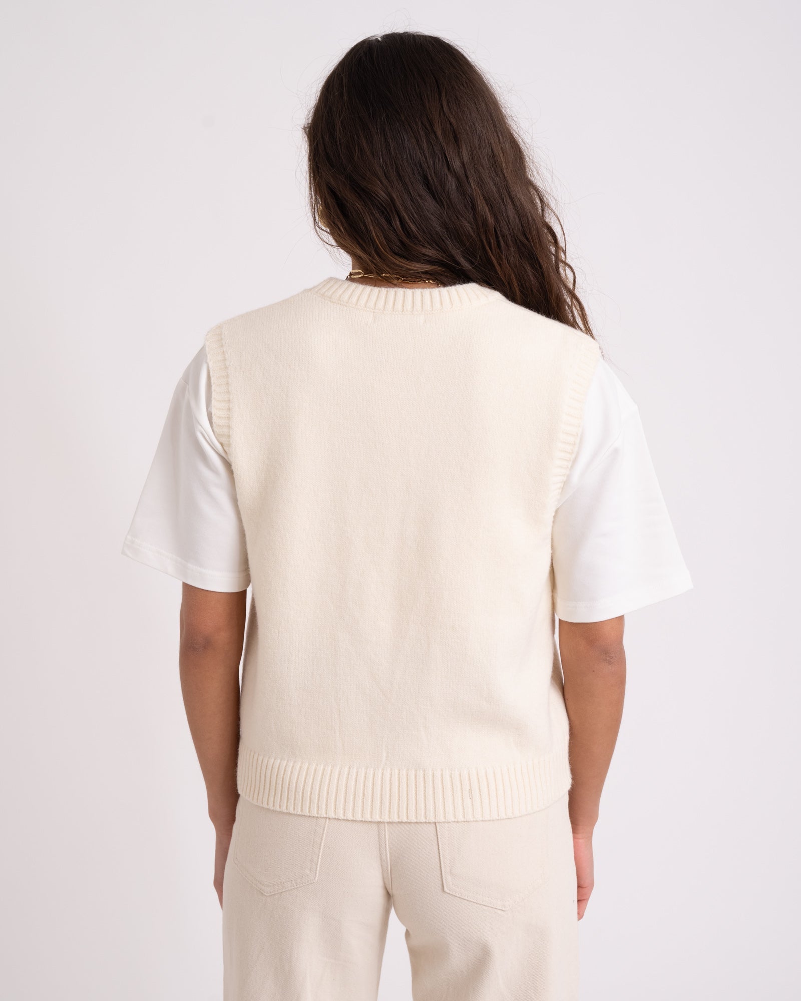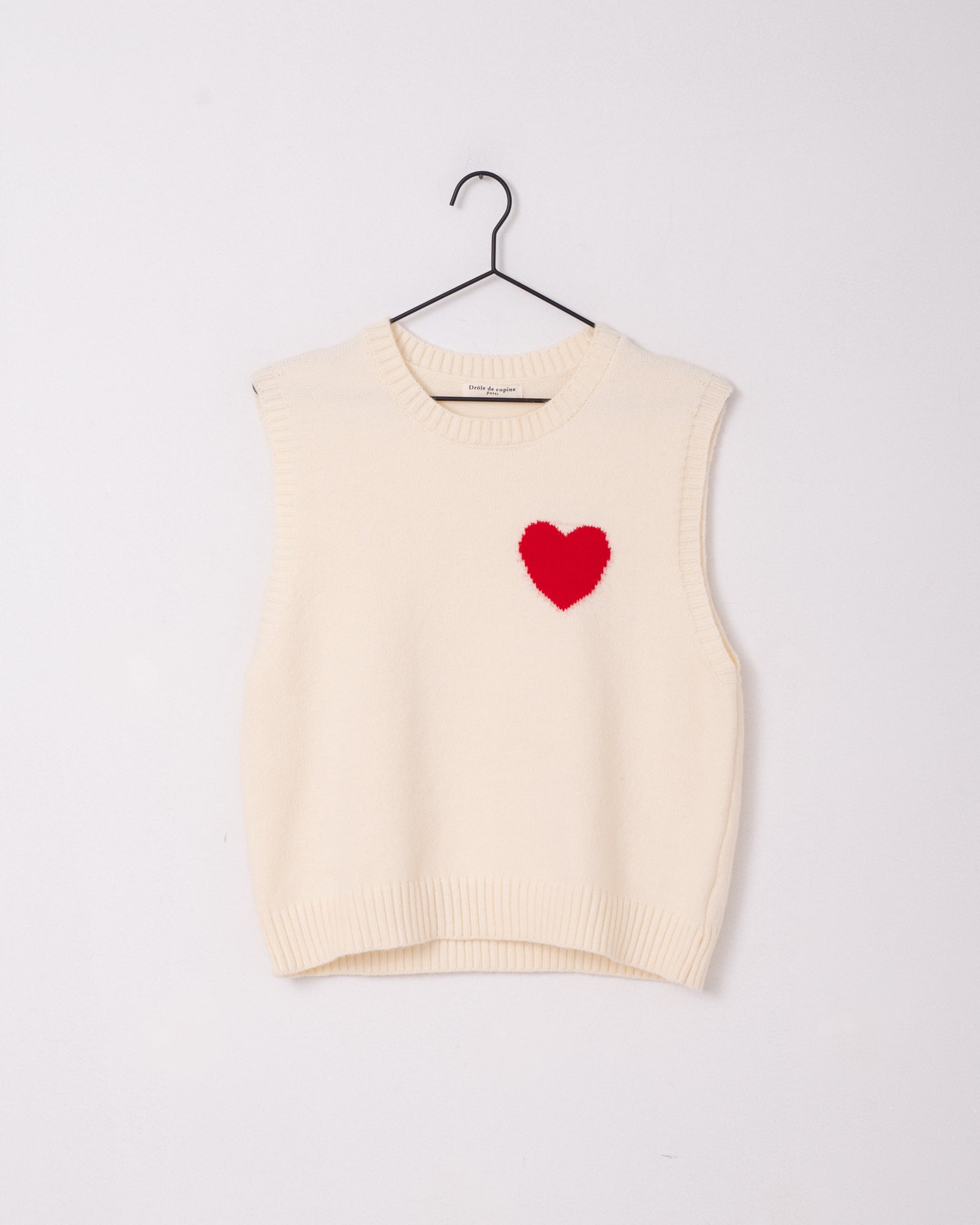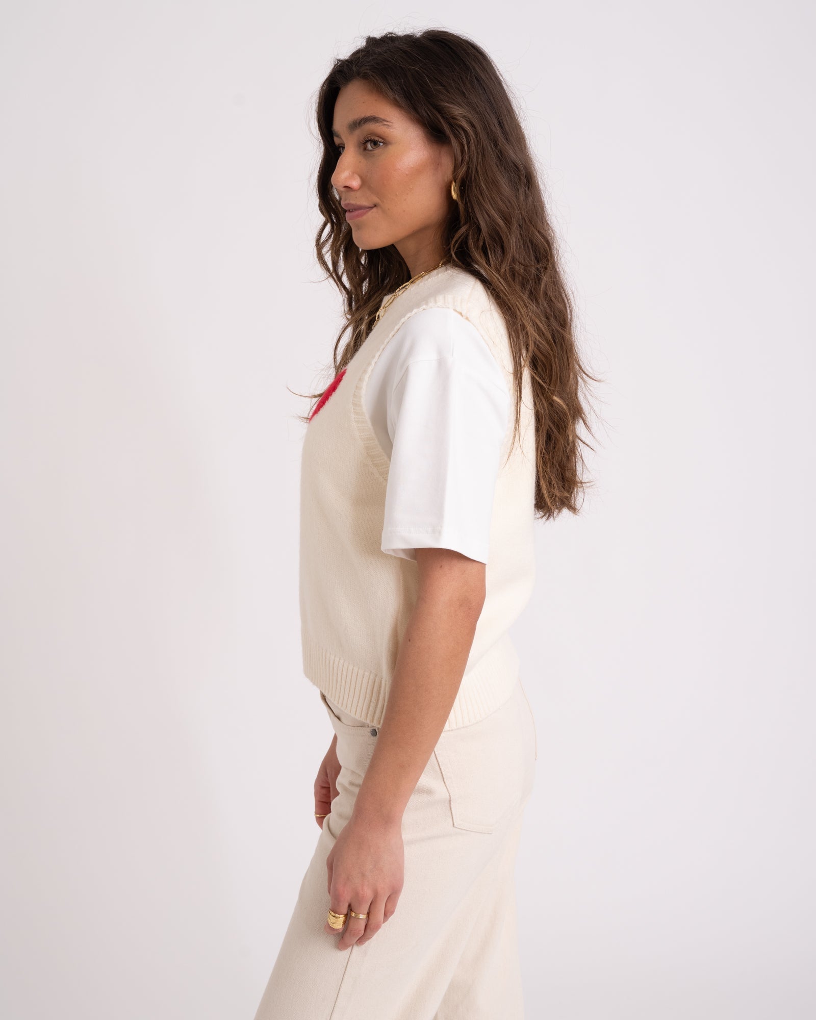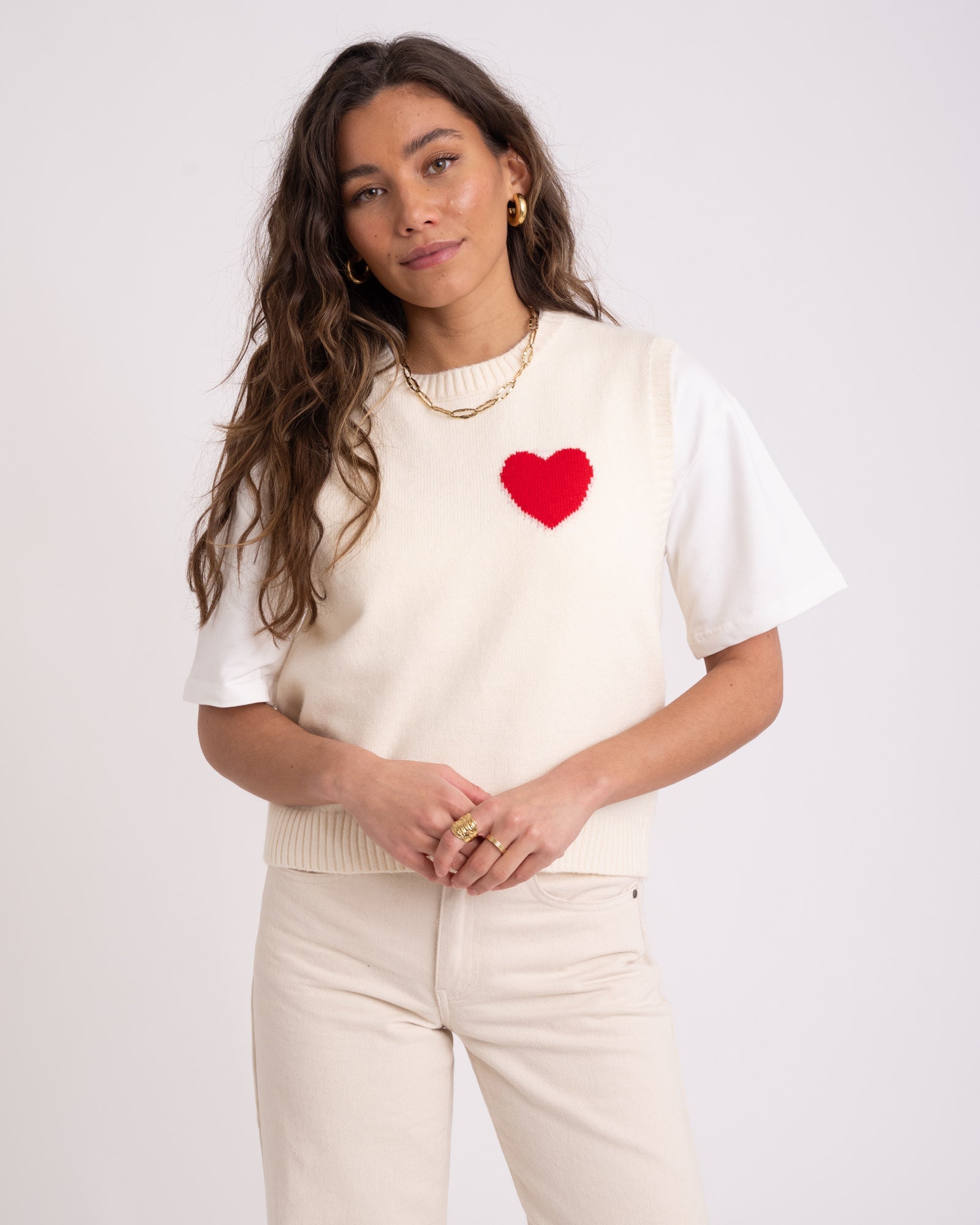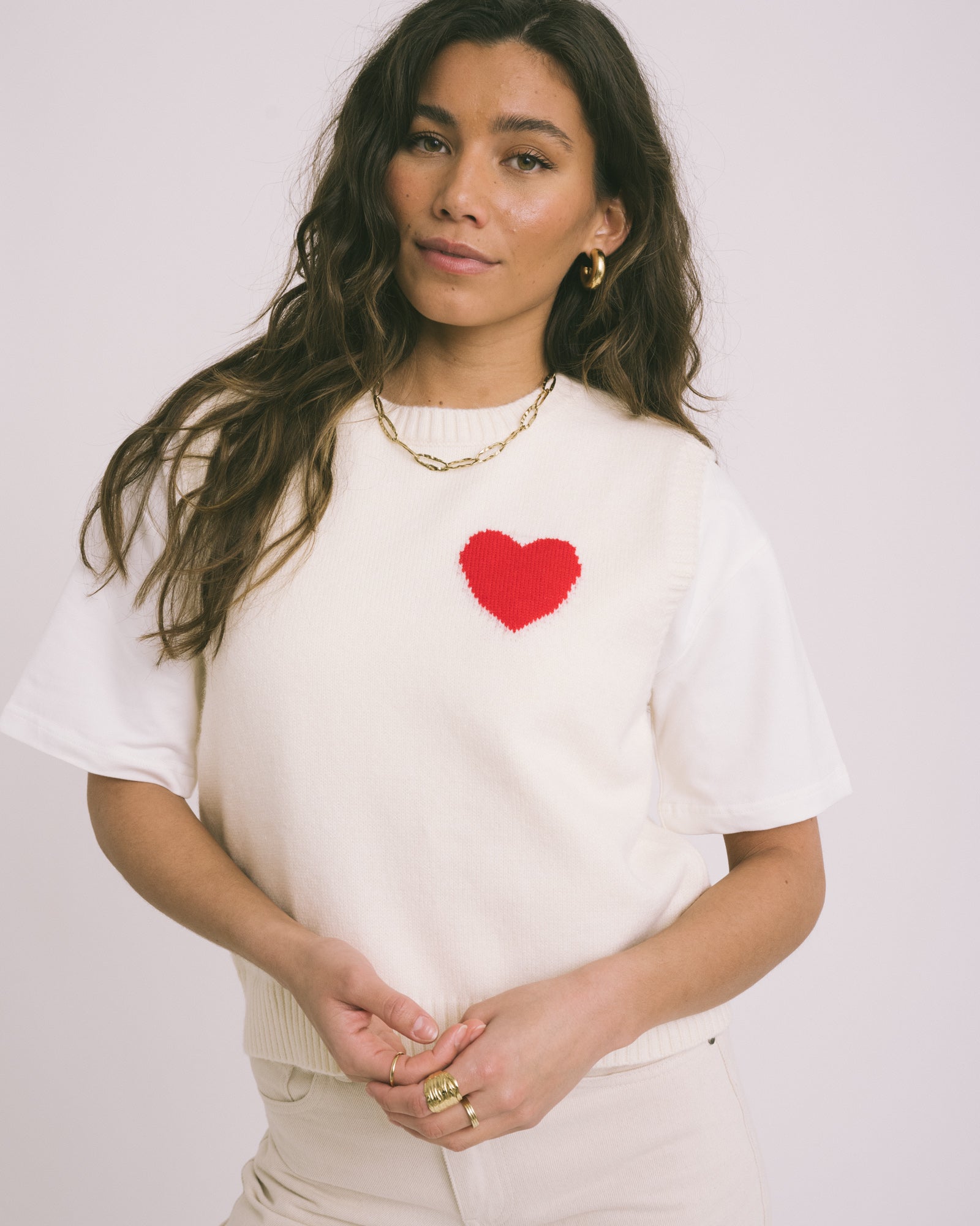 LIEBE! Ein gestrickter Spencer mit Herzdruck. Tragen Sie es als Oberteil oder in Kombination mit einem Basic-T-Shirt.