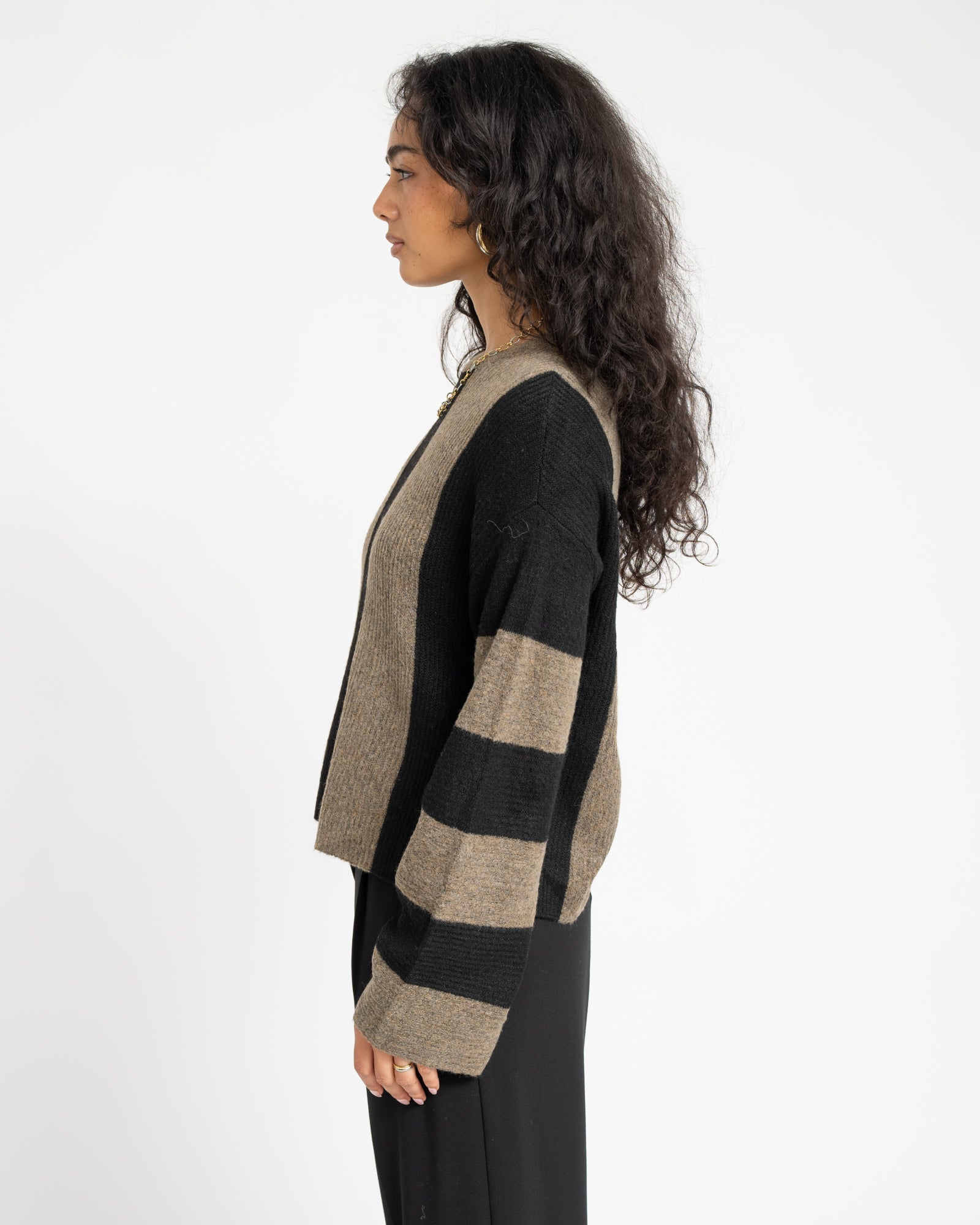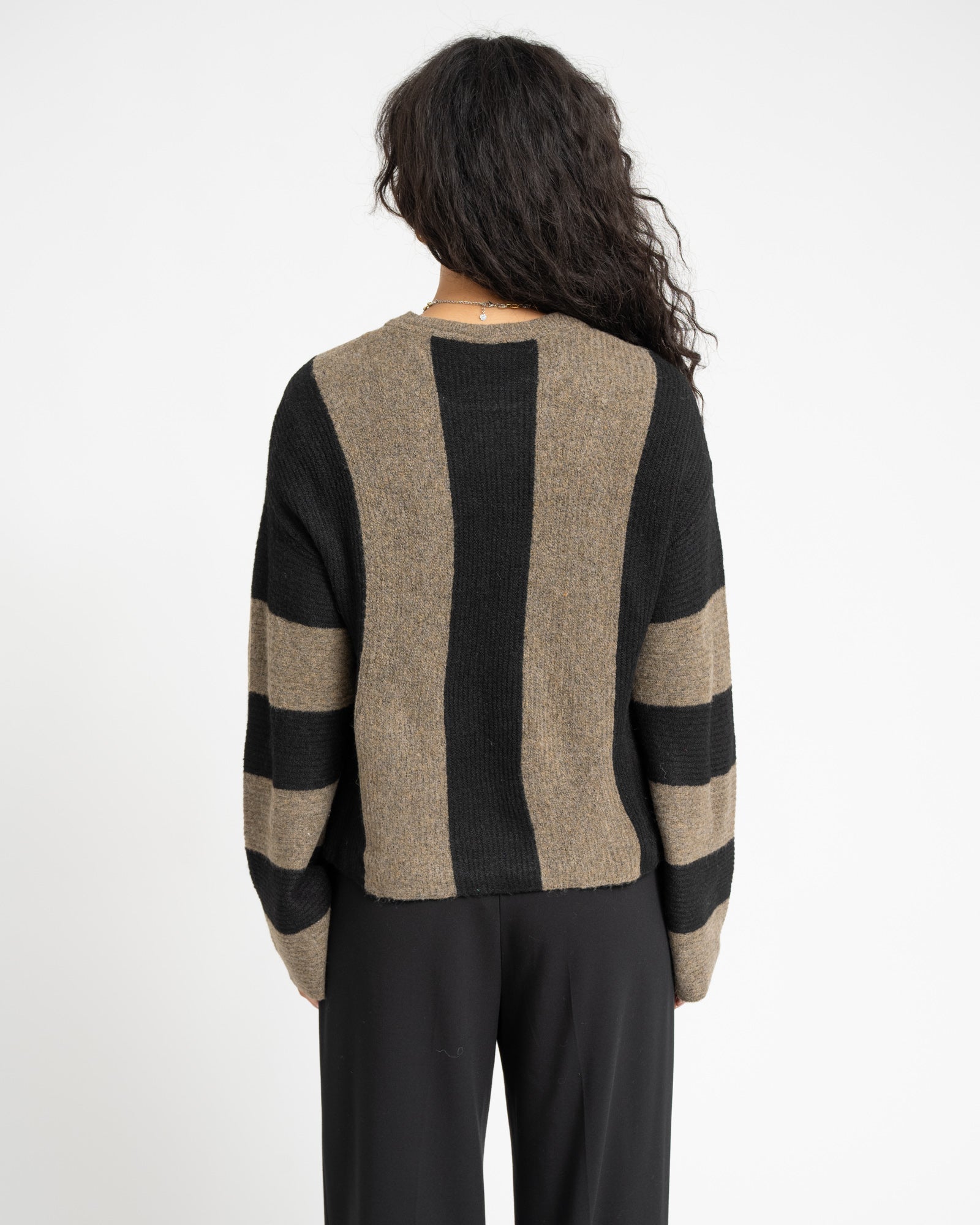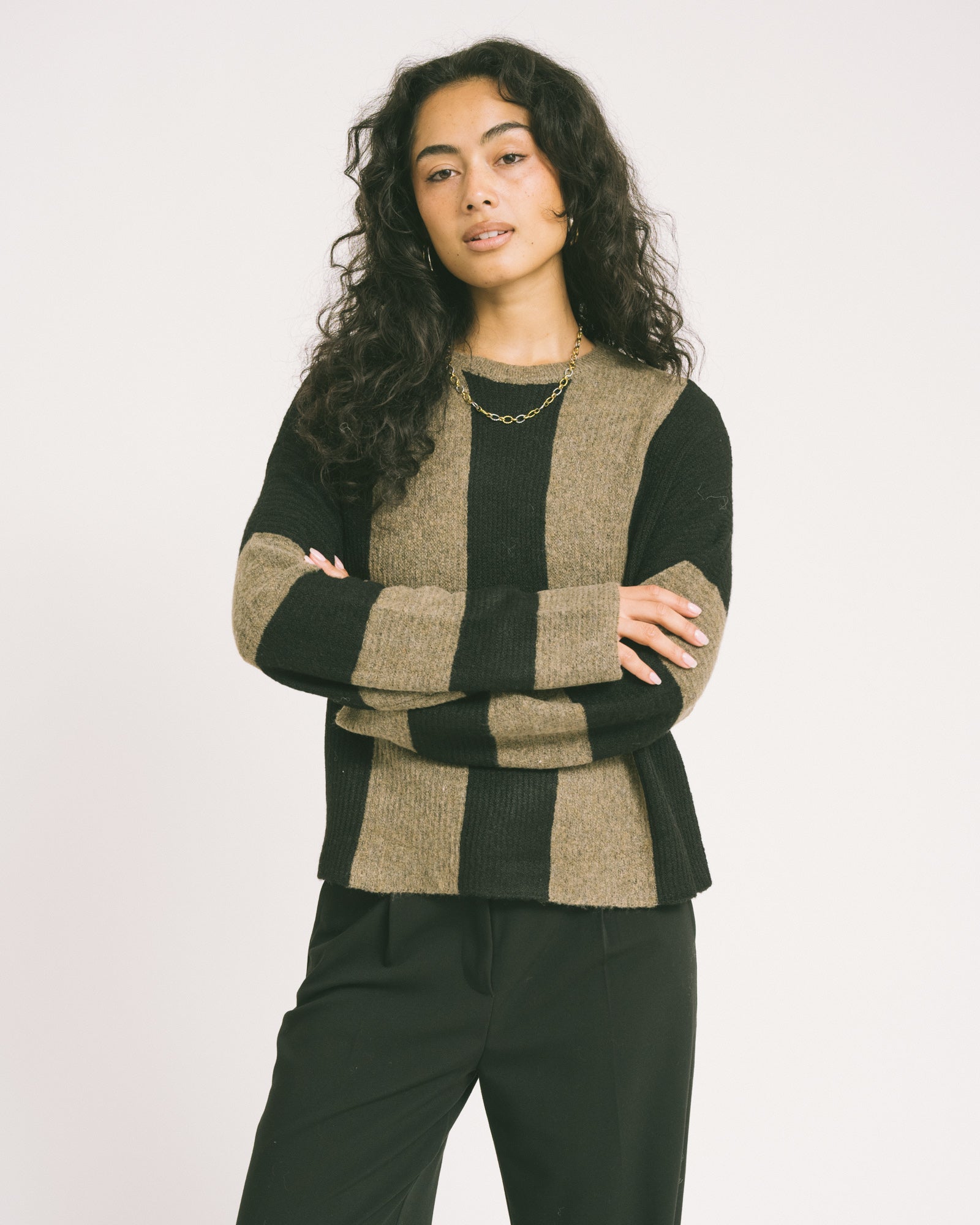 Der Agatha-Strick hat weite Ärmel, eine entspannte Passform und die perfekte Streifenkombination.