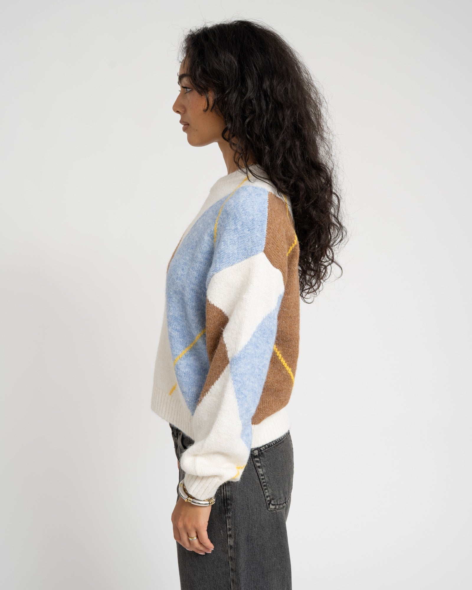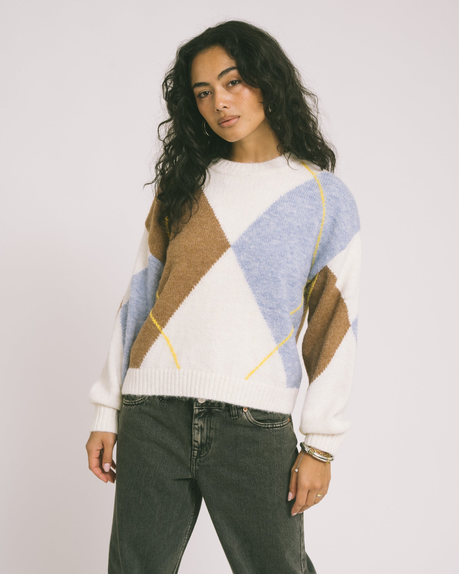 Der Armie-Strick ist weich, verspielt und bringt mit seinem übergroßen Argyle-Print in Braun, Blau, Gelb und Weiß Farbe.