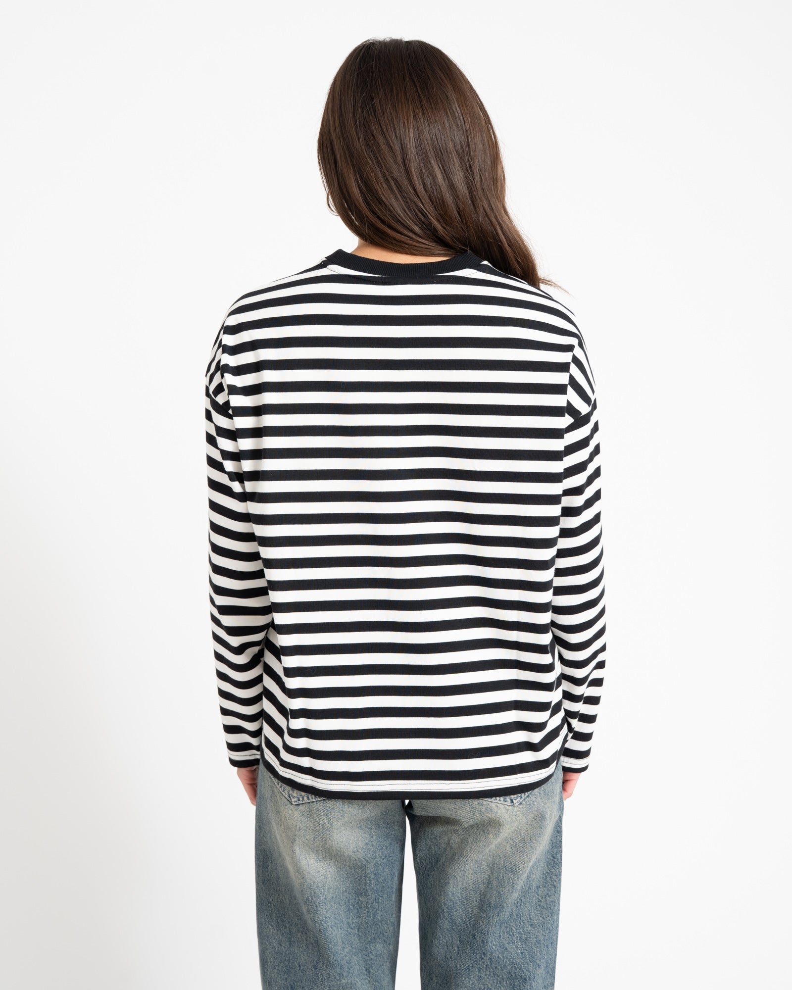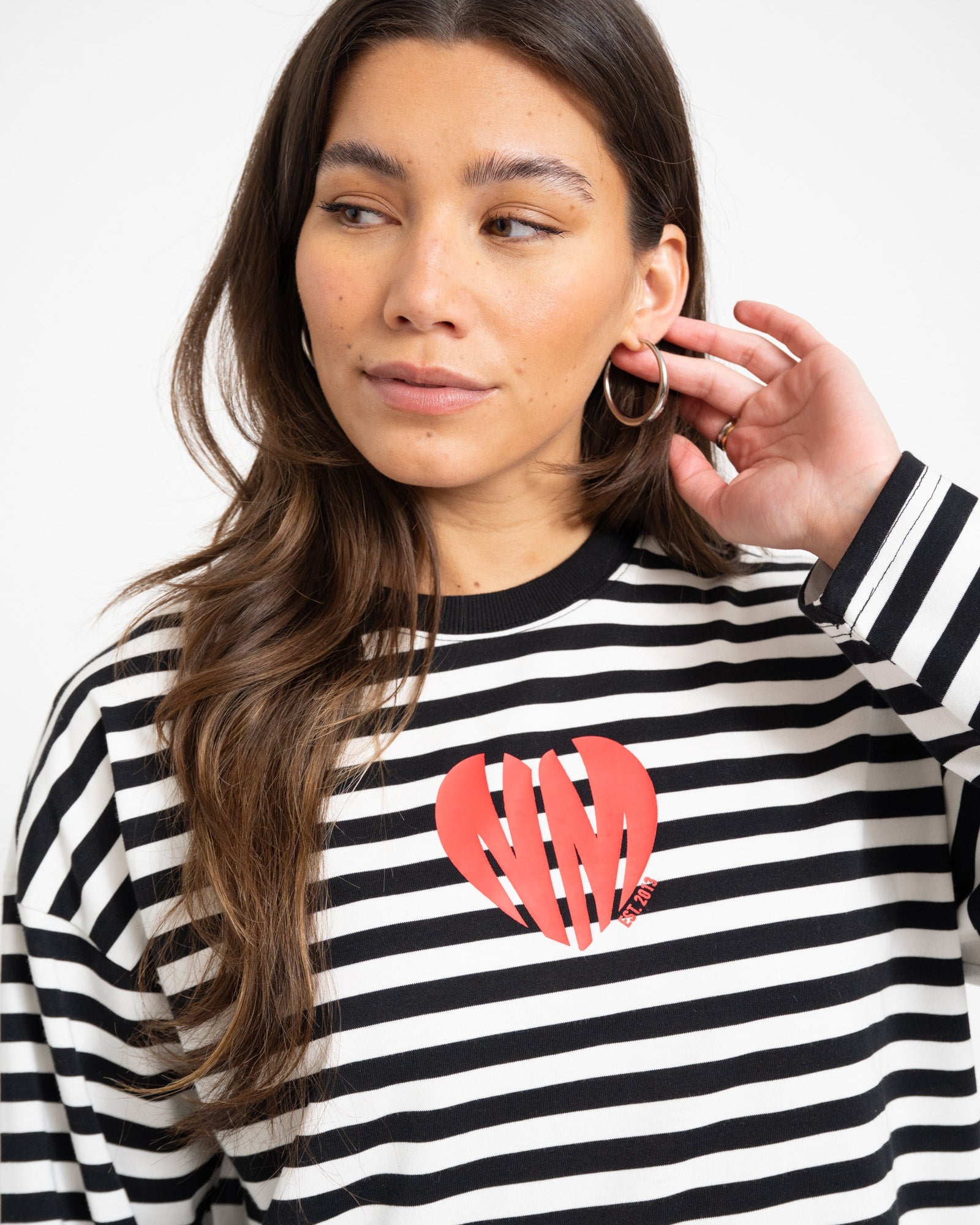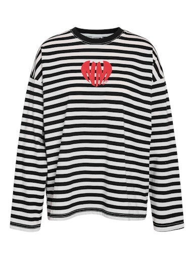 Niedlich und doch mit dem gewissen Etwas 🖤 Dieses gestreifte Oversize-Shirt mit Rundhalsausschnitt besticht durch zarte Streifen und einen verspielten Herzprint auf der Vorderseite. Perfekt für den Valentinstag, aber auch für jeden anderen Tag ein echter Hingucker.