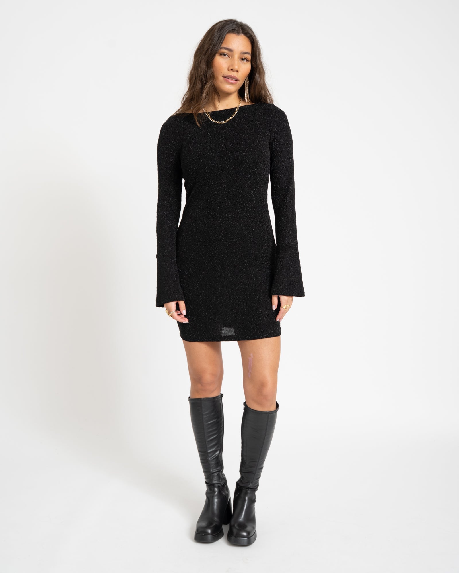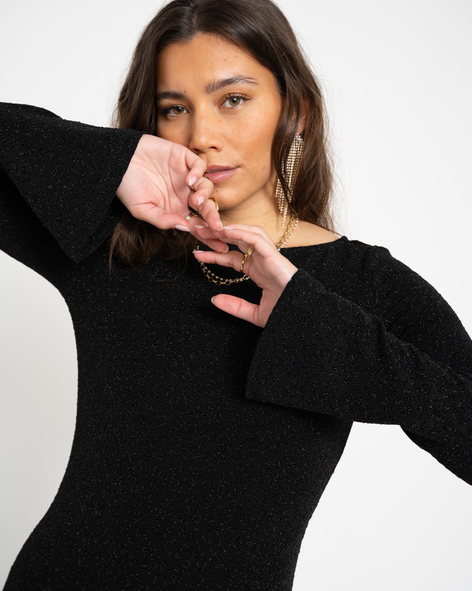 Schlicht und doch umwerfend. Dieses schwarze Minikleid mit dezentem Glitzer und ausgestellten Ärmeln ist die perfekte Wahl für jede Partynacht.