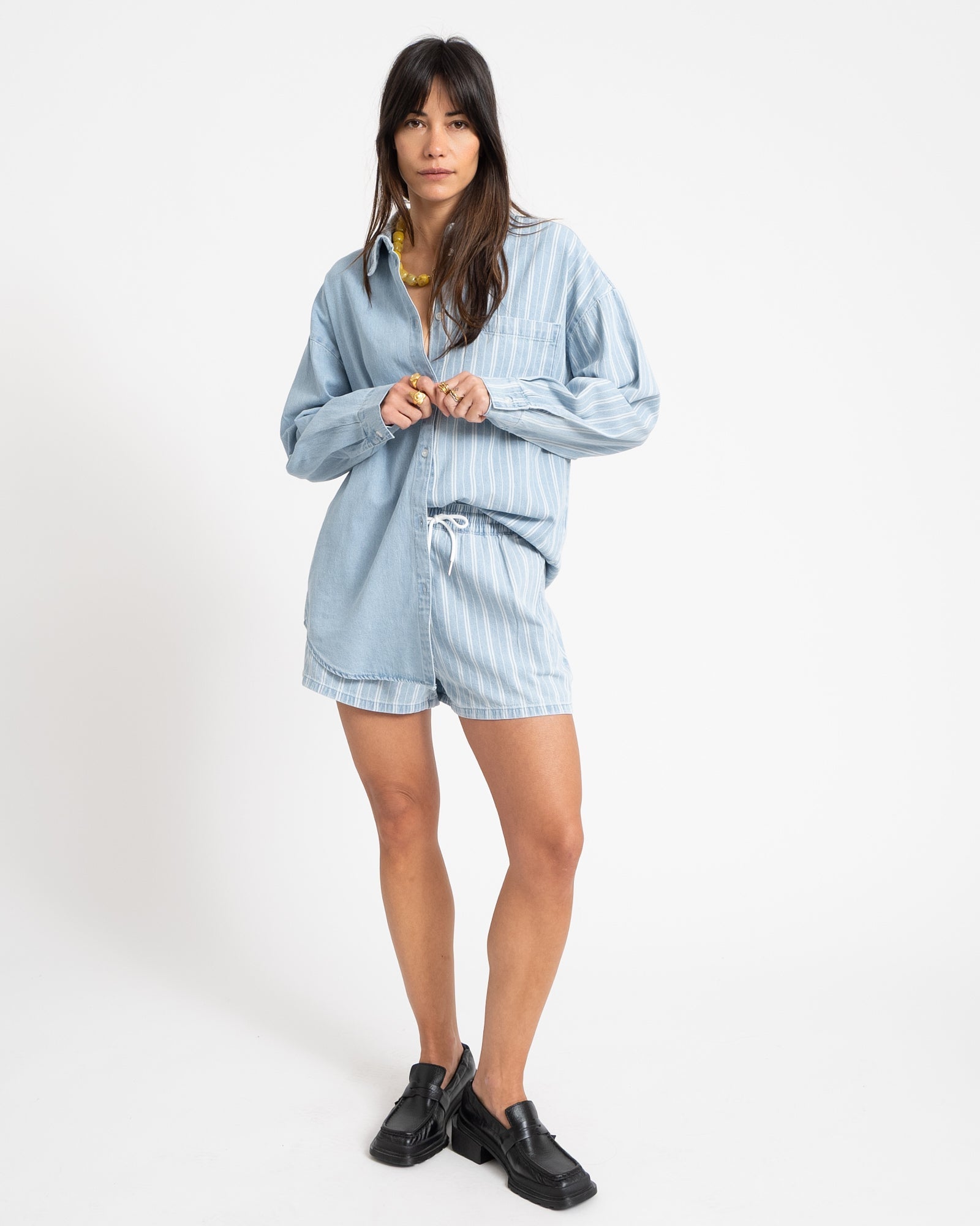 Luchtige denim short met een elastische tailleband en een casual uitstraling. De strepen geven de short een speelse look. Combineer met het bijpassende overhemd voor een complete set.