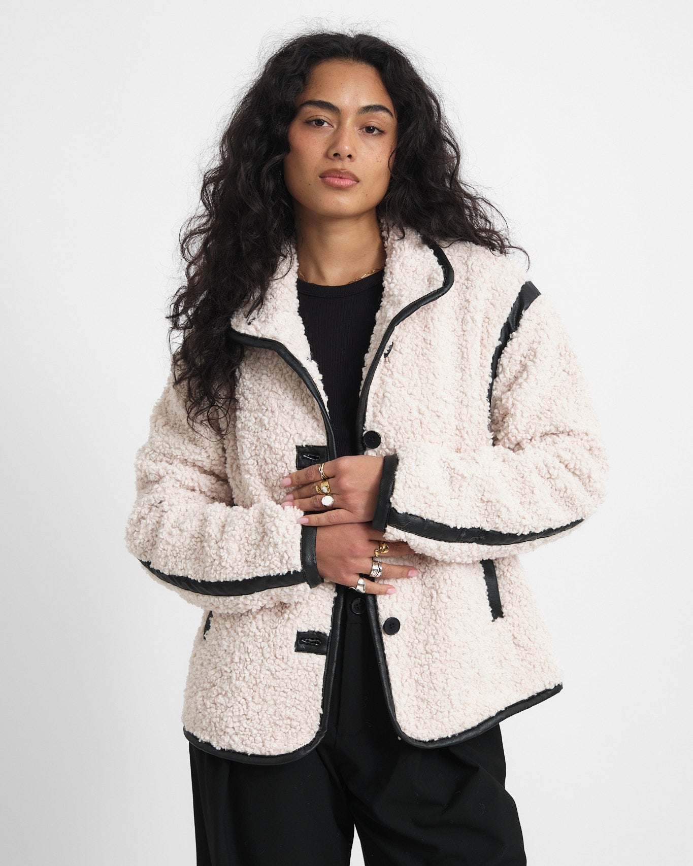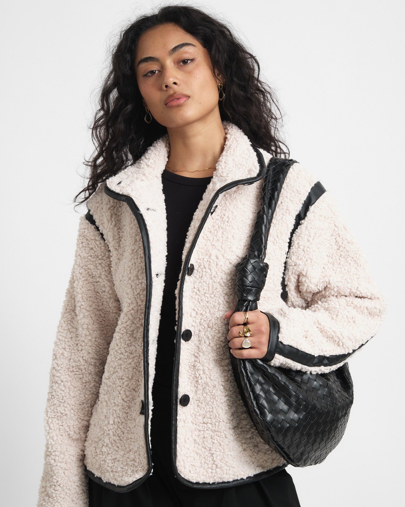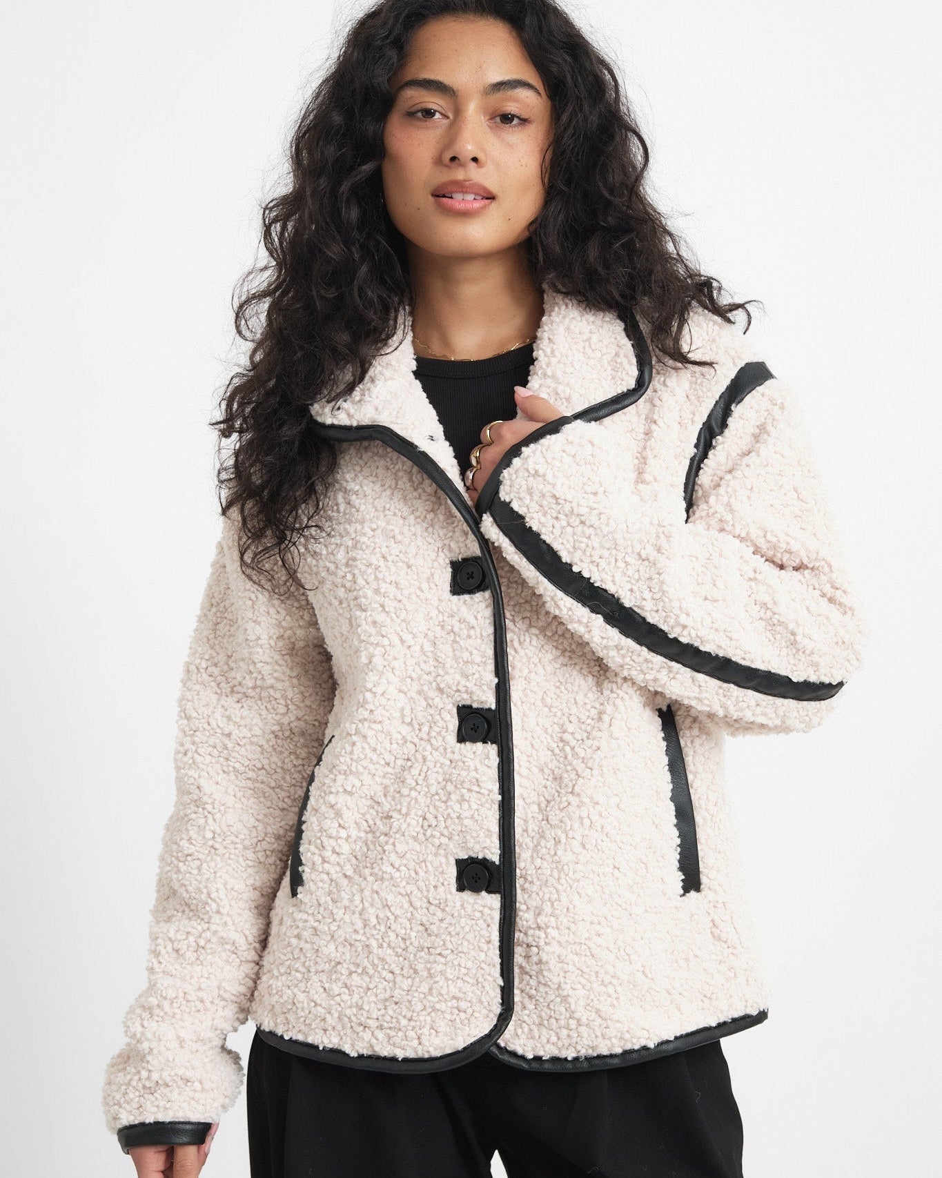 Diese Teddyjacke ist das perfekte Beispiel dafür, wie man sich warm hält, ohne auf Stil zu verzichten. Der flauschige, cremefarbene Teddystoff fühlt sich superweich an, während die schwarzen Lederdetails und Knöpfe der Jacke einen markanten, strukturierten Look verleihen.