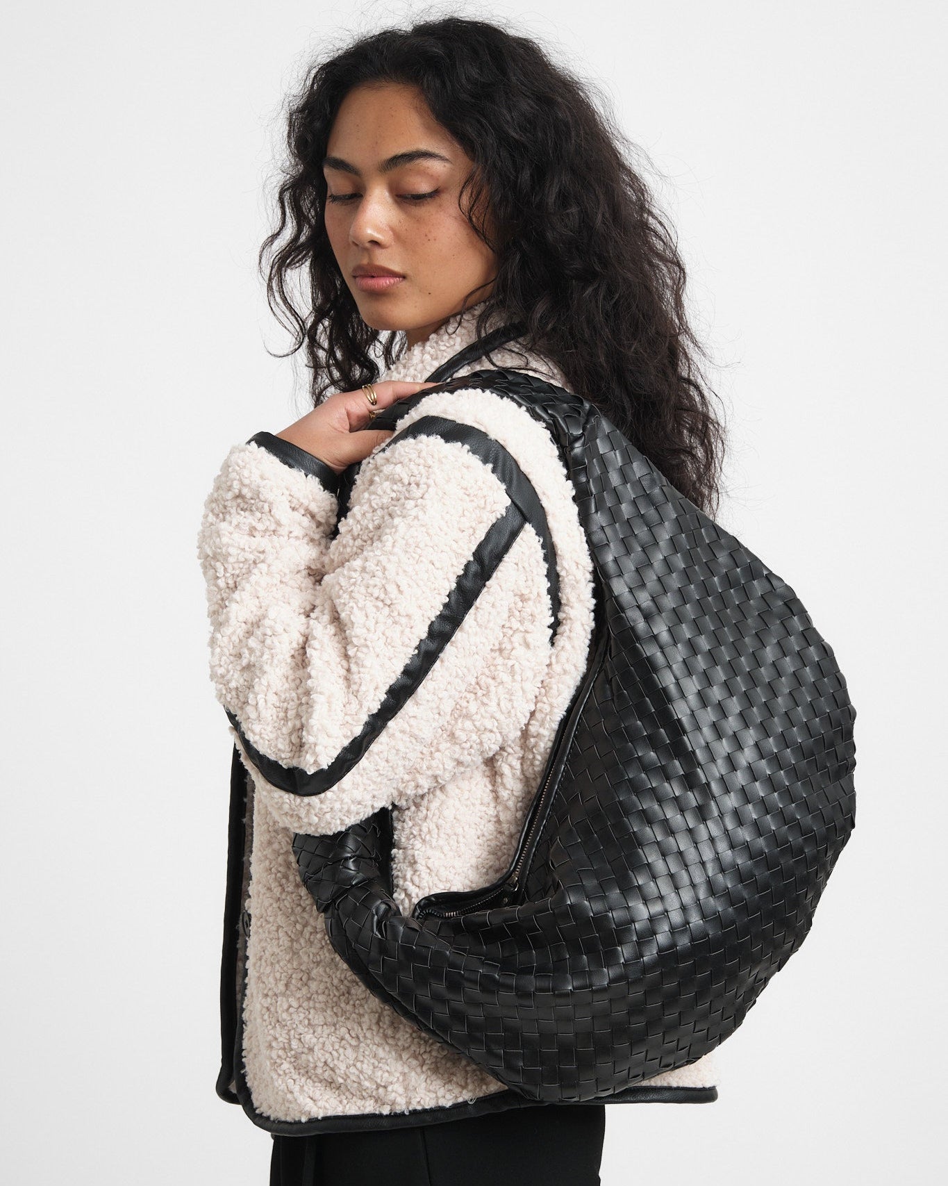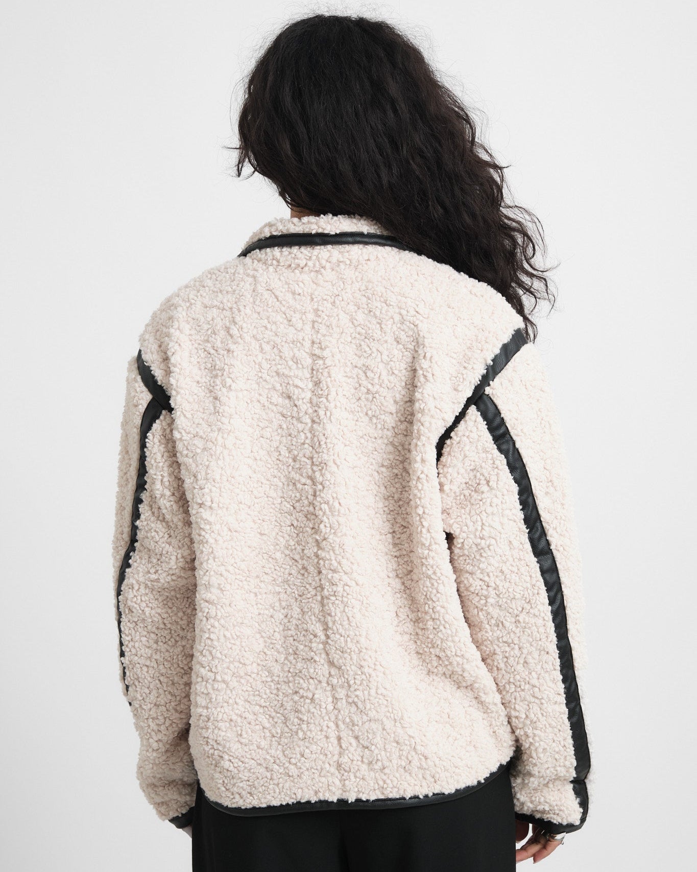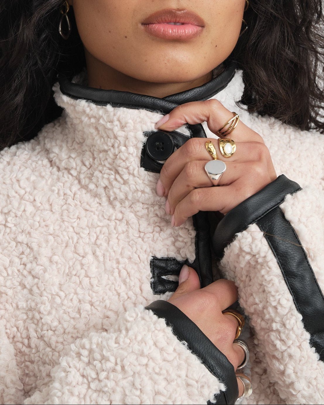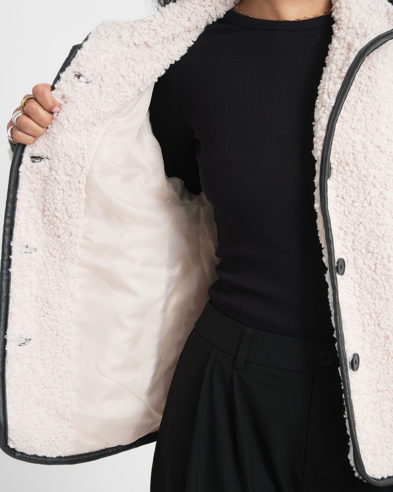 Diese Teddyjacke ist das perfekte Beispiel dafür, wie man sich warm hält, ohne auf Stil zu verzichten. Der flauschige, cremefarbene Teddystoff fühlt sich superweich an, während die schwarzen Lederdetails und Knöpfe der Jacke einen markanten, strukturierten Look verleihen.