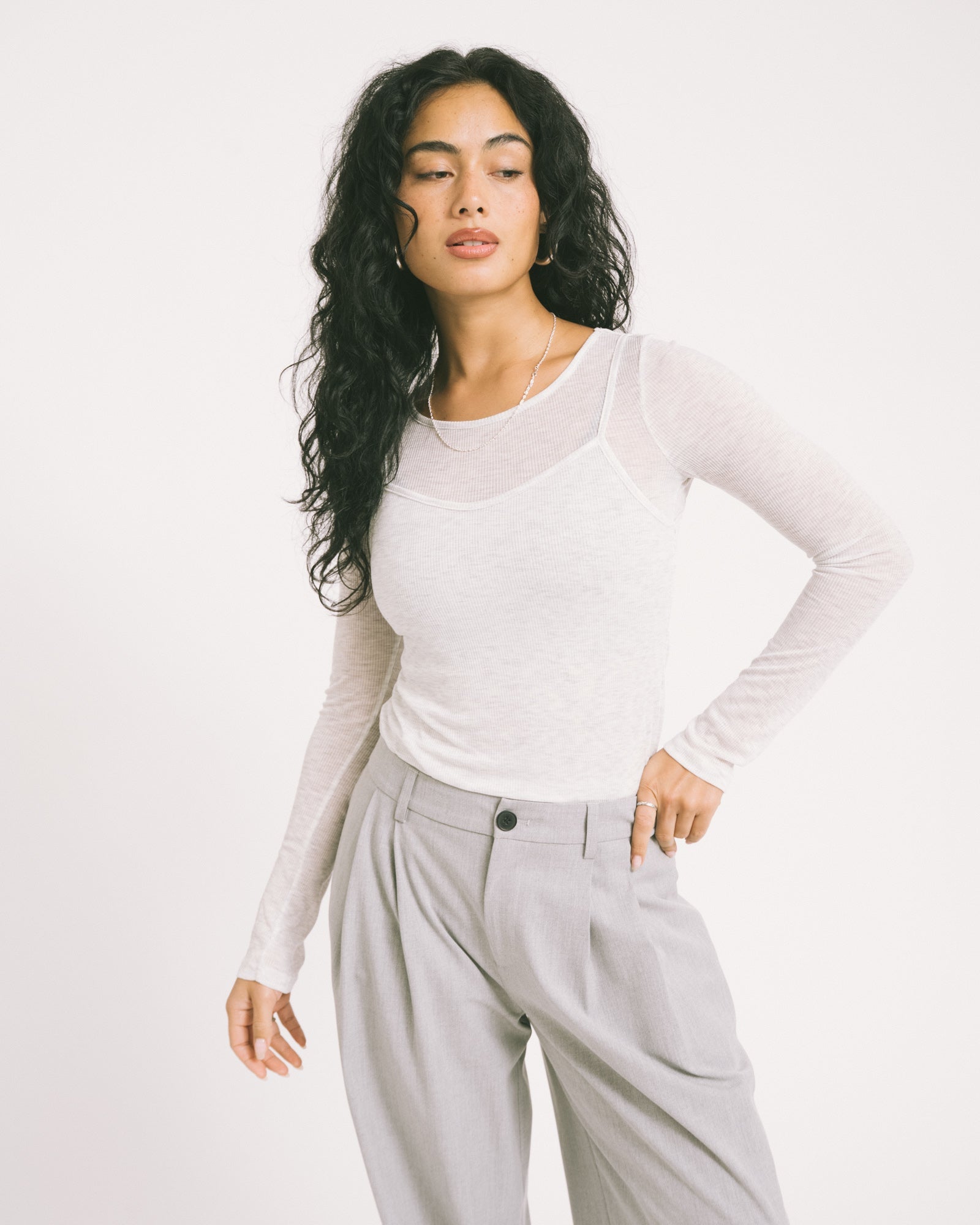 Schlicht und doch raffiniert. Das Nusa Double Layer Top ist ein minimalistisches Top mit einem dezenten Lagenlook, der für zusätzliche Tiefe sorgt. Das leichte, weiche Material und die schmale Passform machen es zum perfekten Alltagsbegleiter mit dem gewissen Etwas.
