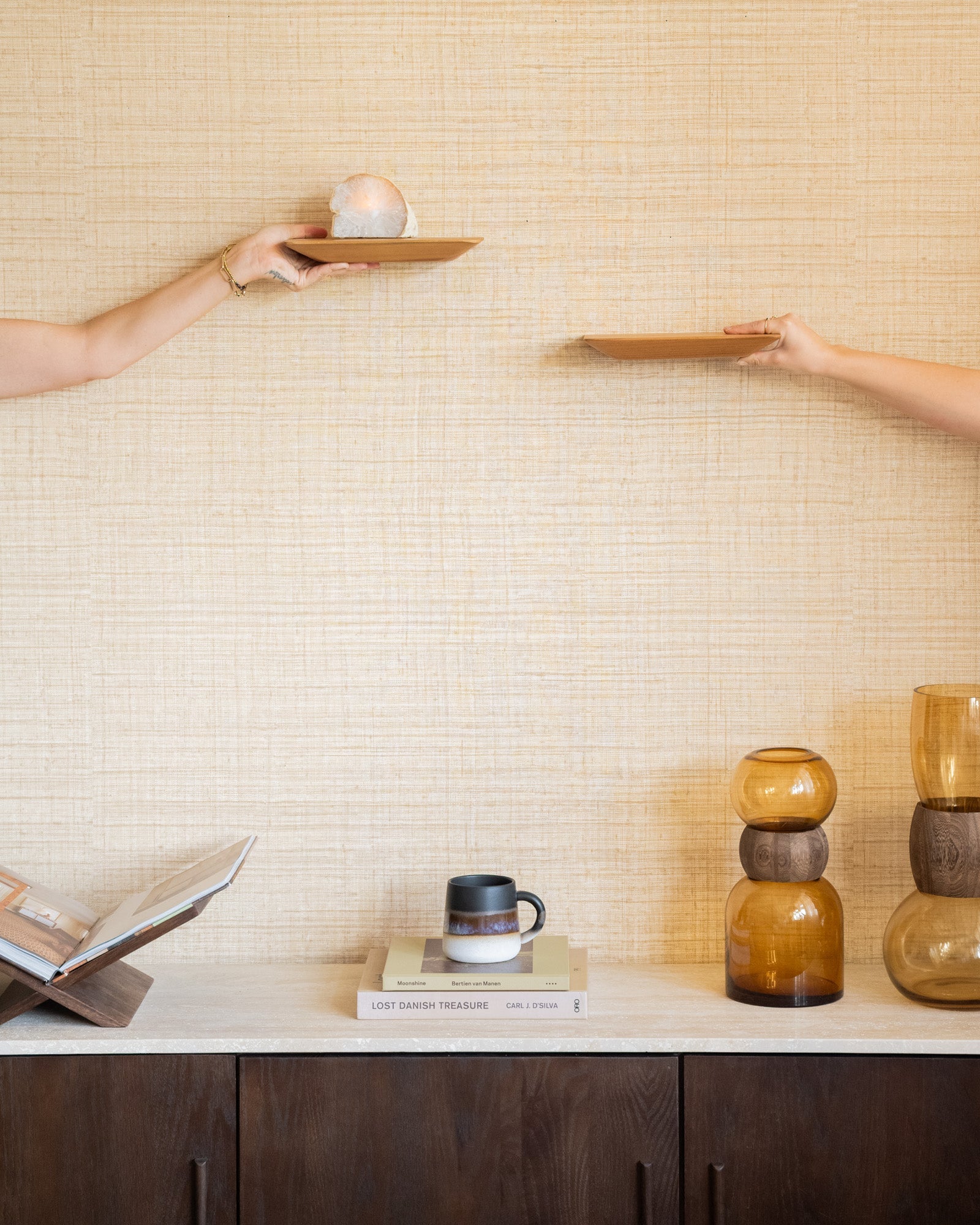 Perfekt neben Ihrem Bett als kleiner Nachttisch zum Aufladen Ihres Telefons. Sieht auch in jeder Küche, jedem Wohnzimmer oder Flur gut aus. Das Aufhängesystem ist unsichtbar, so dass die Regale zu schweben scheinen.
