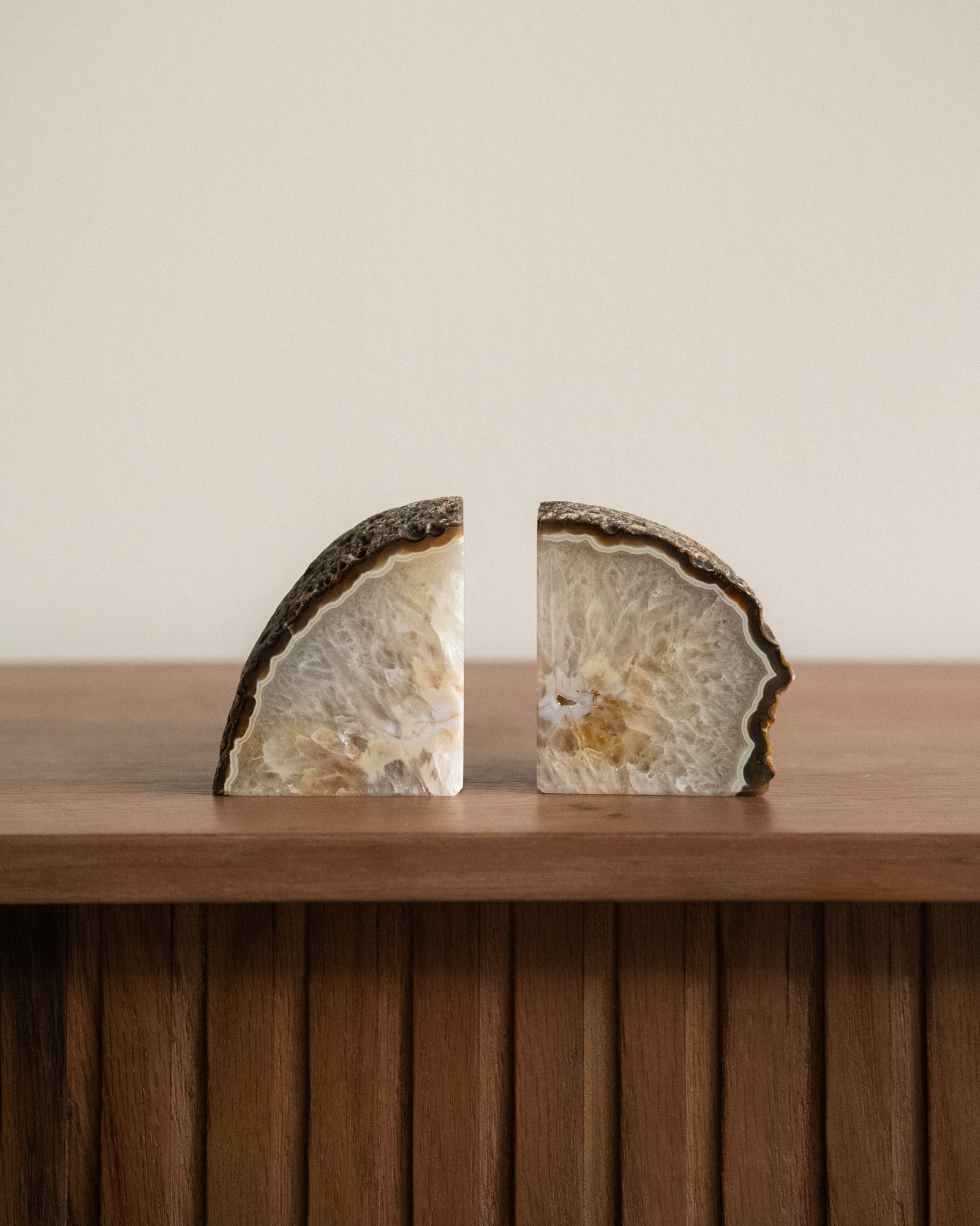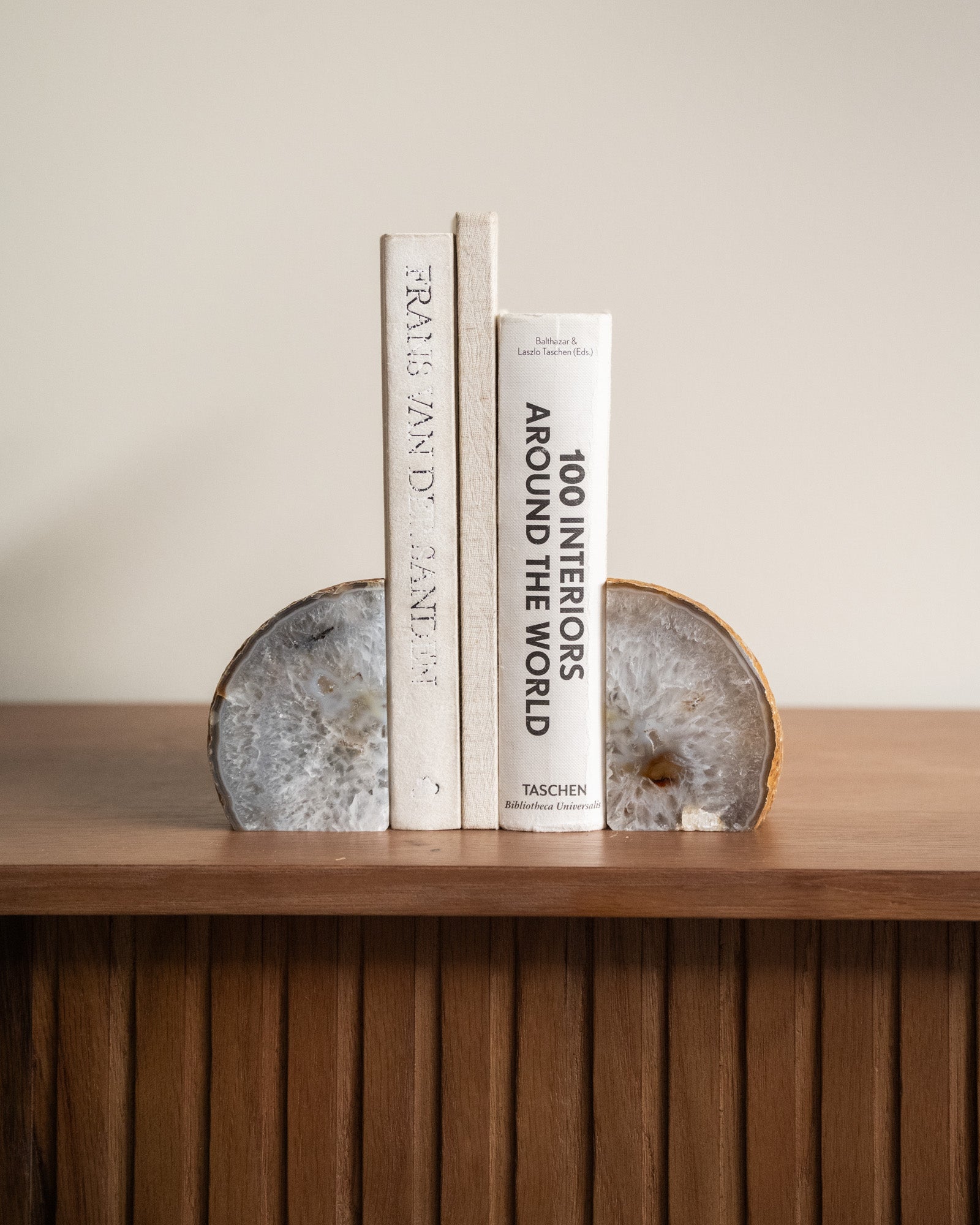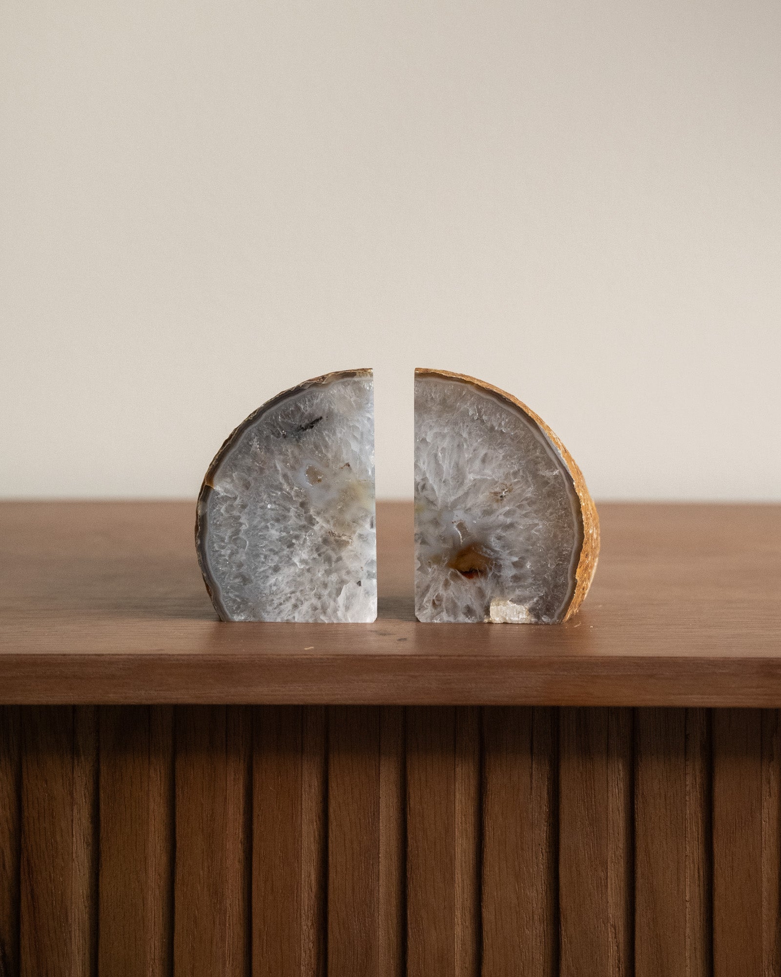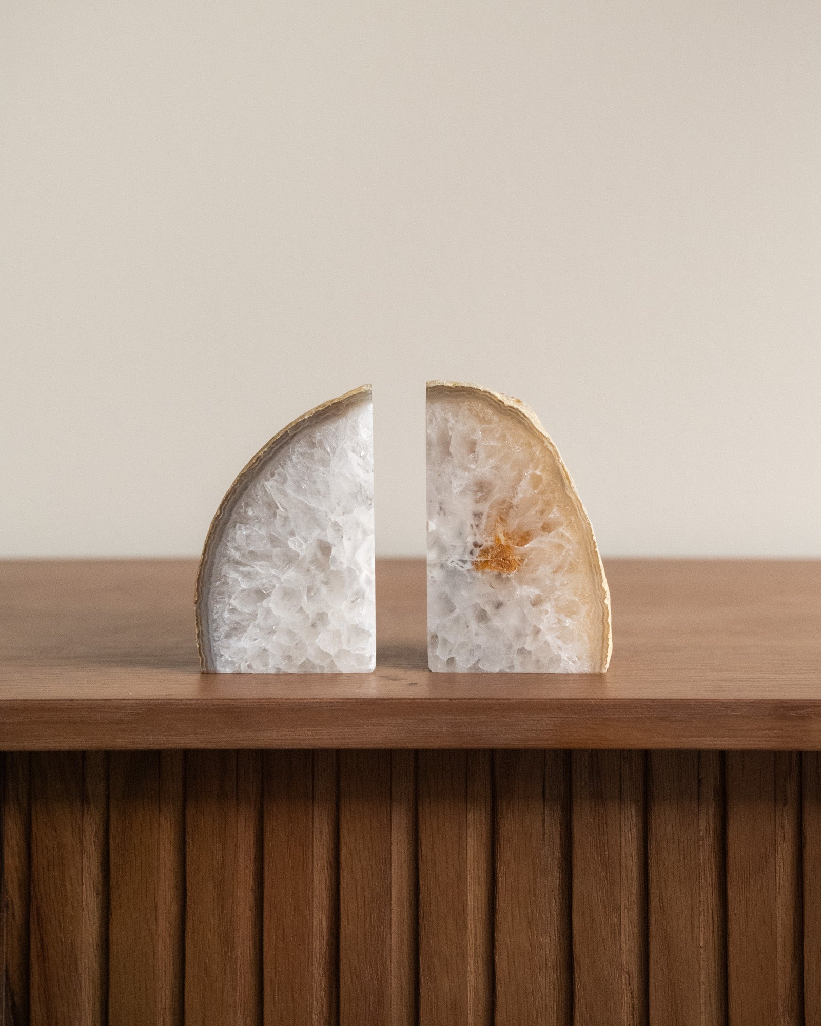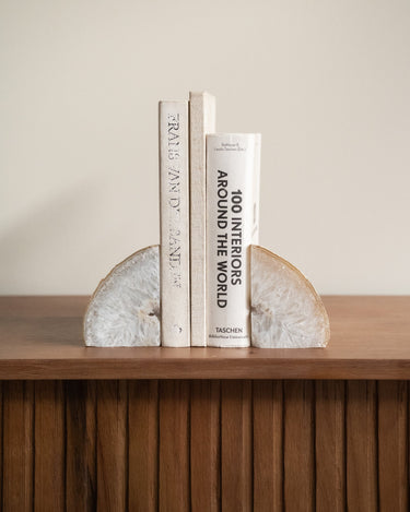 Diese einzigartigen Buchstützen bestehen aus natürlichem Achat. Achat hat eine schützende und erdende Wirkung. Da es sich um einen Naturstein handelt, ist jedes Stück ein Unikat.