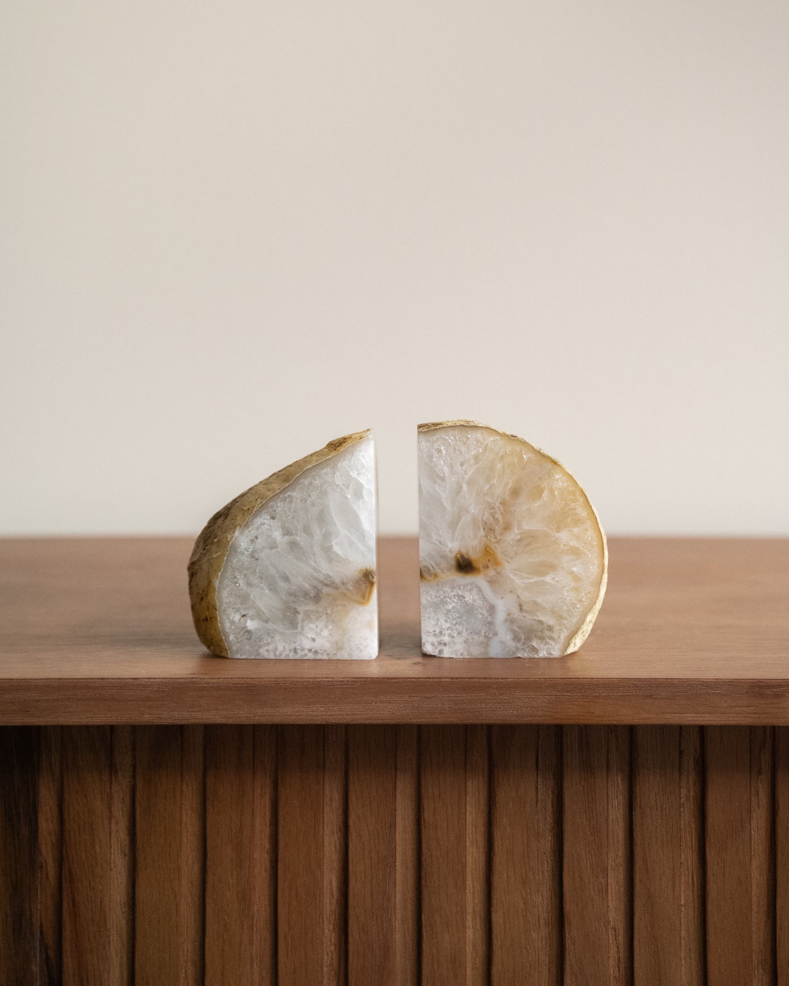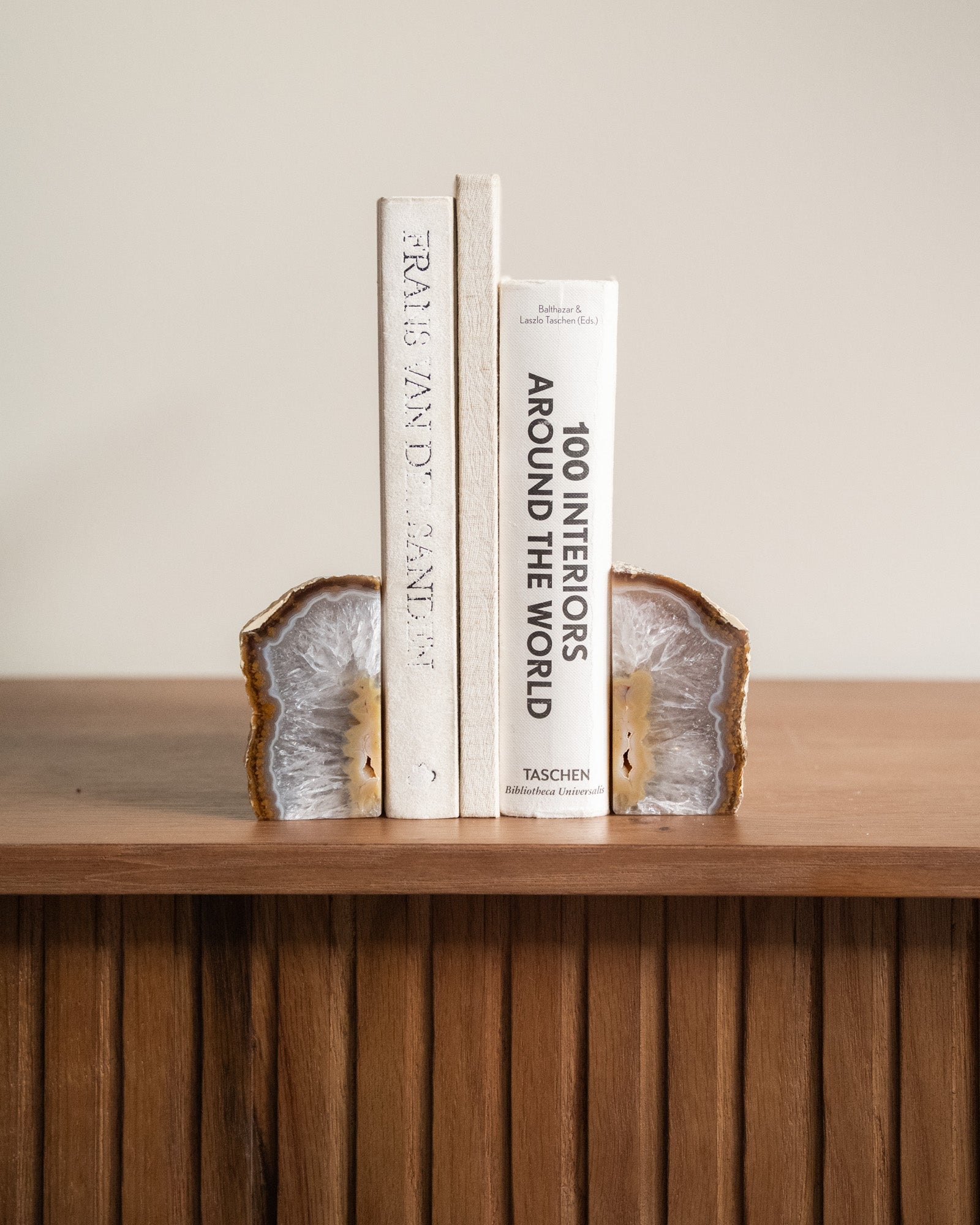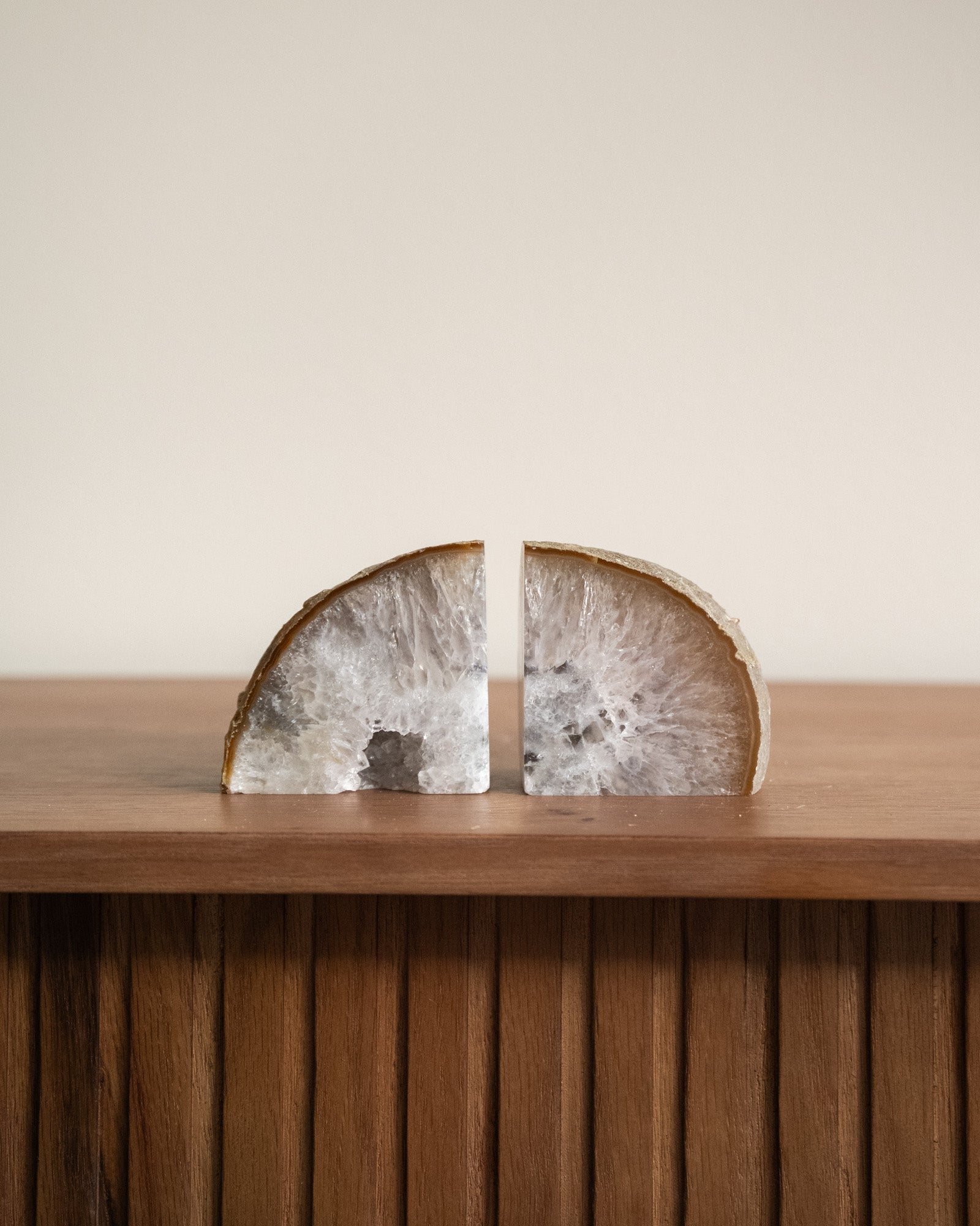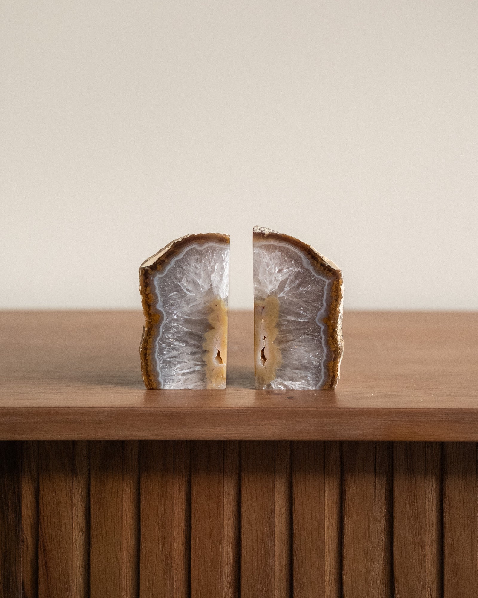 Diese einzigartigen Buchstützen bestehen aus natürlichem Achat. Achat hat eine schützende und erdende Wirkung. Da es sich um einen Naturstein handelt, ist jedes Stück ein Unikat.
