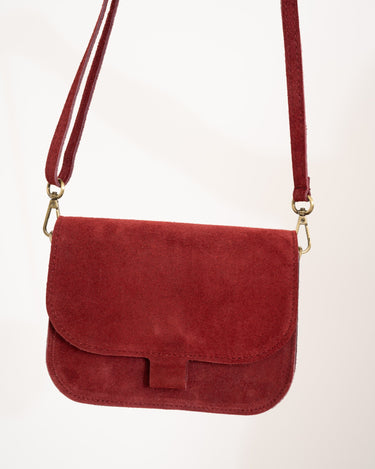 Umhängetasche aus Wildleder mit Magnetverschluss und langem, verstellbarem Riemen.