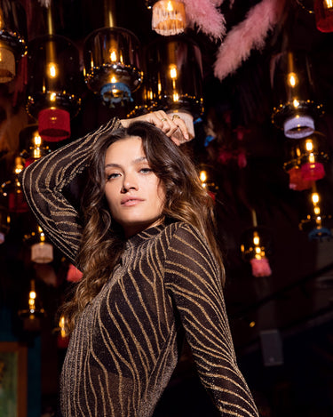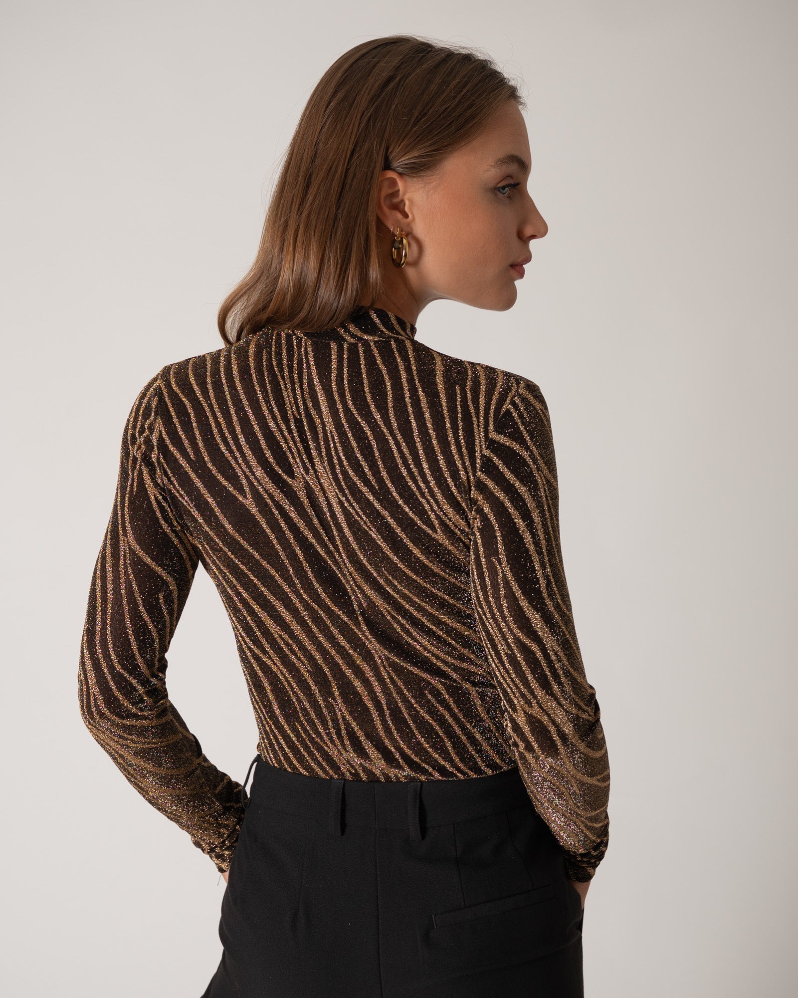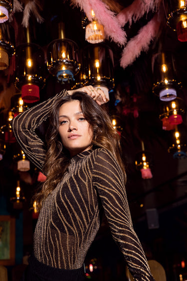 Strahle in diesem glitzernden Zebra-Mesh-Body! Kombiniere das etwas durchscheinende Oberteil mit einem schönen Bralette.
