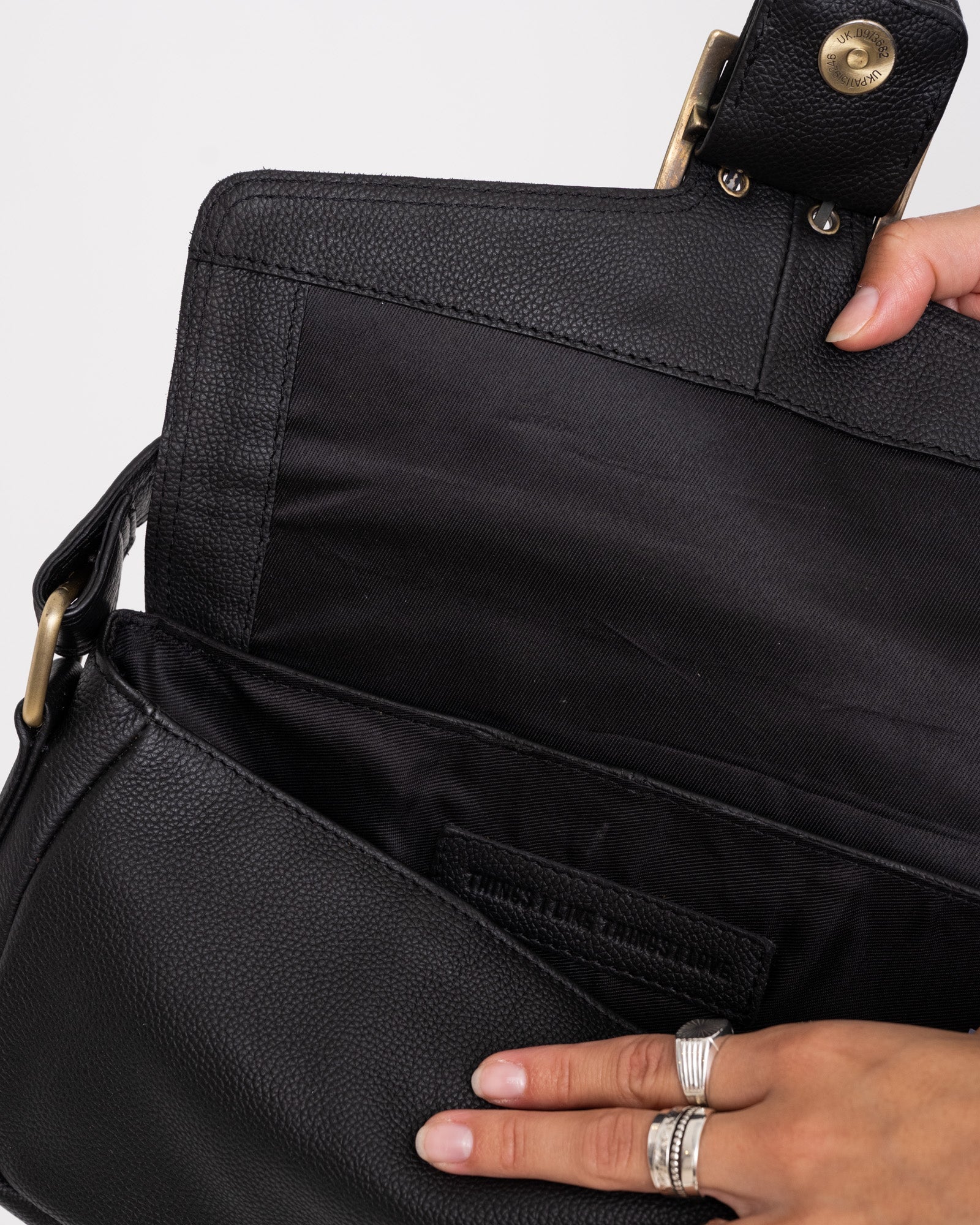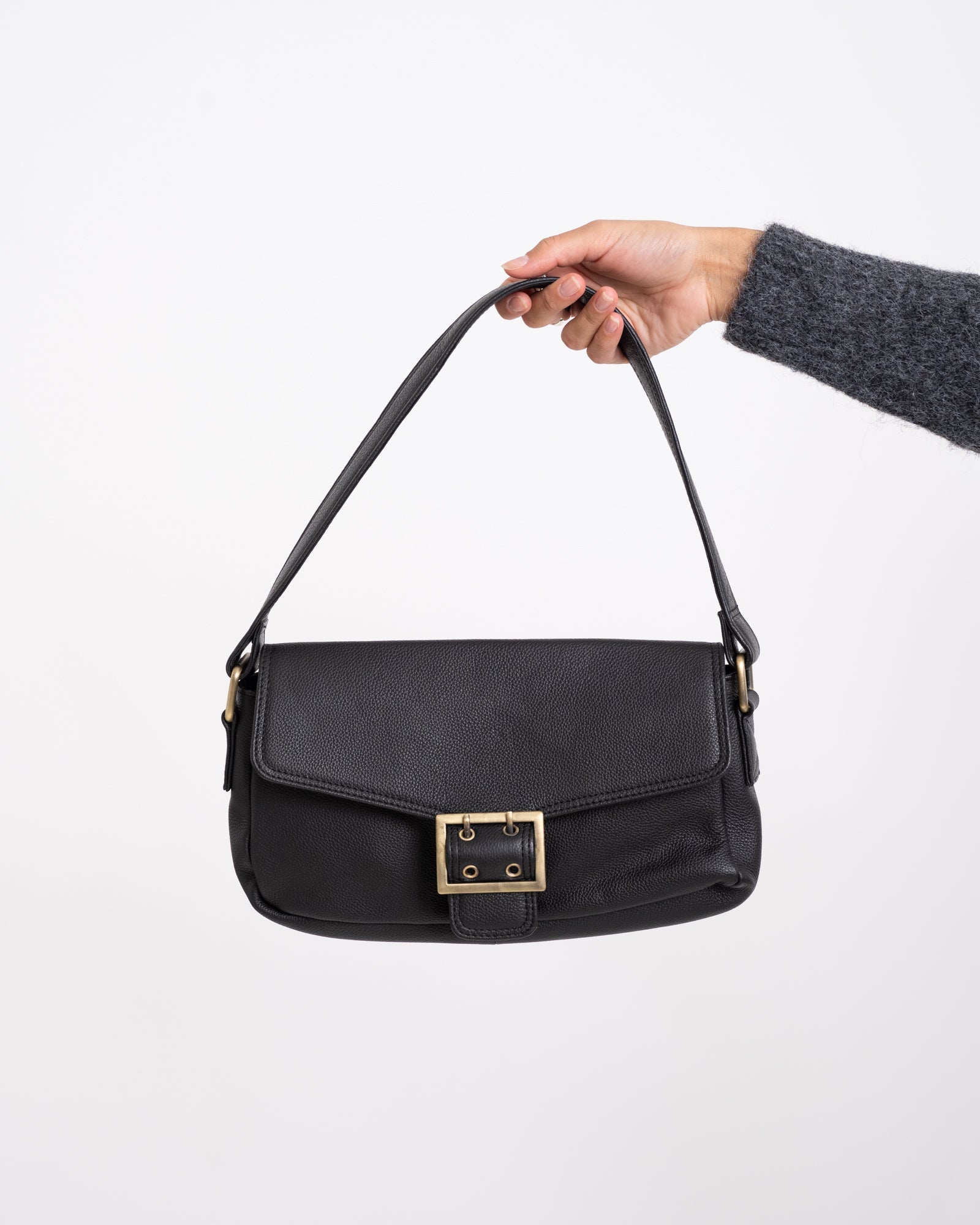 Die perfekte Partytasche, mit großer Schnalle mit Magnetverschluss auf der Vorderseite. Die Hardware der Tasche ist goldfarben und sie hat 1 kurzen Griff.