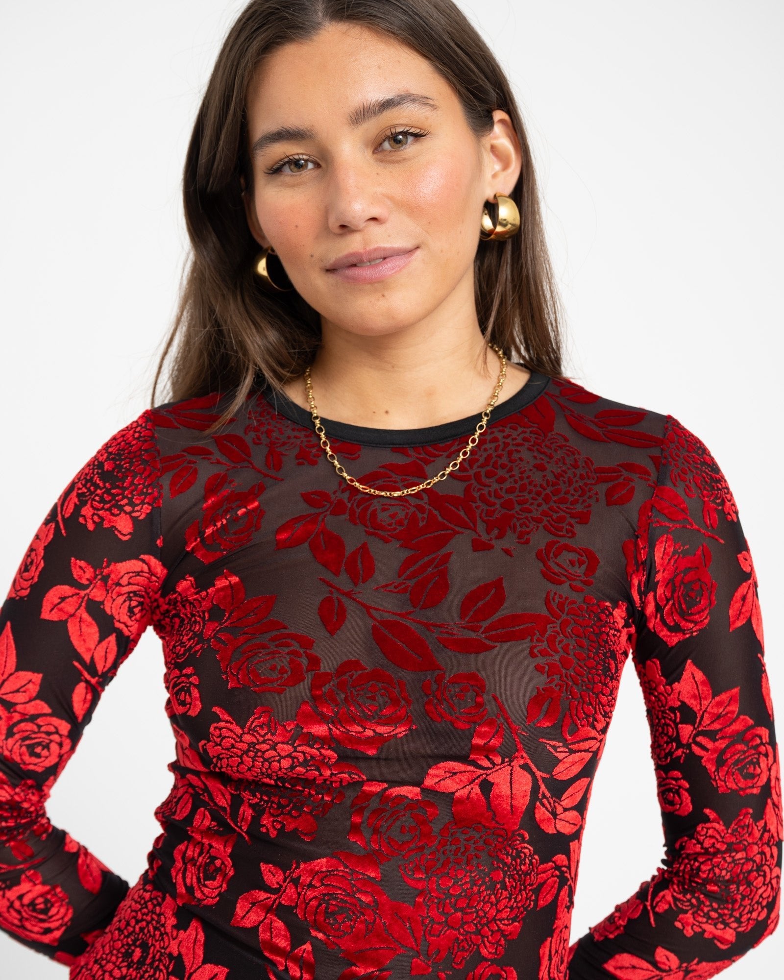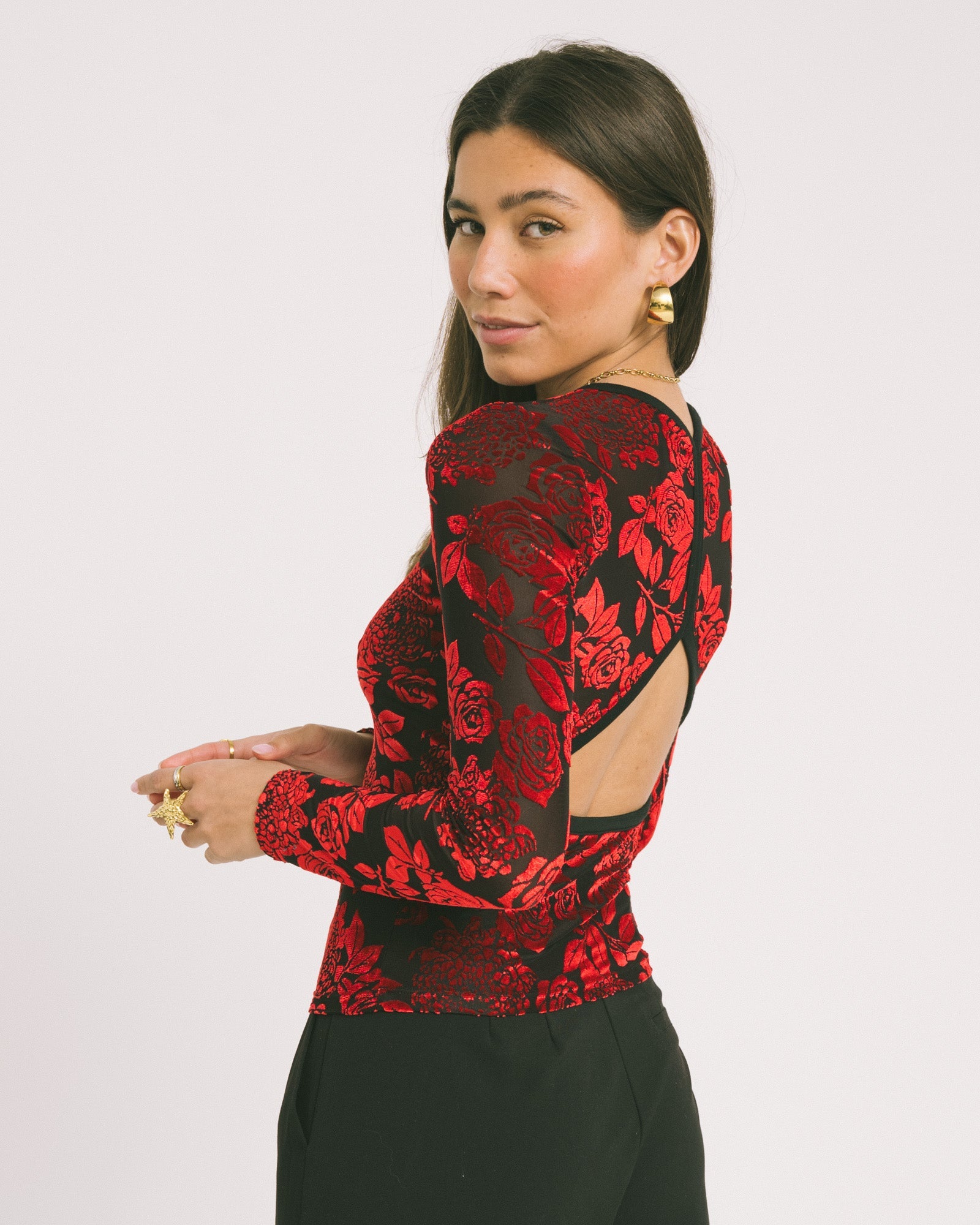 Das Baro Longsleeve ist alles andere als schlicht: Mit offenem Rücken, dehnbarem Netzstoff und rotem Samt-Blumendruck ist es die perfekte Mischung aus sexy und schick.