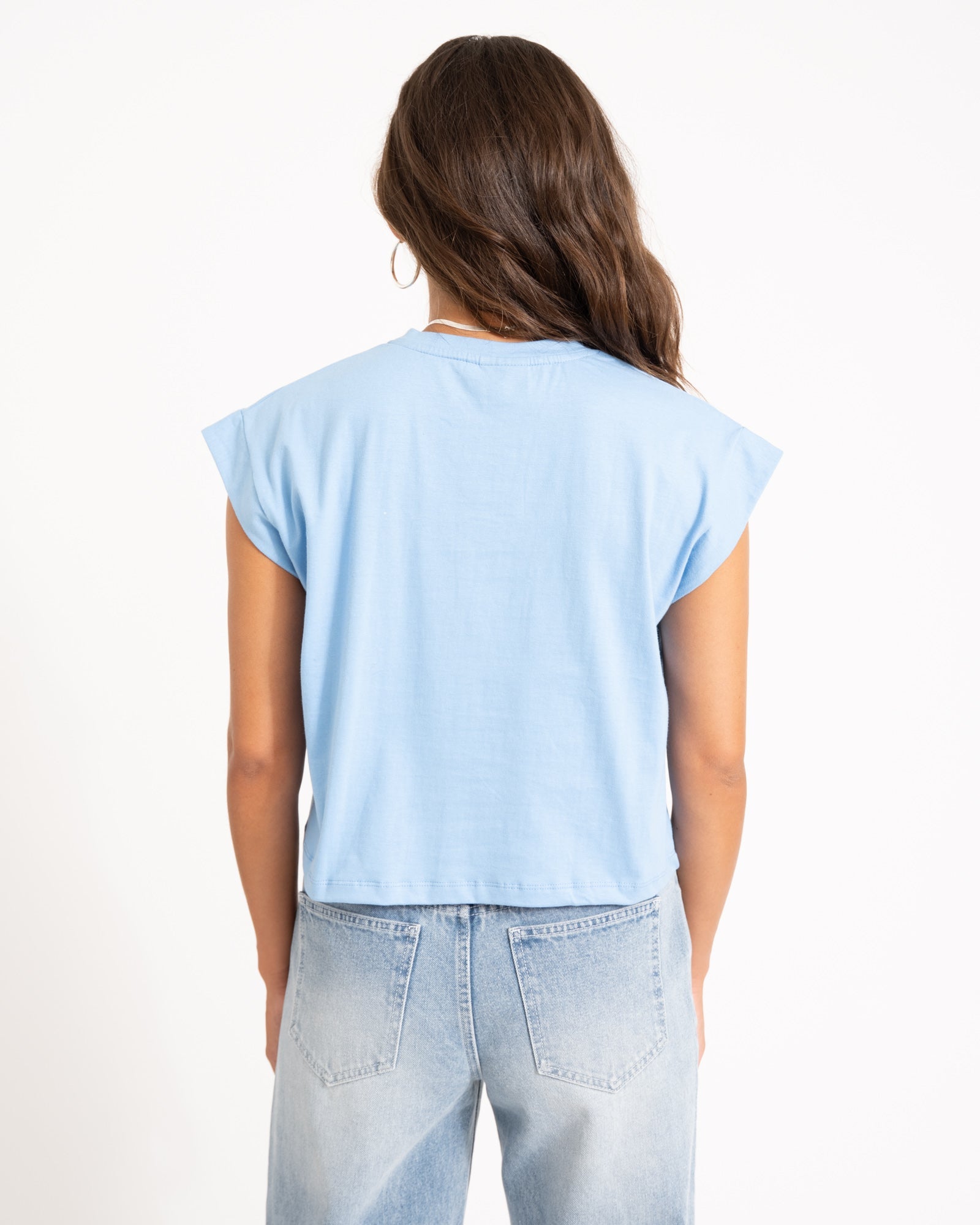 Zartes Blau, herrlich luftig und genau richtig kurz. Das Beggi Tee ist dein Alltags-Basic mit frischem Twist. Trage es zu Jeans, Shorts oder deinem Lieblingsrock.
