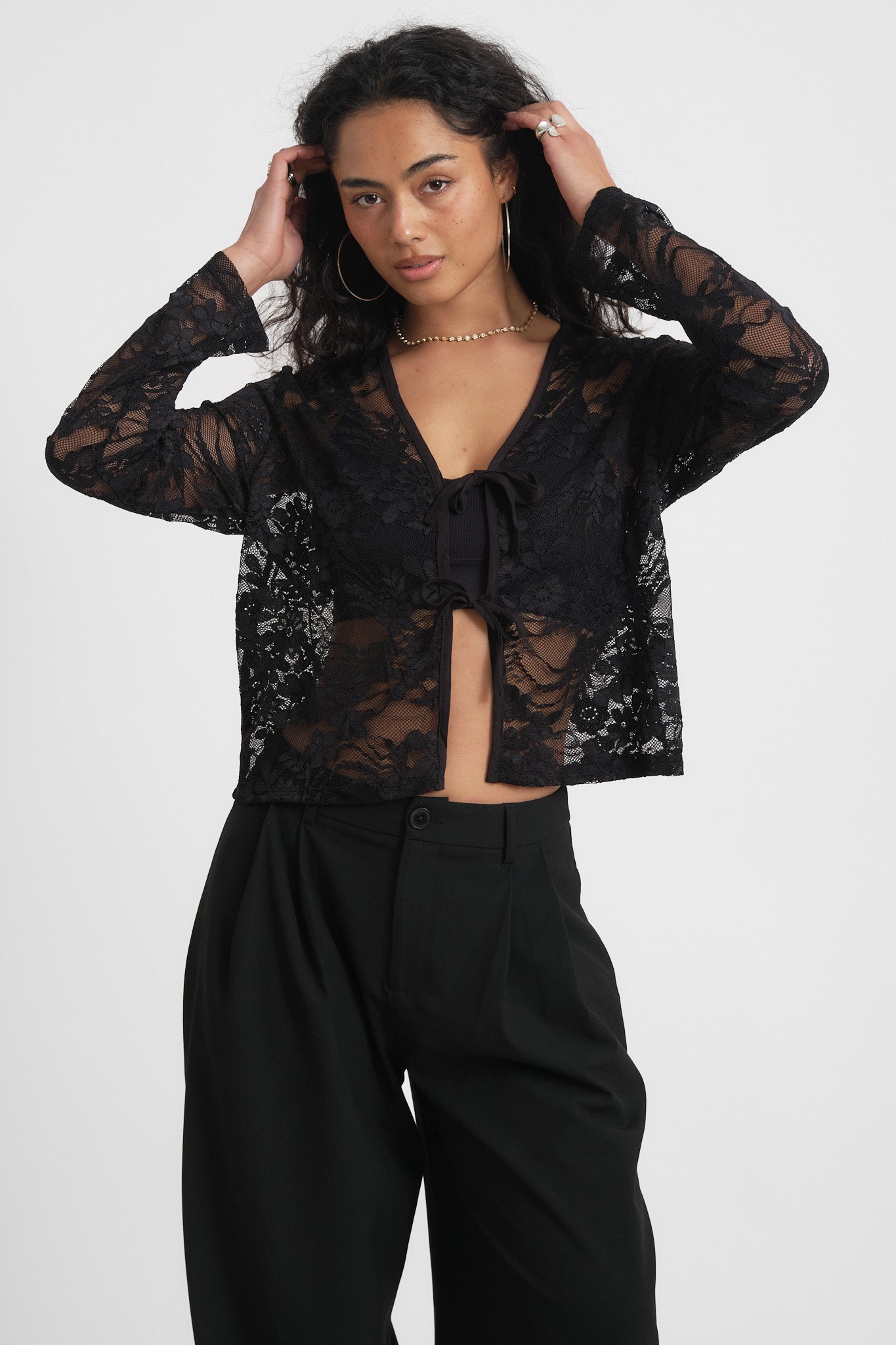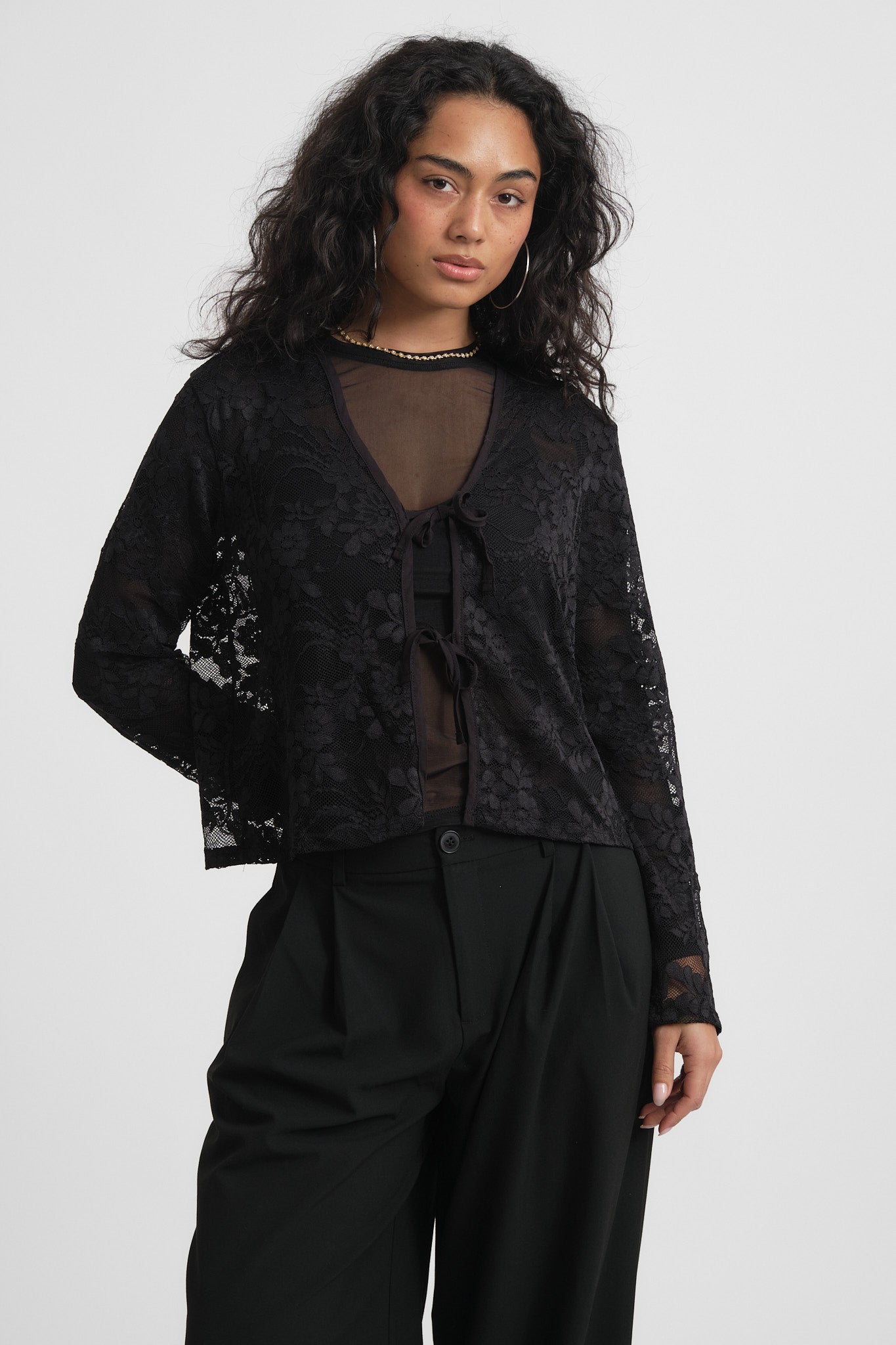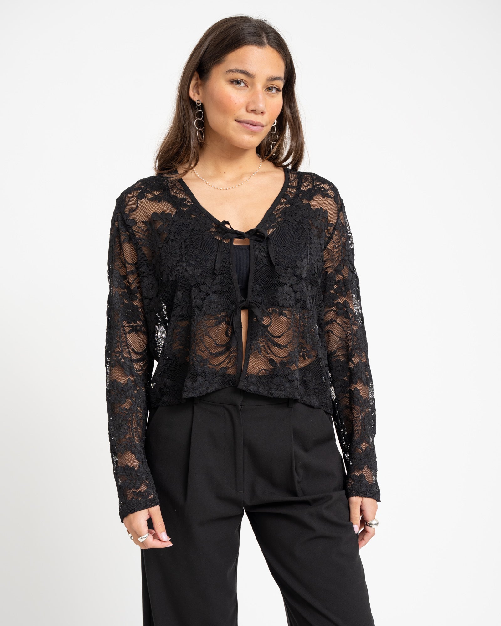 Dieses schwarze Spitzentop ist ein absolutes Must-have. Die Spitzenoptik und die dezenten Schleifen vorne verleihen ihm eine besondere Note und machen es zu einem echten Hingucker für jedes Outfit. Perfekt für die Feiertage!