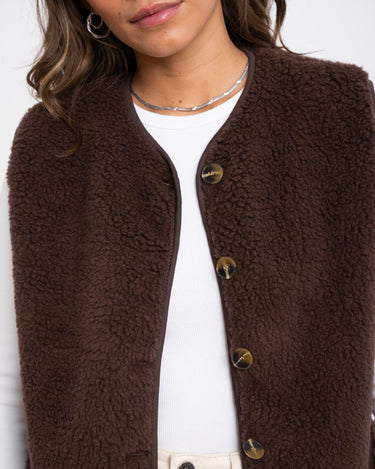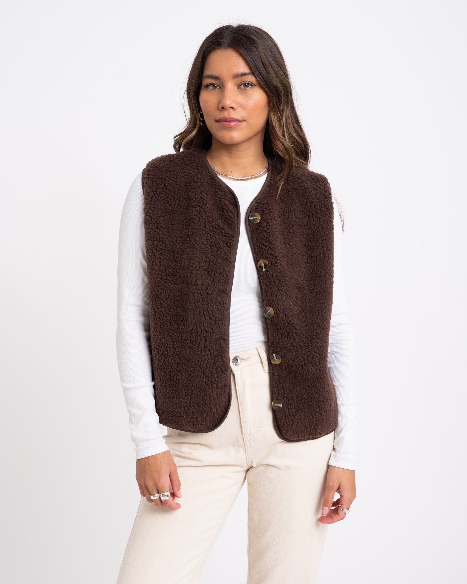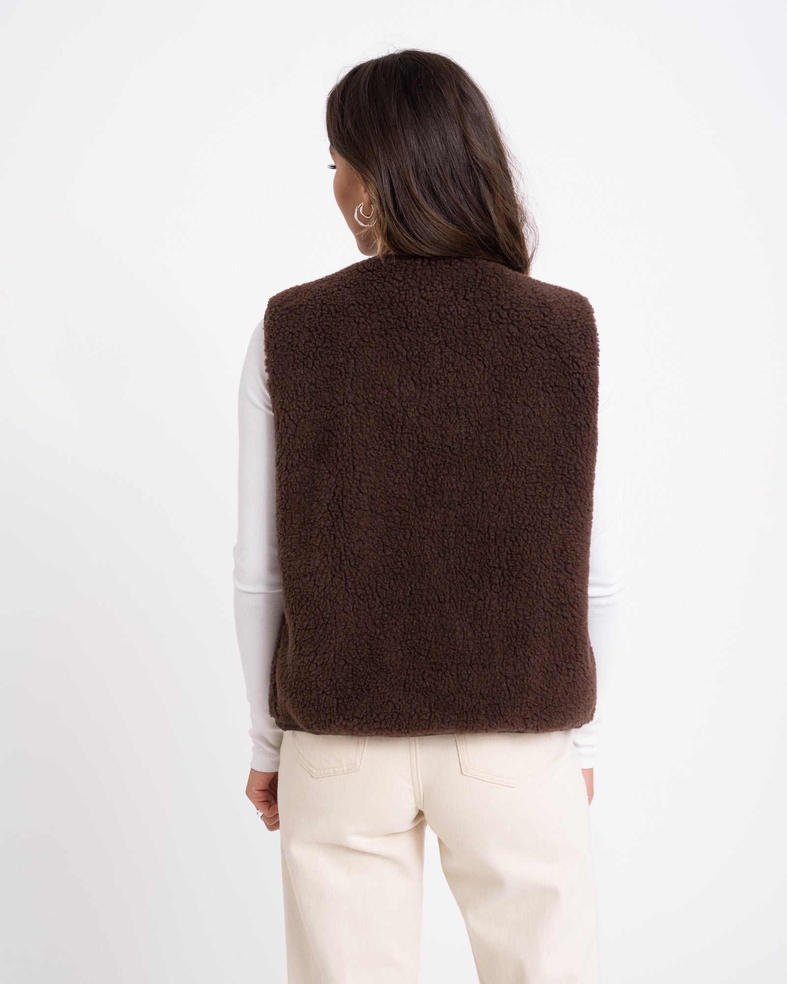 Eine braune Teddyweste mit schöner Verarbeitung und Knopfverschluss. Kombinieren Sie die Weste mit all Ihren Basics.