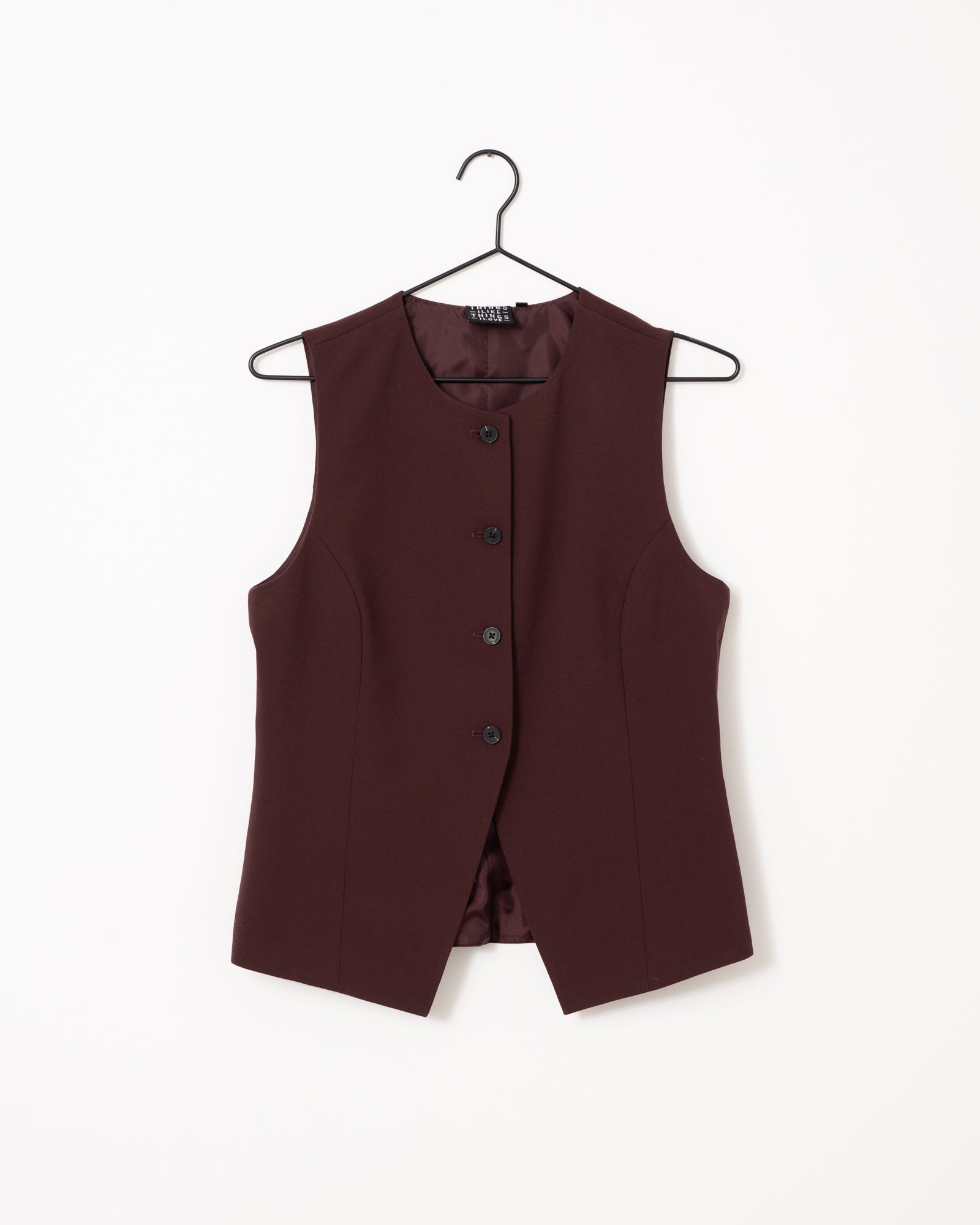 Minimalistisch und feminin. Diese Weste sitzt perfekt und hat einen hohen Ausschnitt für einen cleanen Look. Der Knopfverschluss vorne endet etwas höher und erzeugt einen dezenten Schlitz als verspieltes Detail.