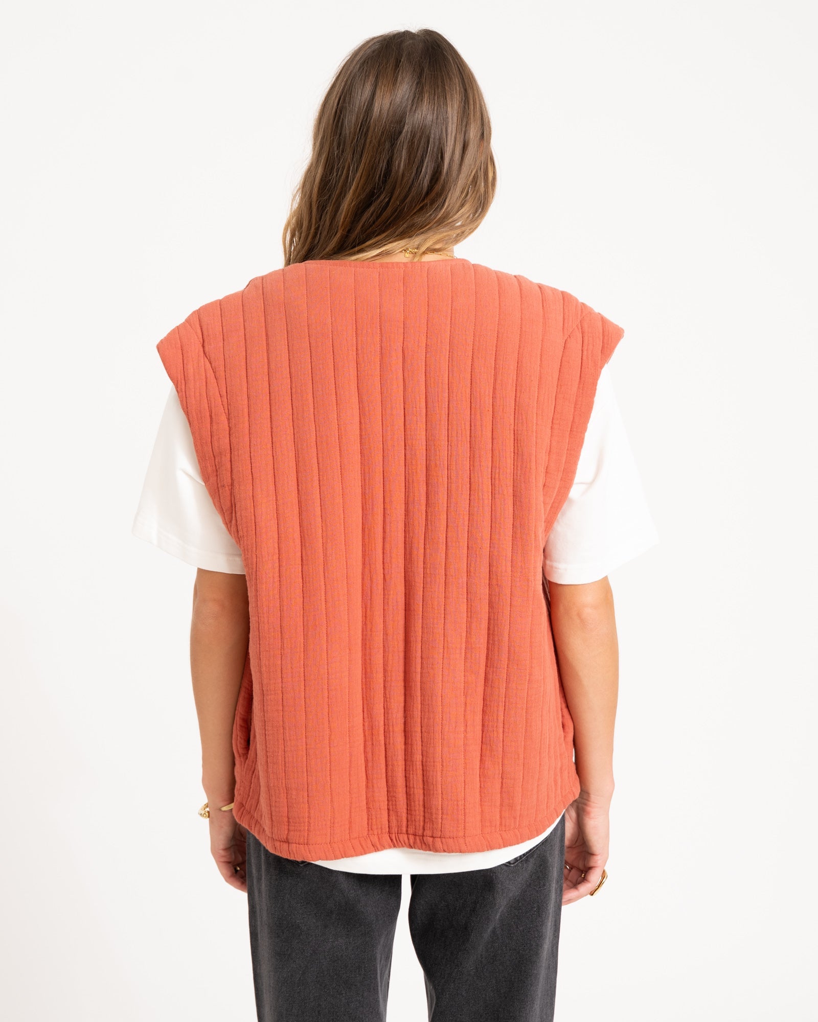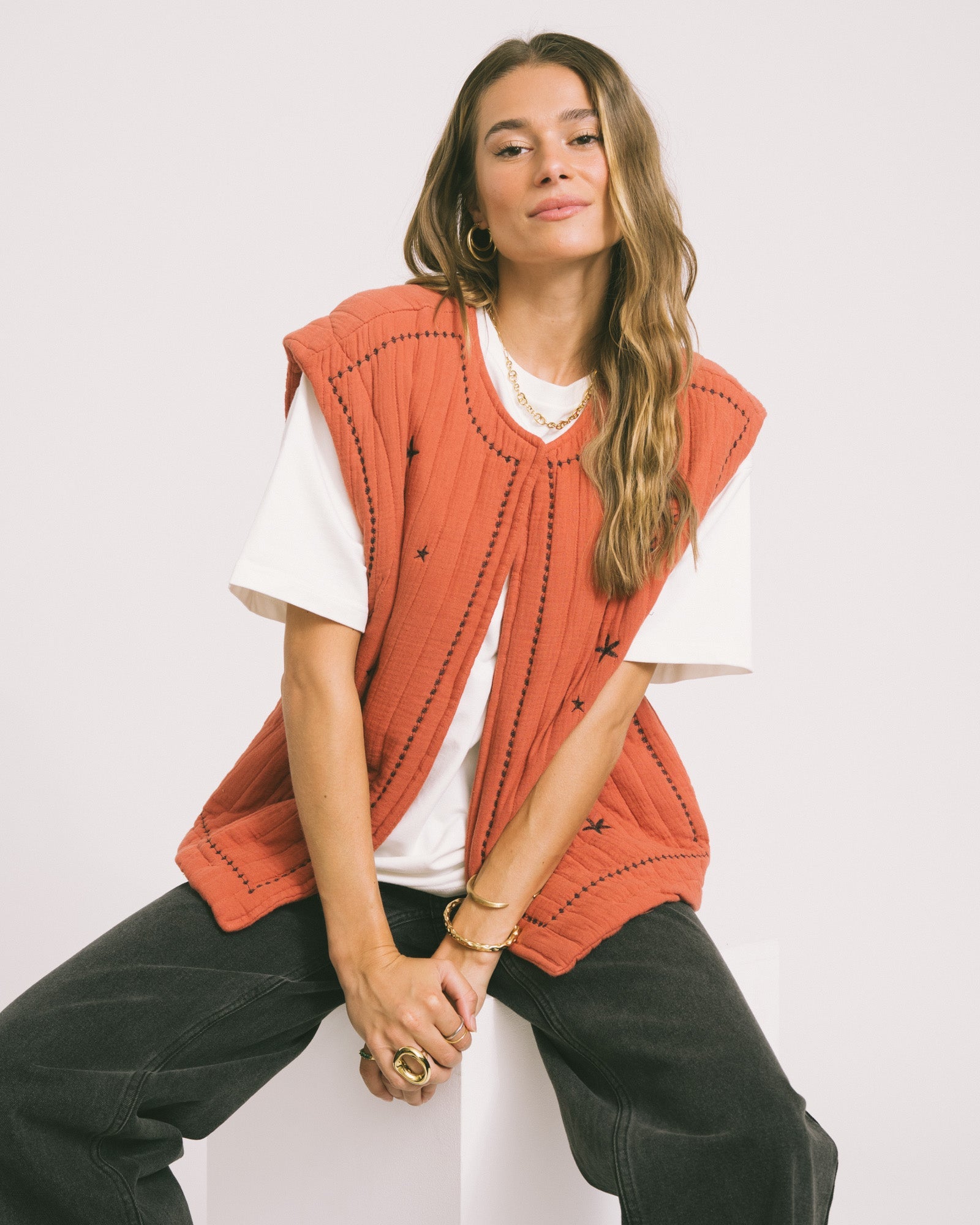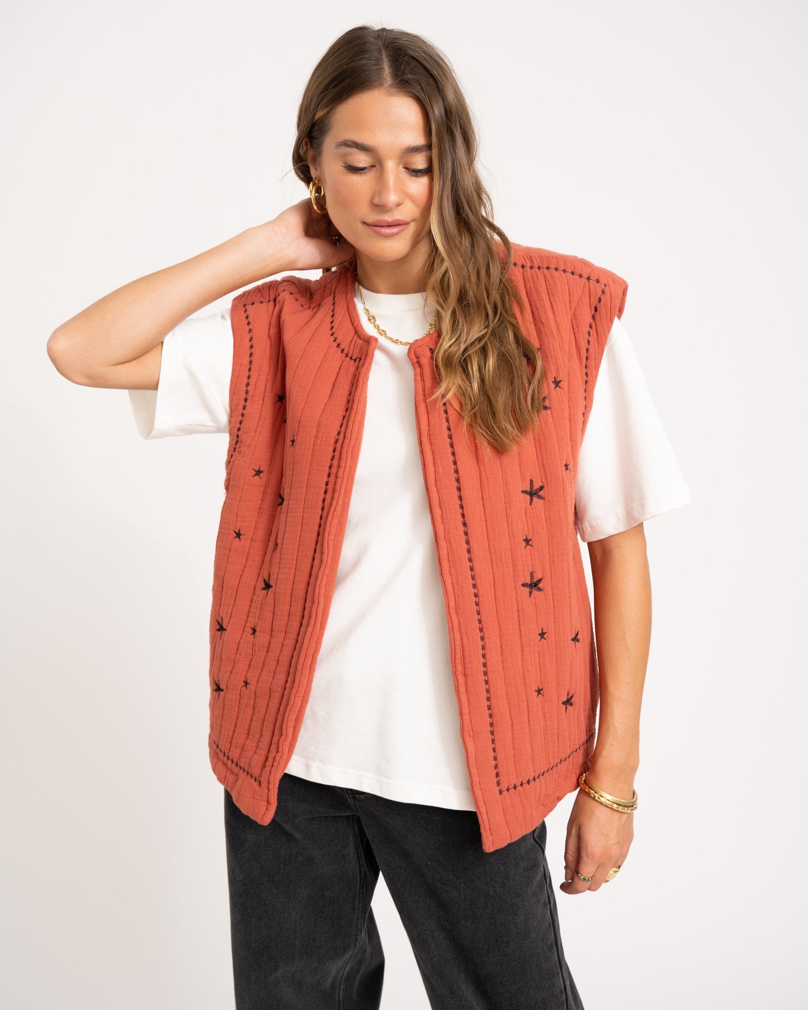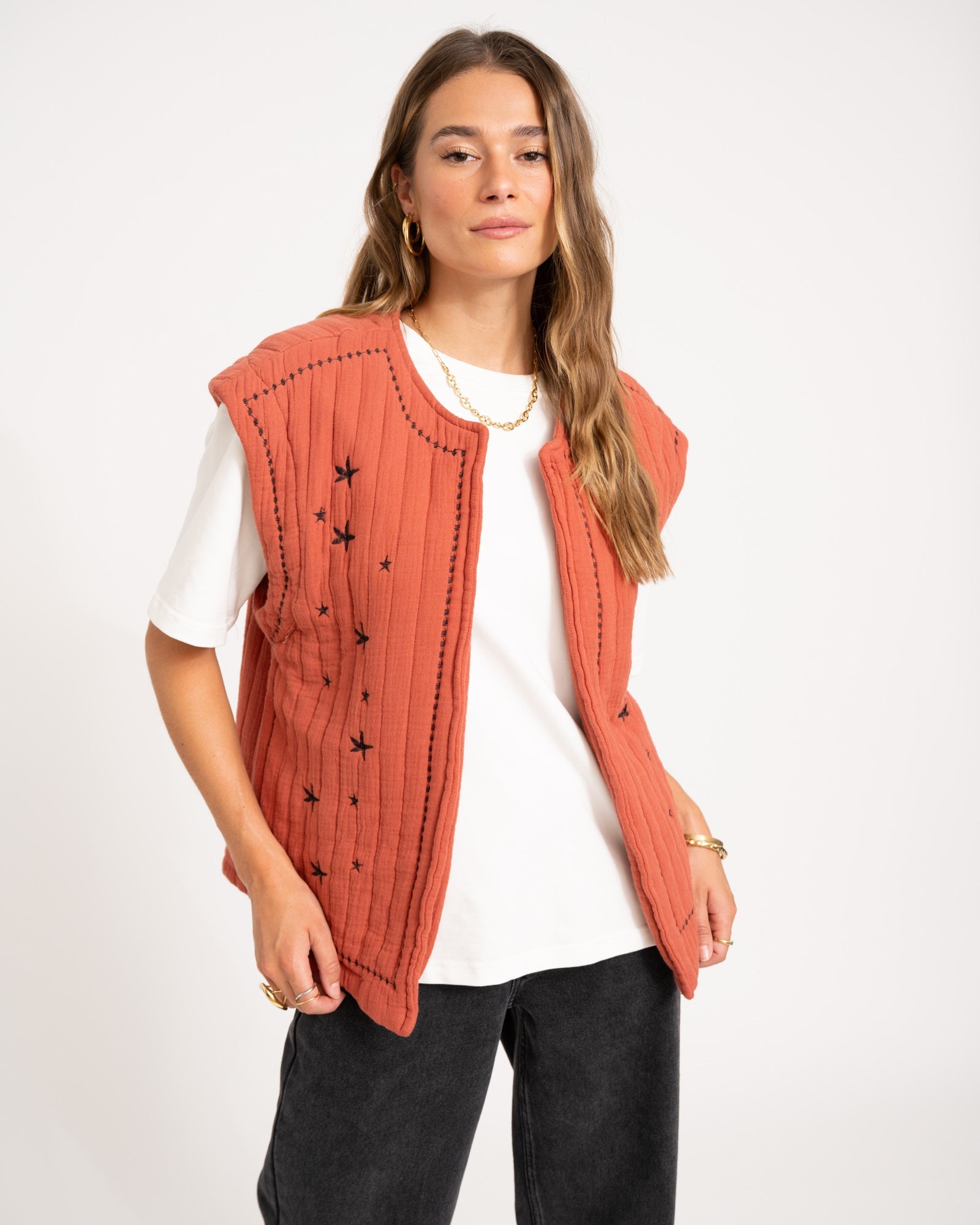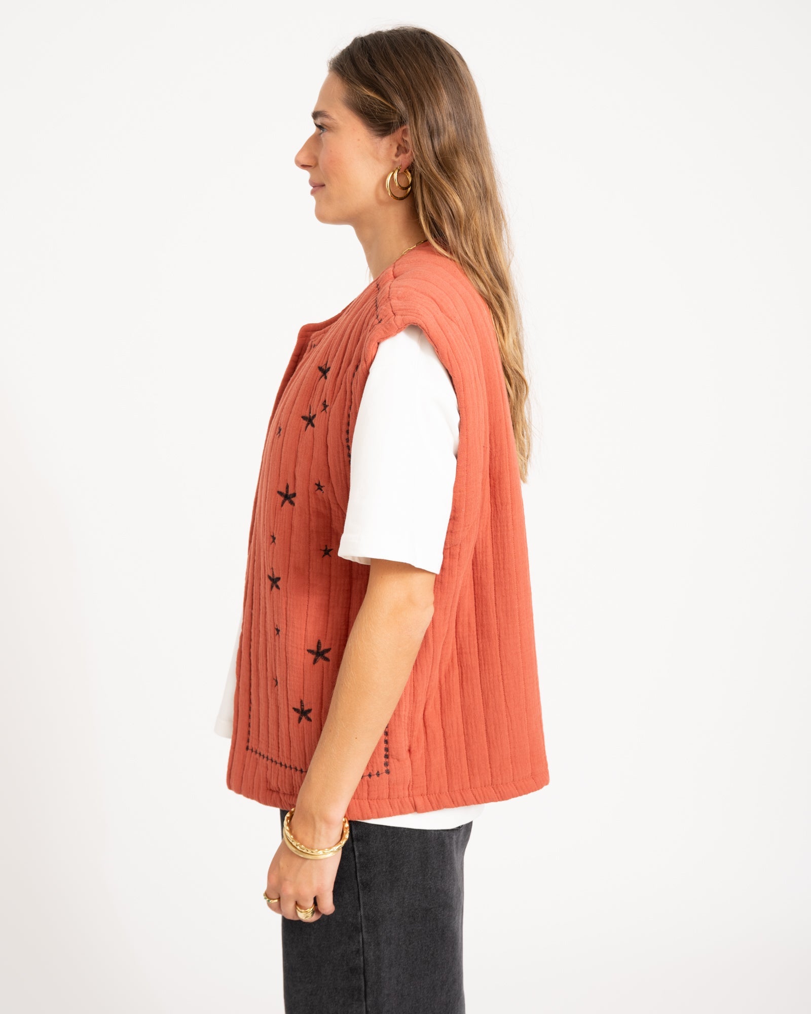 De Evi Embroidery Gilet is een dikkere, oversized gilet die je moeiteloos over je favoriete T-shirt gooit. De rijke pomegranate kleur en geborduurde sterren maken 'm net even anders dan anders.