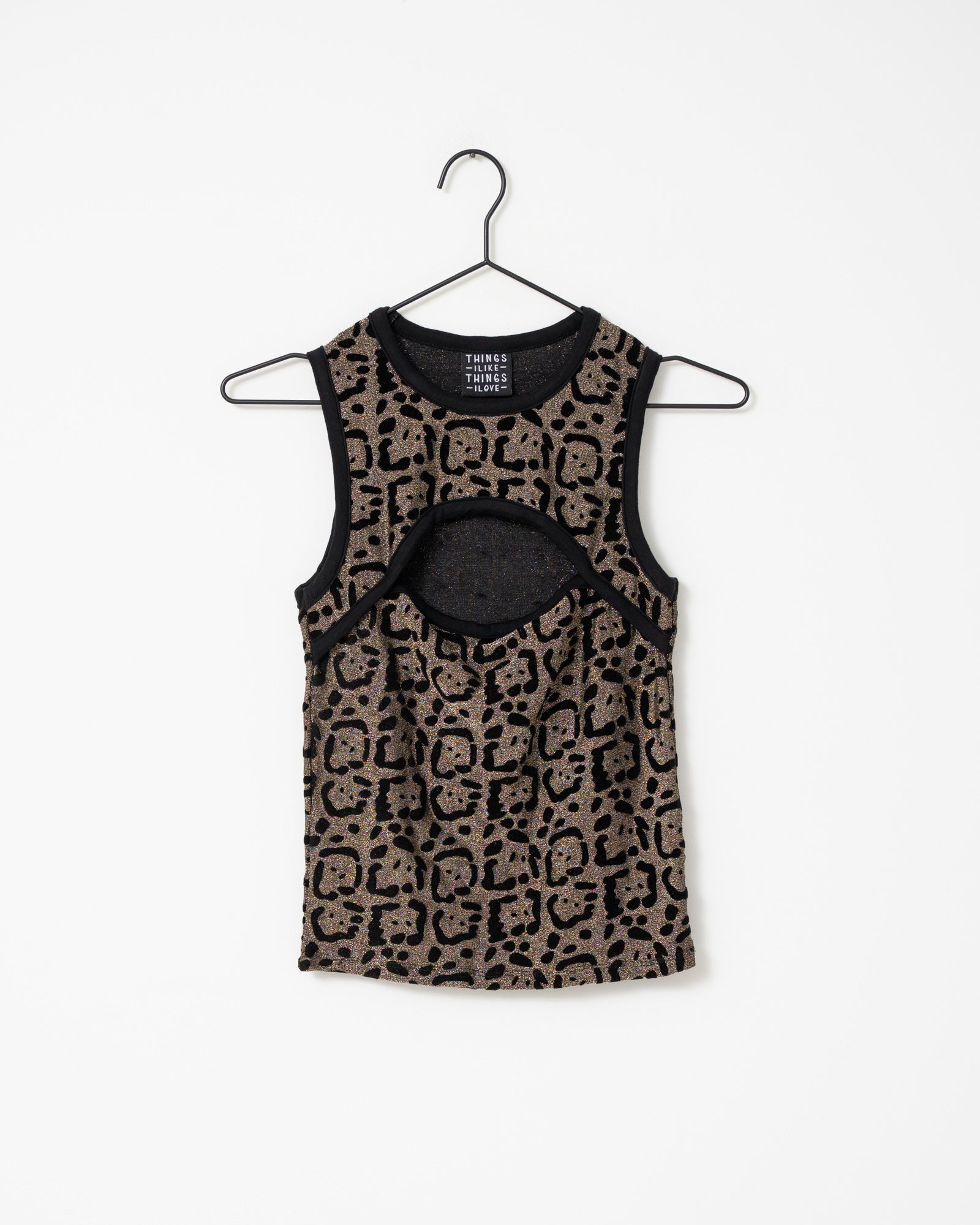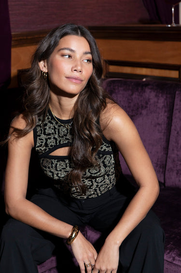 Das TILTIL Fanny Top Panther Gold bietet alles, was Sie für einen auffälligen Party-Look brauchen. Dieses schwarze Top besticht durch seinen goldenen Panther-Print, der sofort ins Auge fällt.