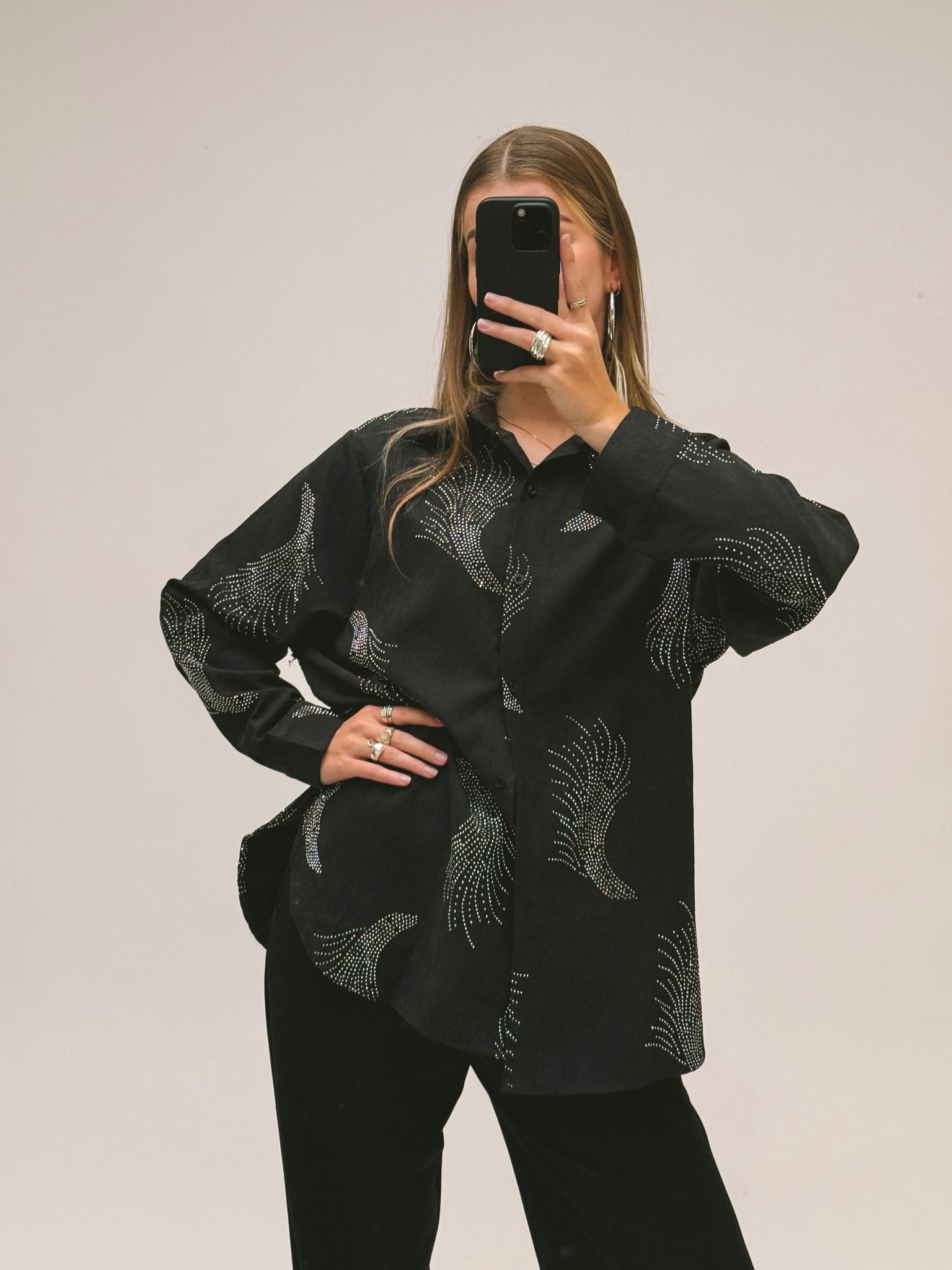 | Details | Knopfverschluss, Lange Ärmel mit Bündchen, Silberne Glitzersteine, Übergroße Passform |
