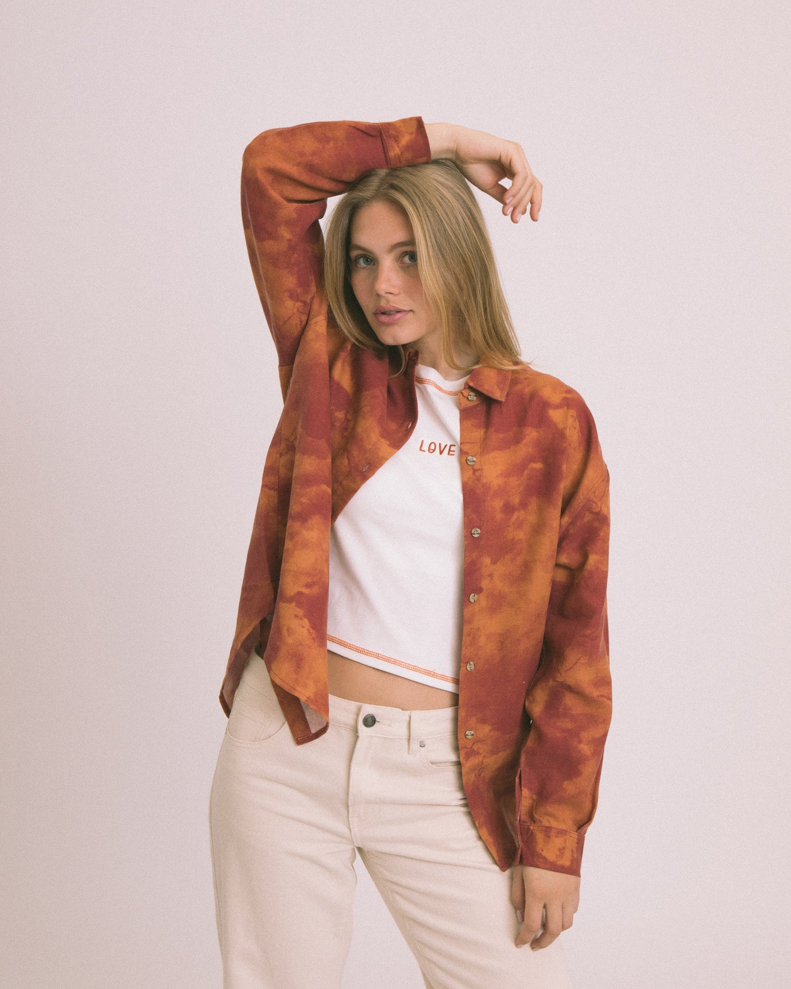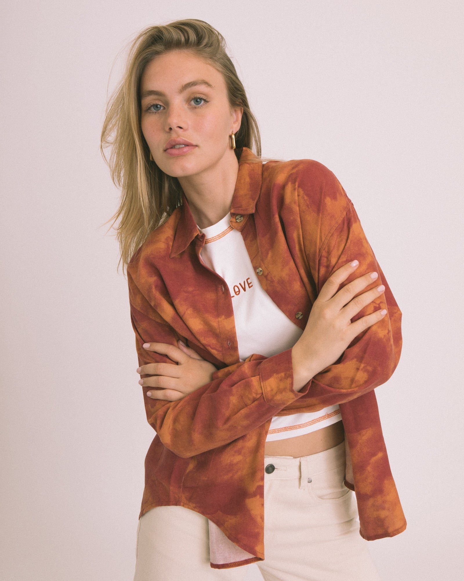 Eine übergroße Bluse mit Batikdruck und Knopfverschluss.