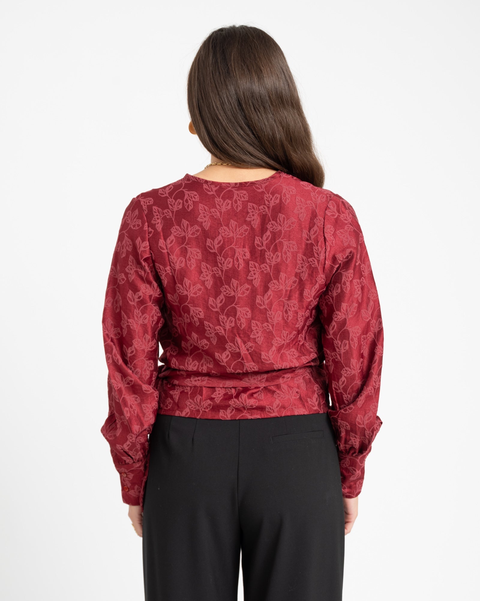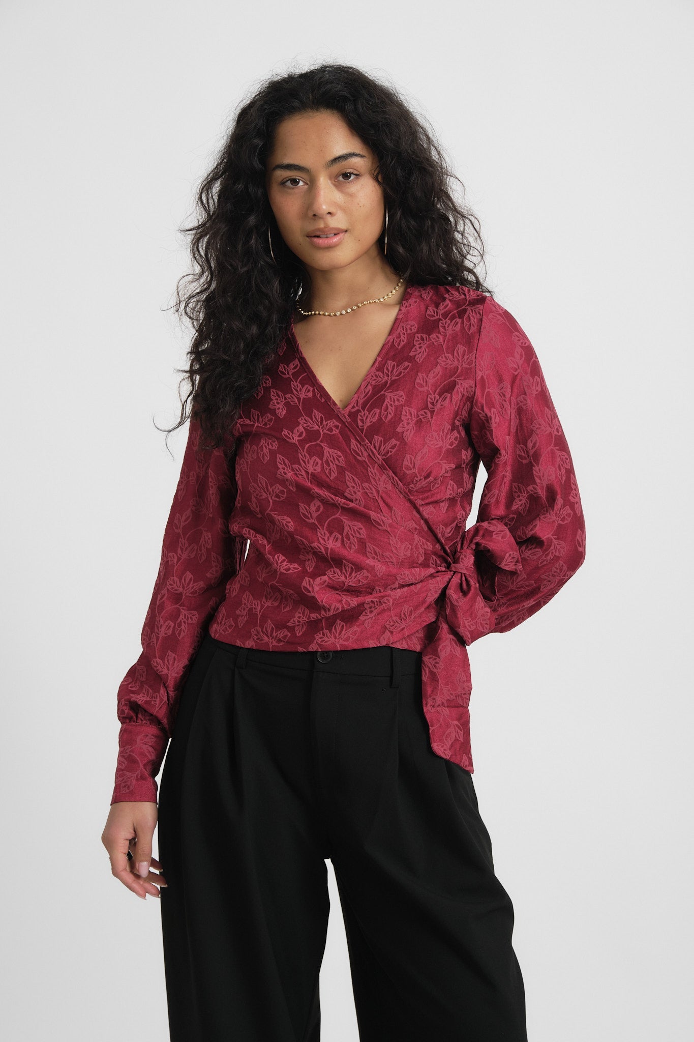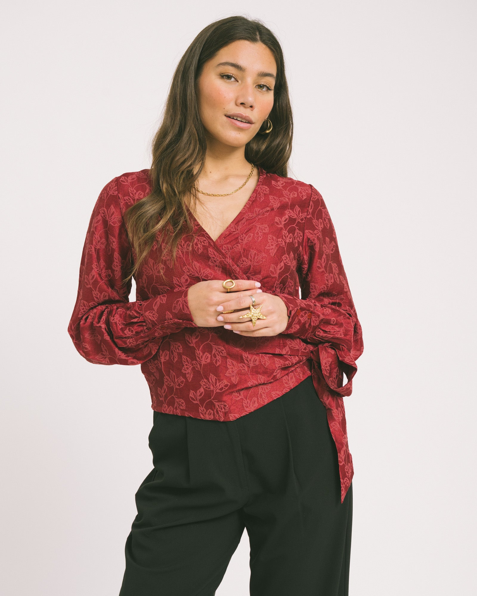 Verleihen Sie Ihrer Festtagszeit mit diesem wunderschönen Wickeloberteil in Kirschrot einen Hauch von Glamour. Die satte, warme Farbe und der dezente Blumendruck machen dieses Oberteil zu einem echten Hingucker.
