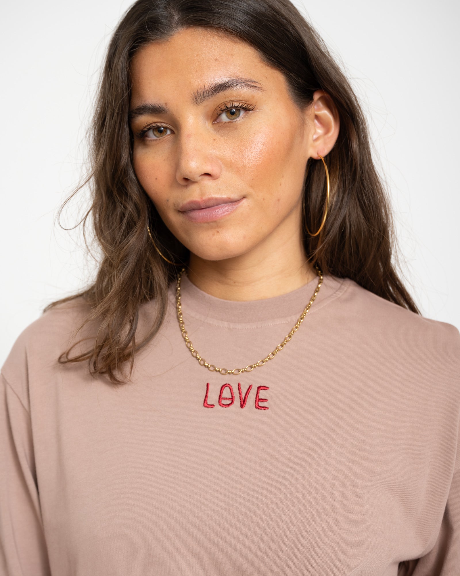 Minimalistischer LOVE-Print auf der Vorderseite und ein auffälliger Drache auf der Rückseite.
