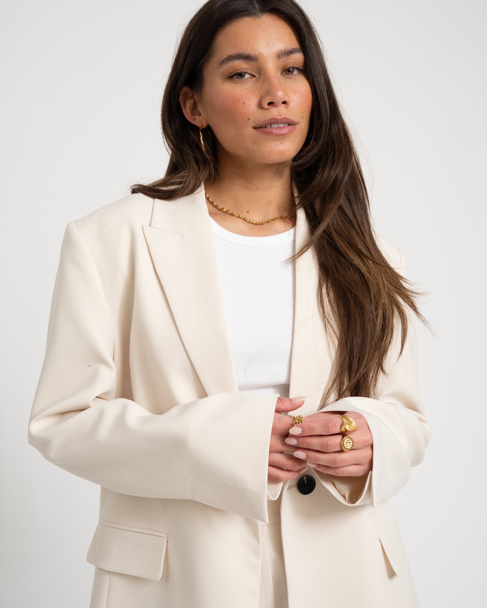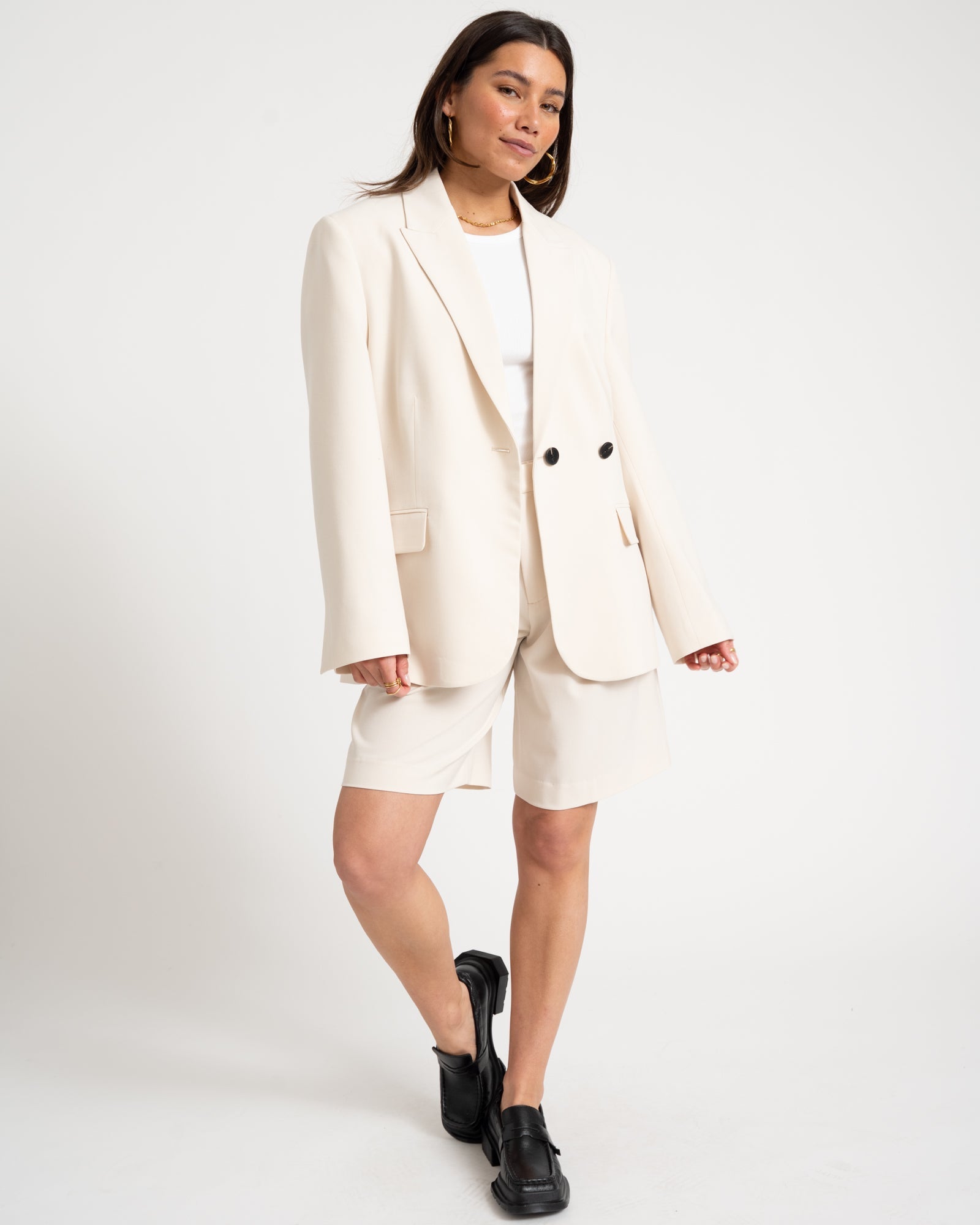Dieser klassische Blazer in Off-White verleiht jedem Look sofort ein schickes Upgrade. Die Oversized-Passform und der zeitlose Schnitt machen diesen Blazer zu einem echten Essential in jeder Garderobe. Mit dem doppelten Knopfverschluss können Sie ihn genau so tragen, wie Sie möchten: eng für einen starken Look oder lockerer für eine lässigere Ausstrahlung. It’s up to you.
