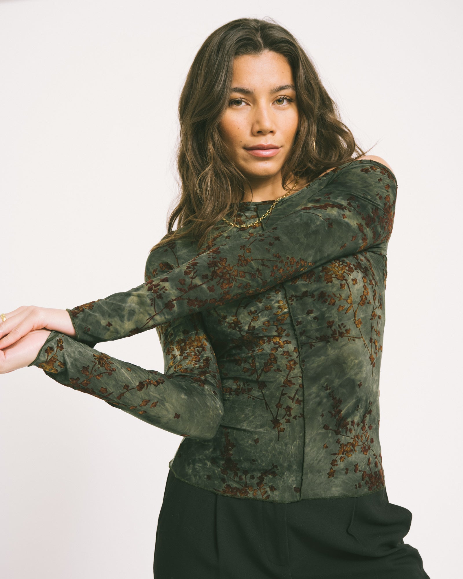 Dieses weiche Langarmshirt mit braunem Print, verspielten Nahtdetails und lässigem One-Shoulder-Schnitt ist stylisch und bequem zugleich.