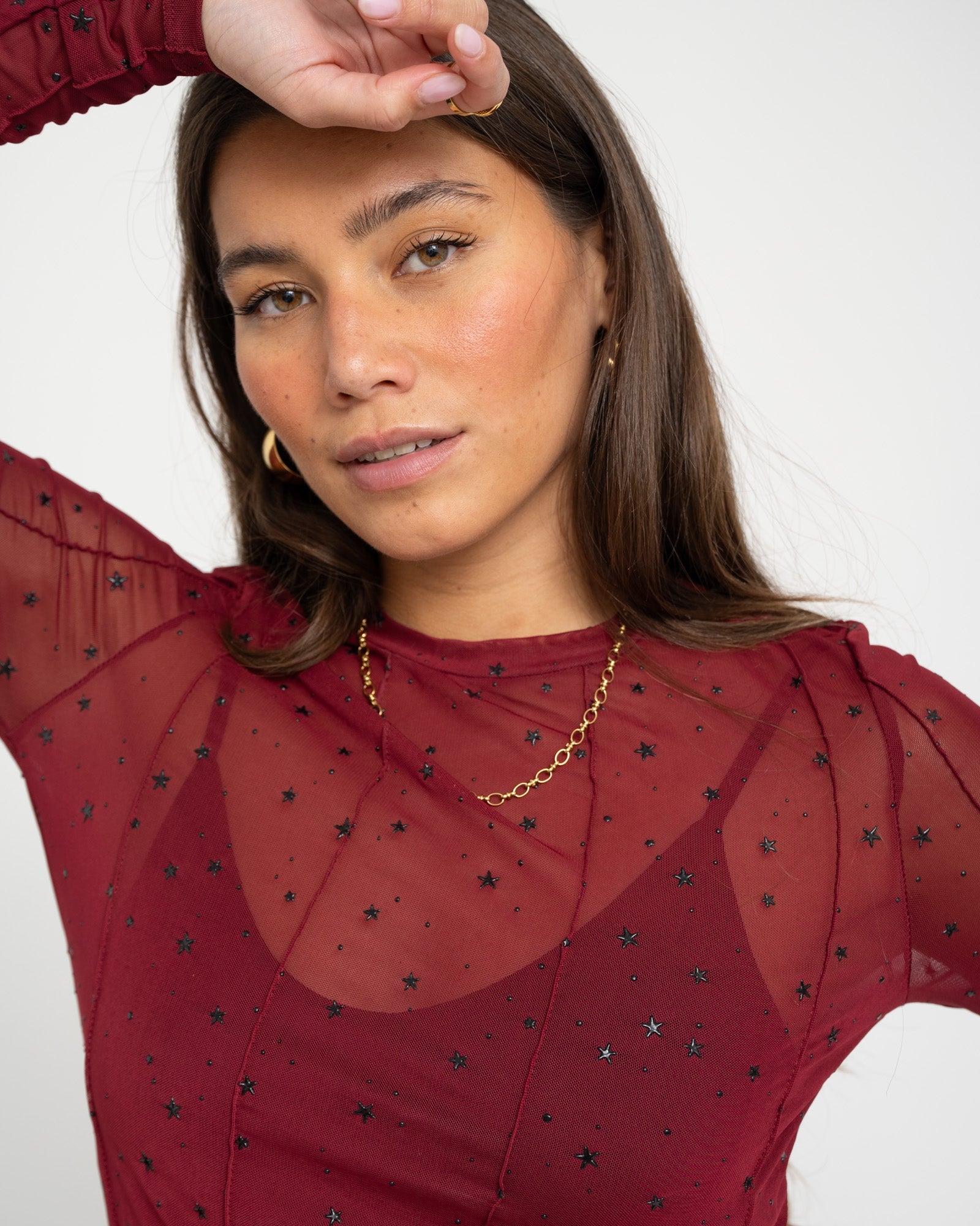 Strahle wie der Nachthimmel ✨ Das Moiha Starry Mesh Top in Burgunderrot mit schwarzen Sternen ist perfekt für einen mutigen, verspielten Look.
