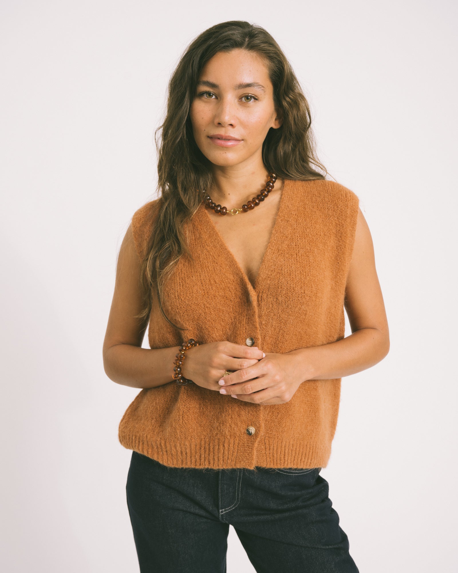 | Details | Knopfverschluss, Ärmellos, Dehnbar und flauschig, V-Ausschnitt |