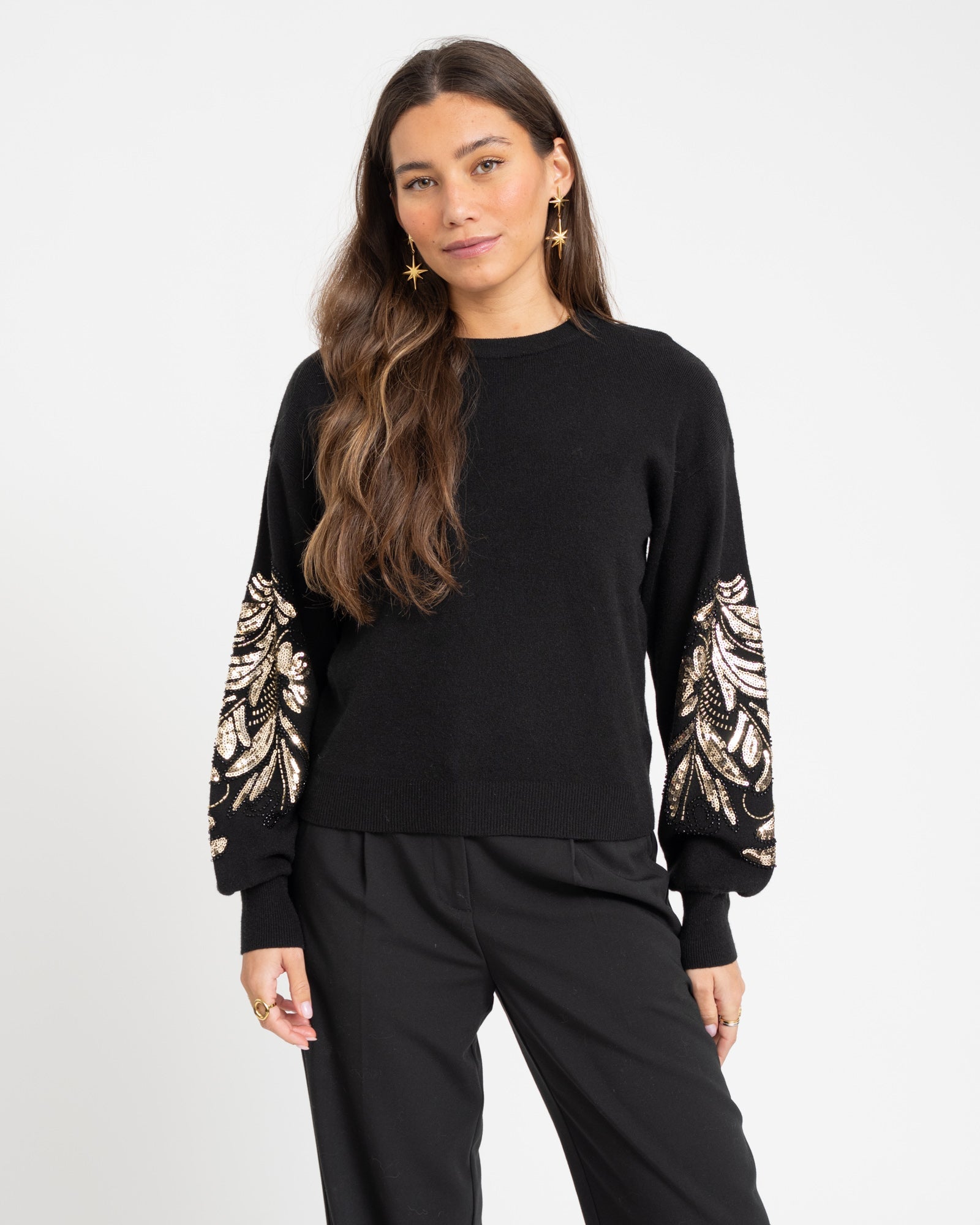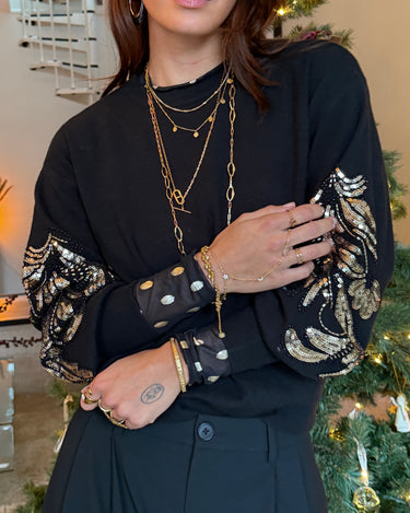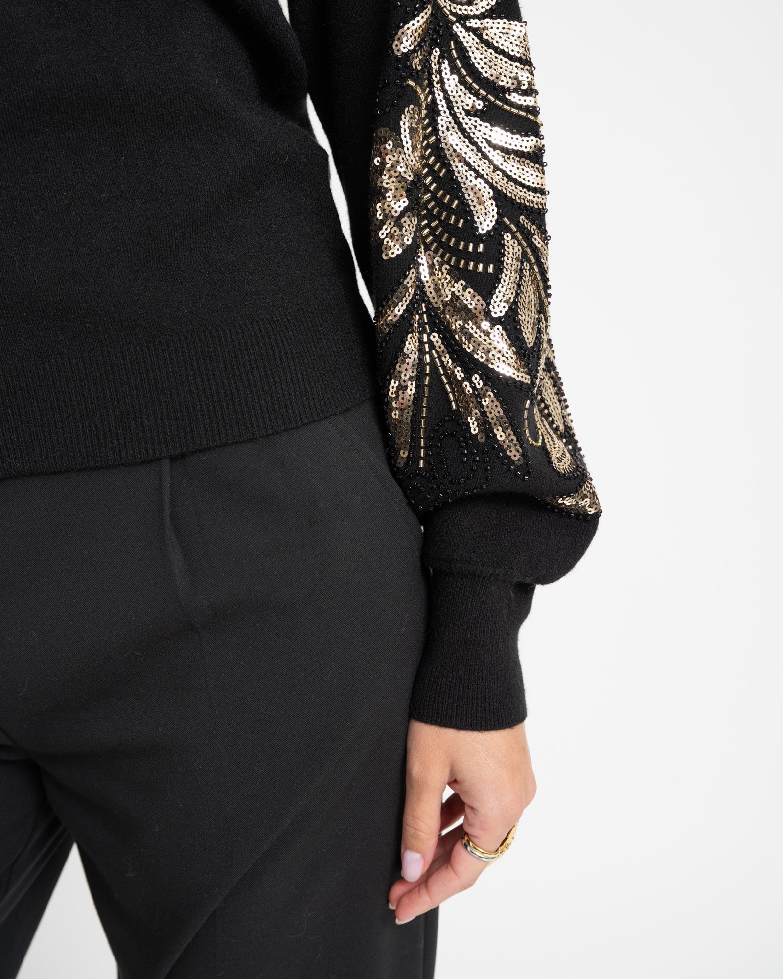 Dieser schwarze Pullover ist Ihr perfekter Begleiter für die Feiertage (und insgeheim auch danach). Das weiche Strickmaterial hält Sie wunderbar warm, während die schimmernden Ärmel mit goldenen Details für festlichen Glanz sorgen.
