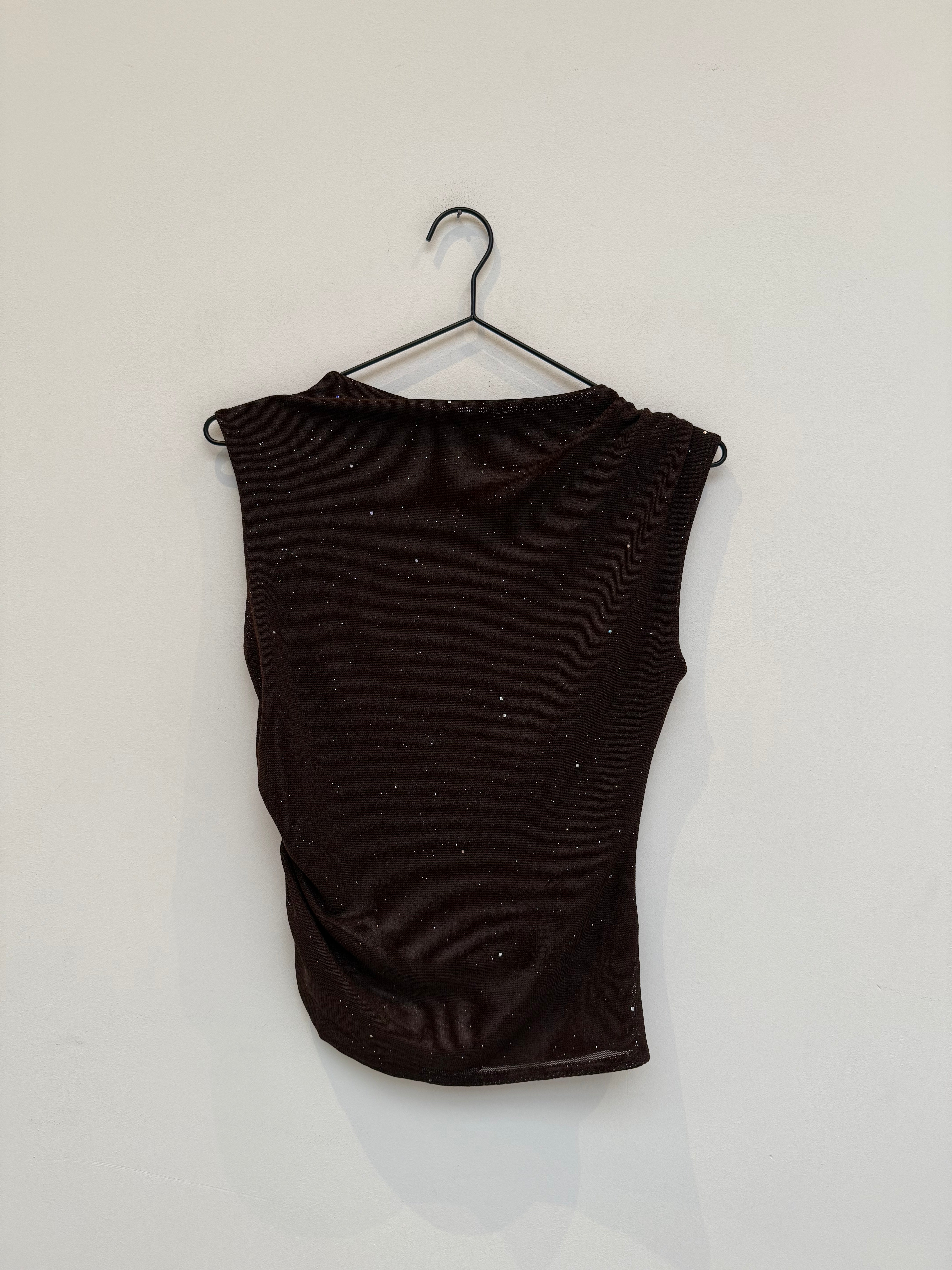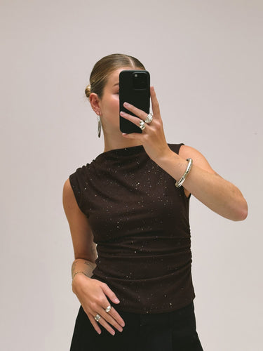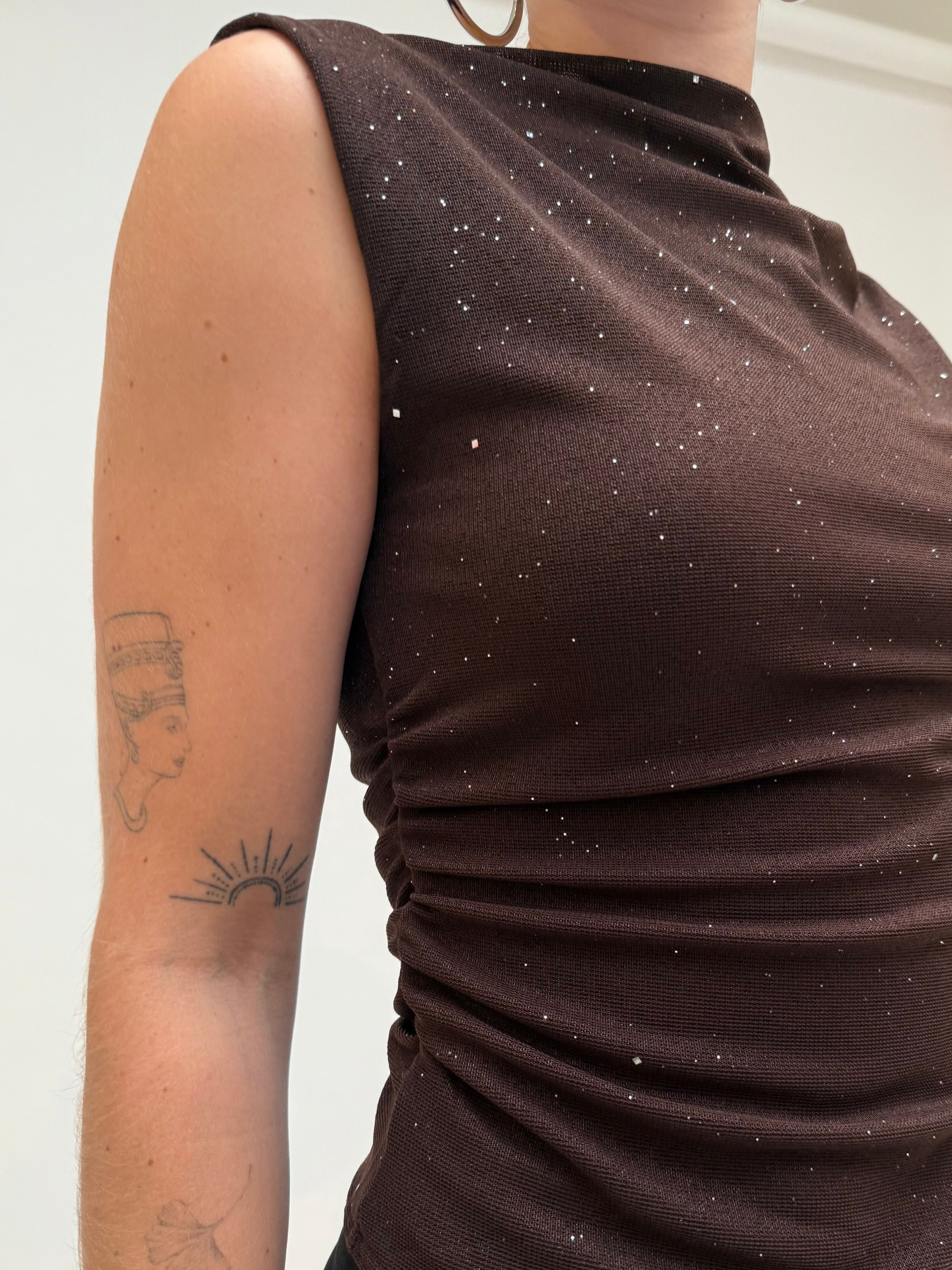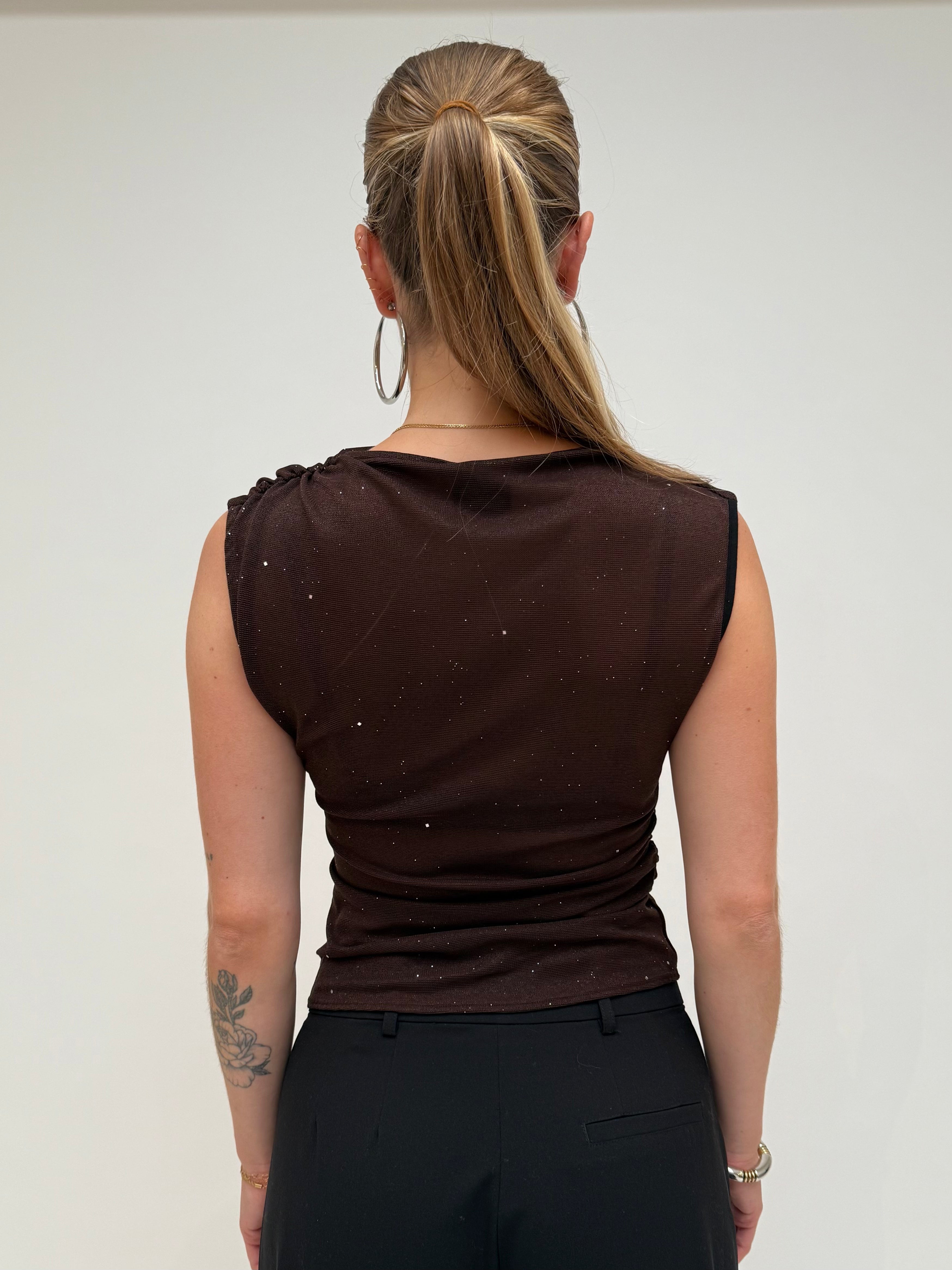 Ärmelloses Top mit dezentem Glitzer und Rüschen an den Seiten.
