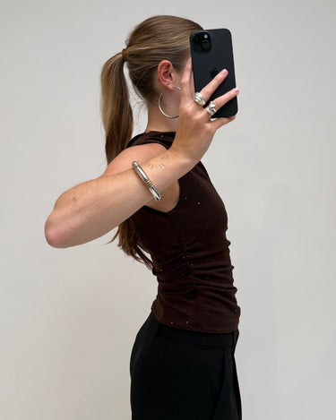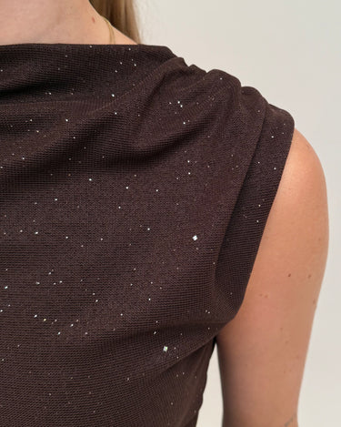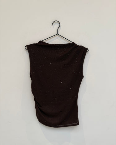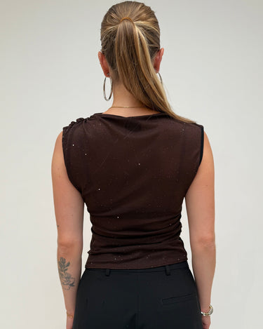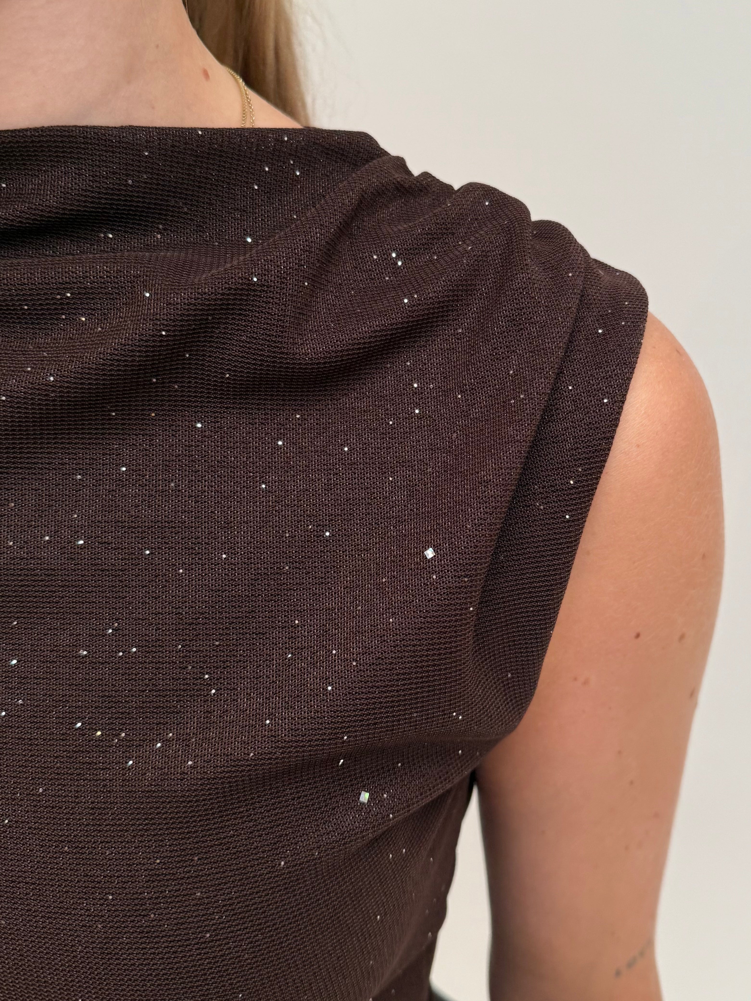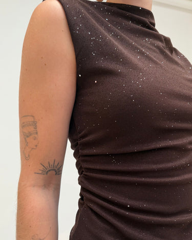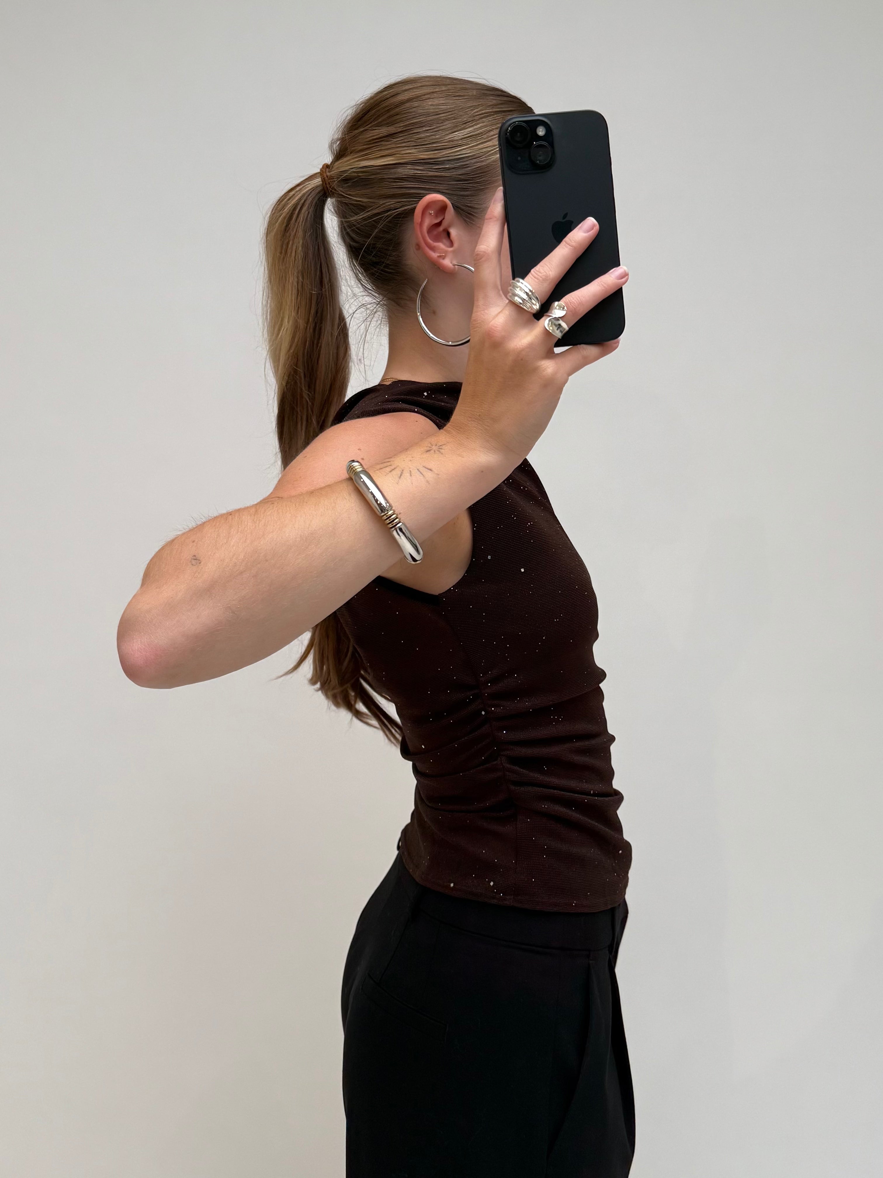 Ärmelloses Top mit dezentem Glitzer und Rüschen an den Seiten.