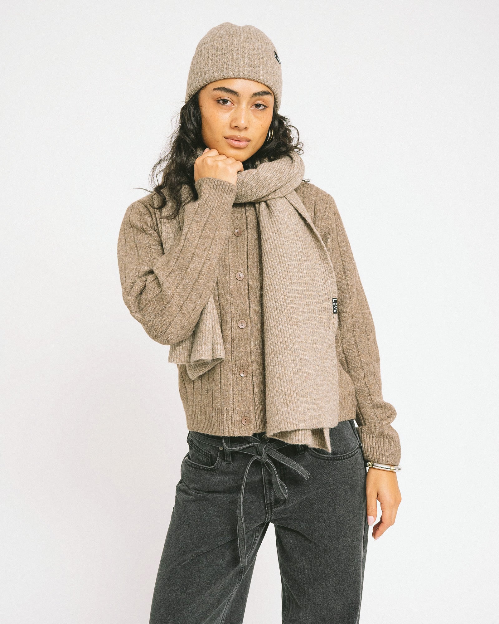 Unser superweicher und angenehmer Rippstrickschal. Er hat, genau wie die Beanie, ein kleines Markenlabel mit „LOVE“.