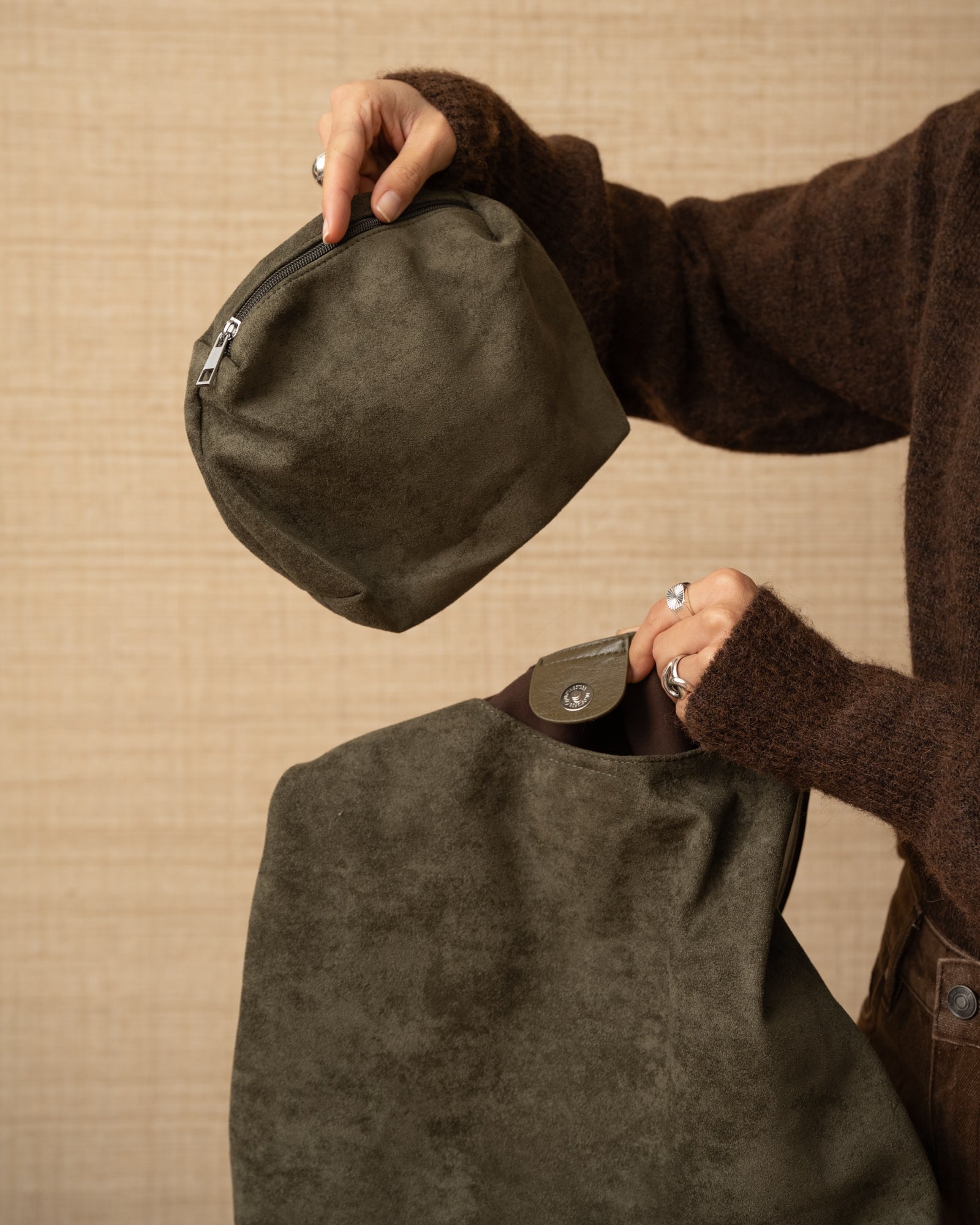 Diese weiche Schultertasche aus PU-Material mit Veloursleder-Finish besticht durch ihr minimalistisches, fließendes Design, das sich mühelos in jedes Outfit einfügt. Ein passendes Täschchen ist im Lieferumfang enthalten – ideal für kleine Utensilien.