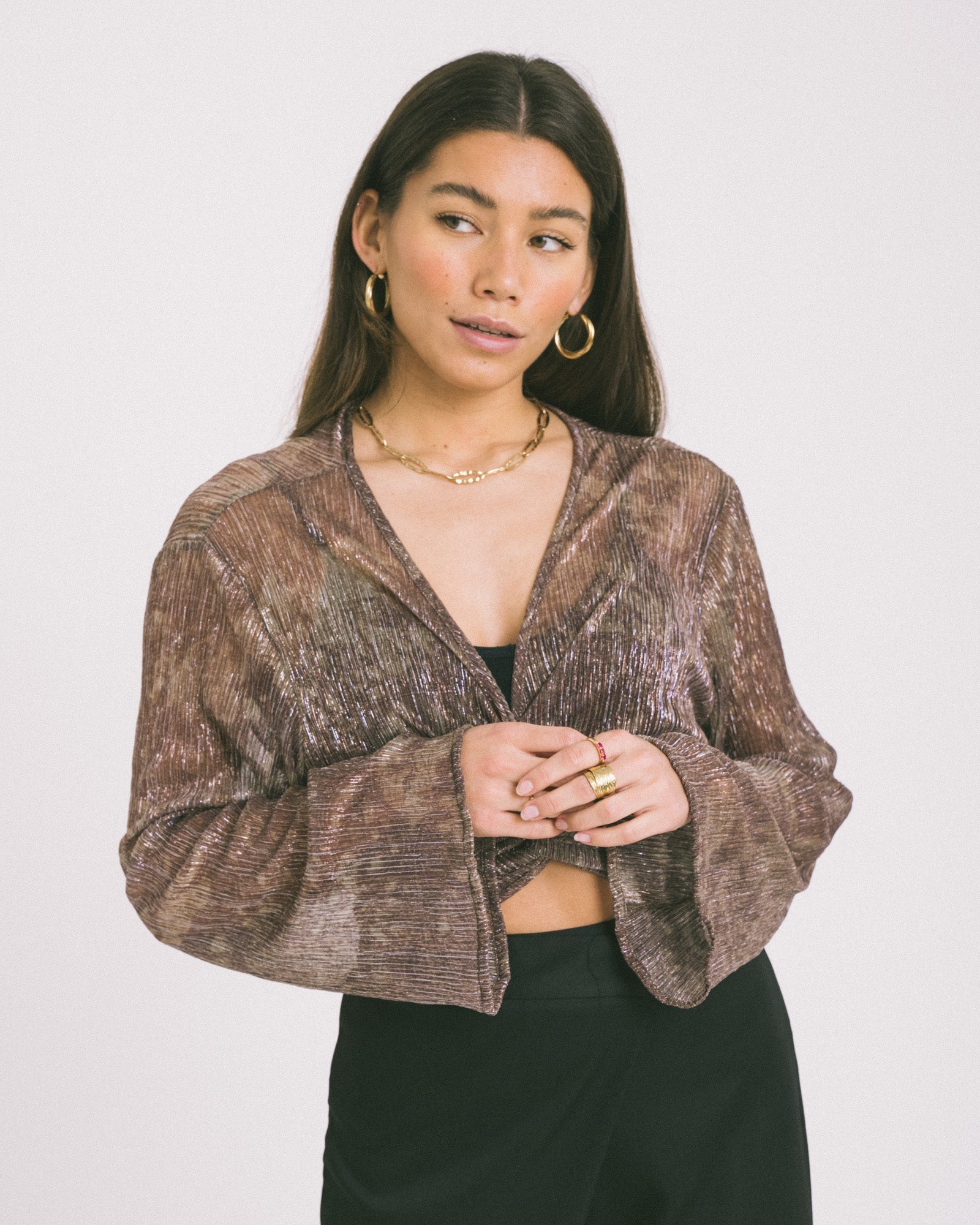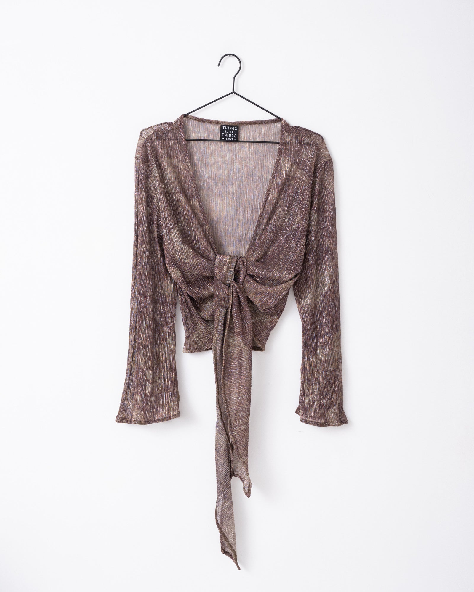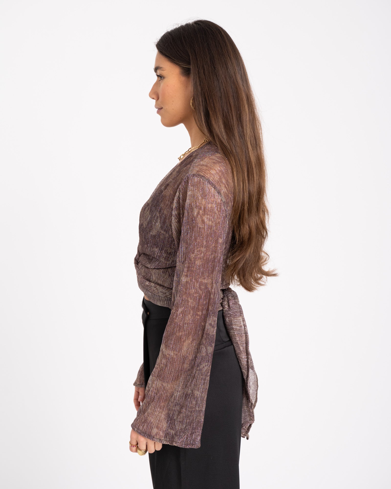 Glänzend und glitzernd! Das Wickeloberteil Sonny hat eine entspannte Passform und ein durchscheinendes Glitzermuster; kombiniere es mit einem Bralette.