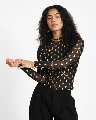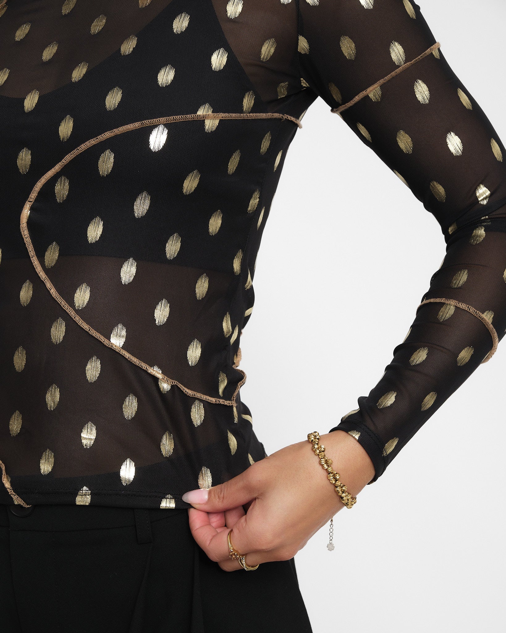 Dieses Top ist transparent, dehnbar und mit goldenen Punkten verziert. Die verspielten Nähte und die dezenten Babylock-Kanten verleihen ihm das gewisse Extra.