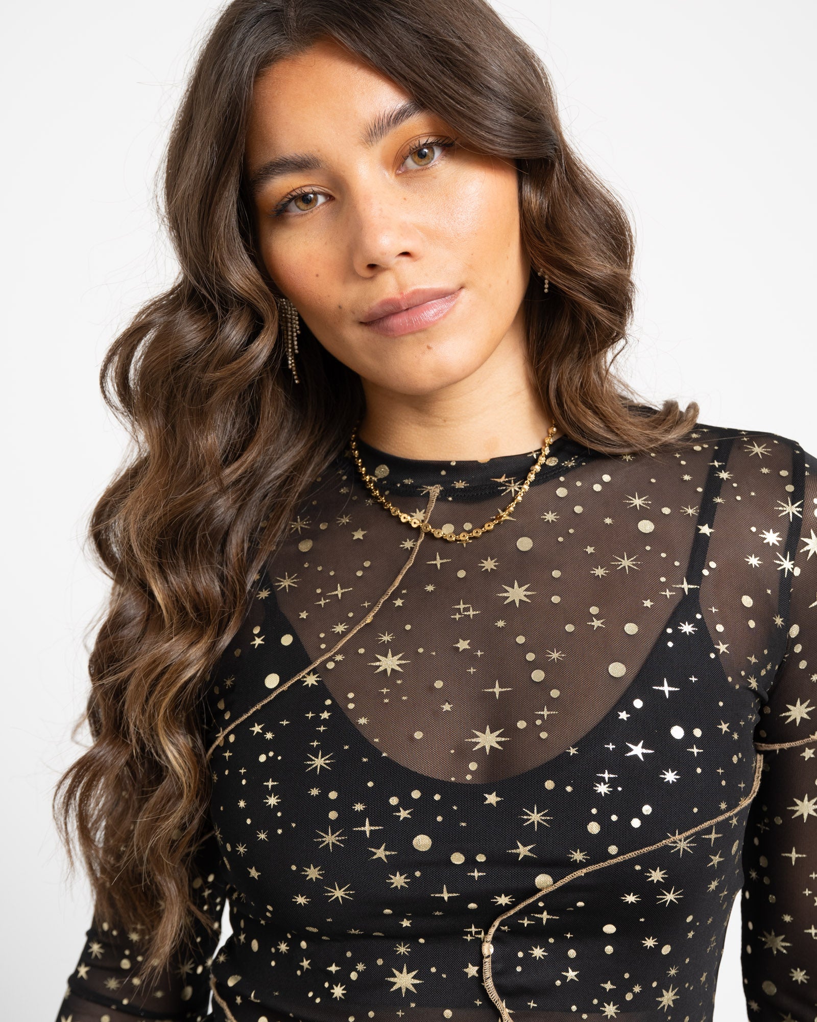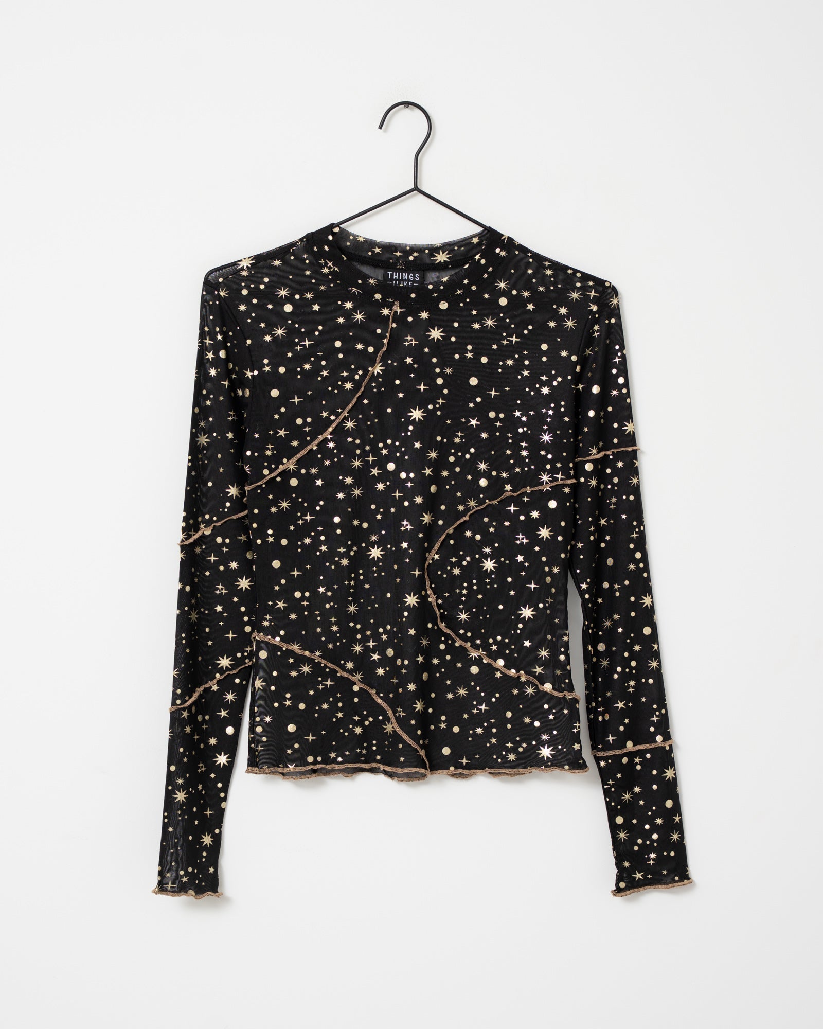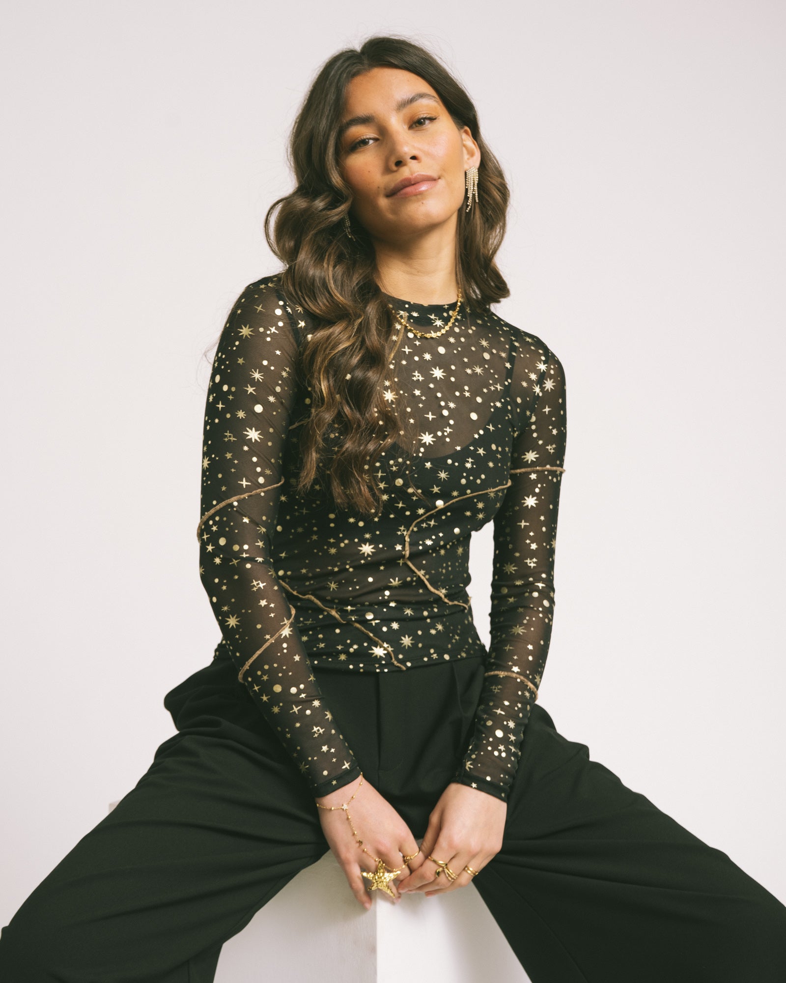 Dieses Top ist transparent, dehnbar und mit goldenen Sternen bedeckt. Die verspielten Nähte und die dezenten Babylock-Kanten verleihen ihm das gewisse Extra.