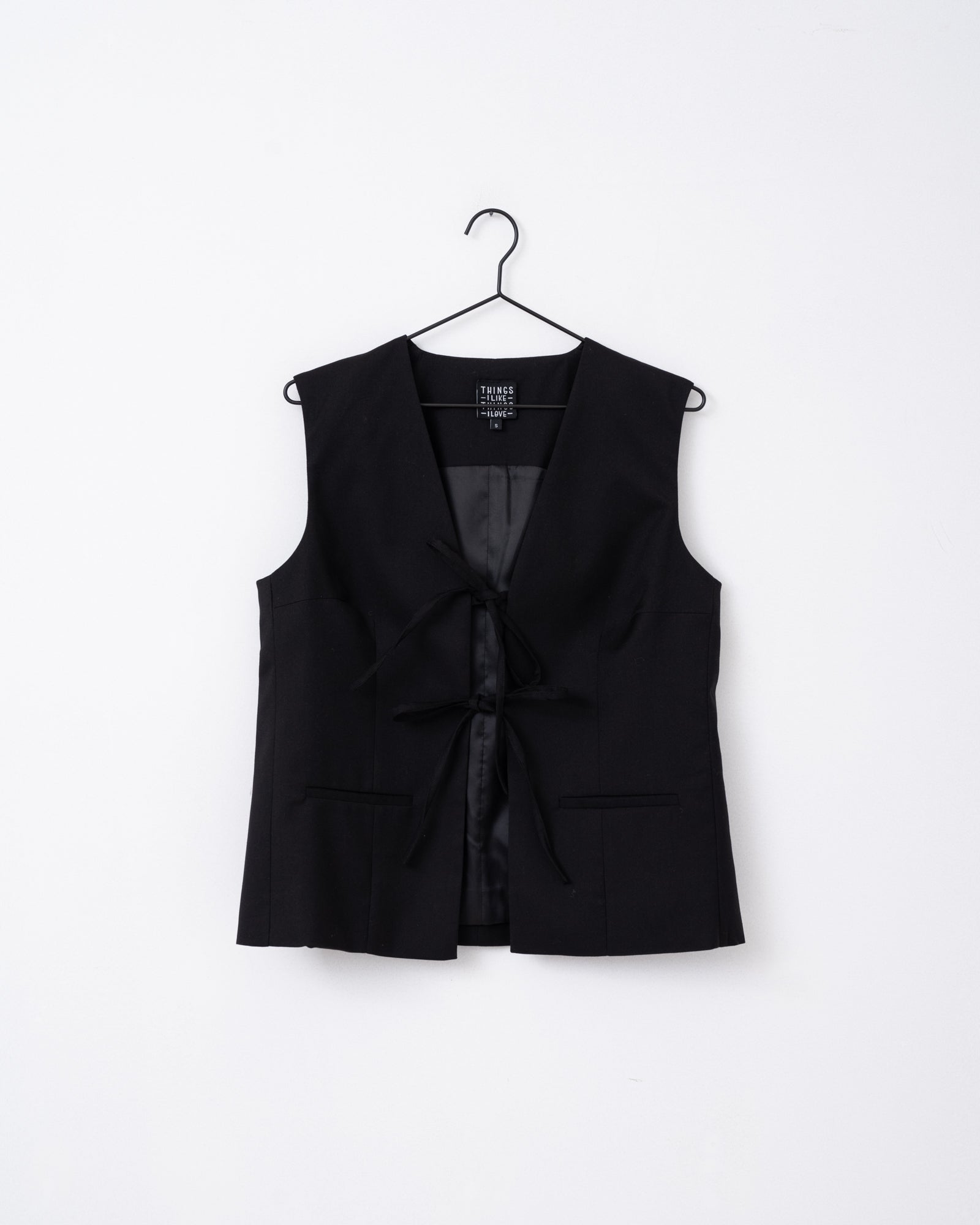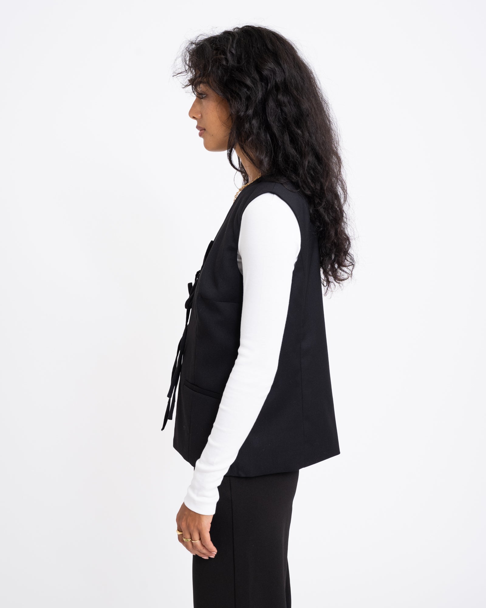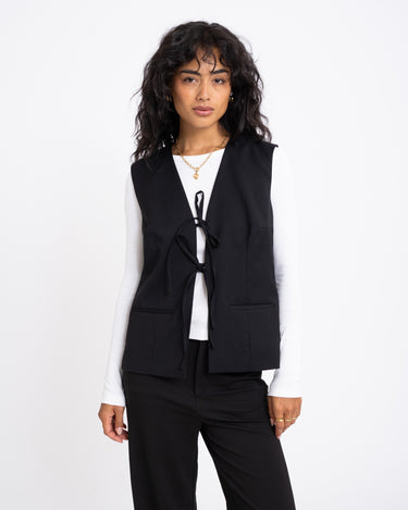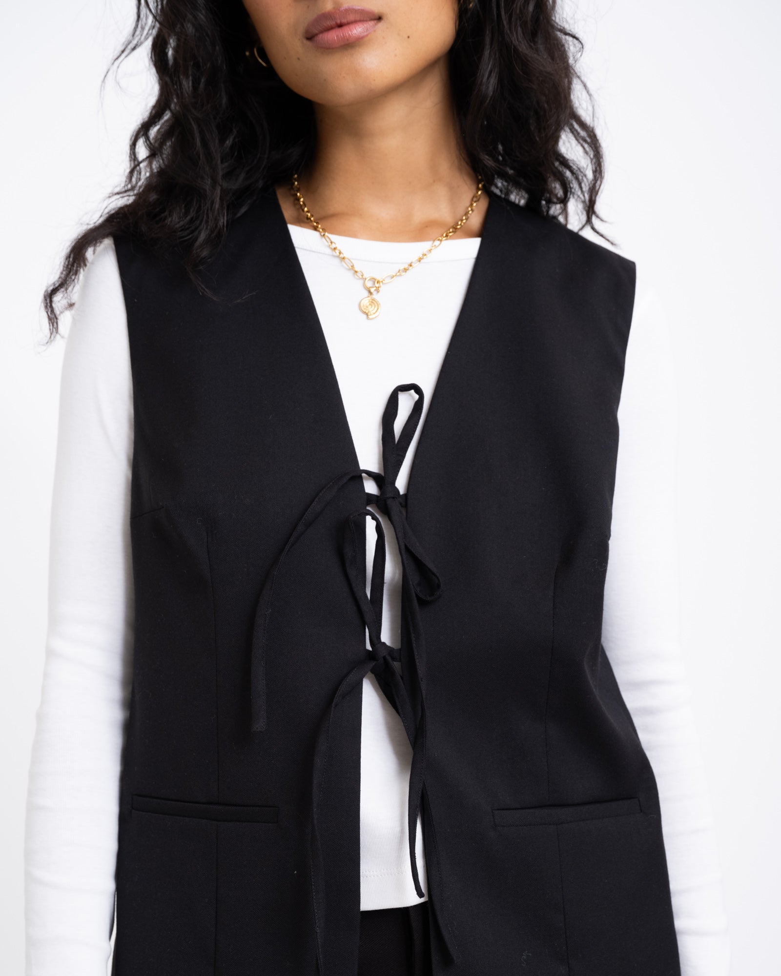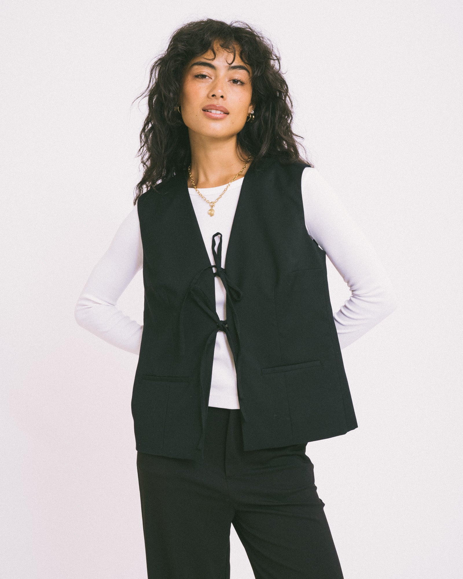 Wir haben eine neue Weste in unsere Kollektion aufgenommen: die Suki-Weste! Ein schicker Blazer mit einem trendigen Twist dank der Schnüre zum Verschließen.