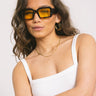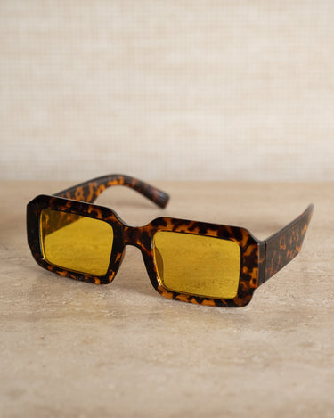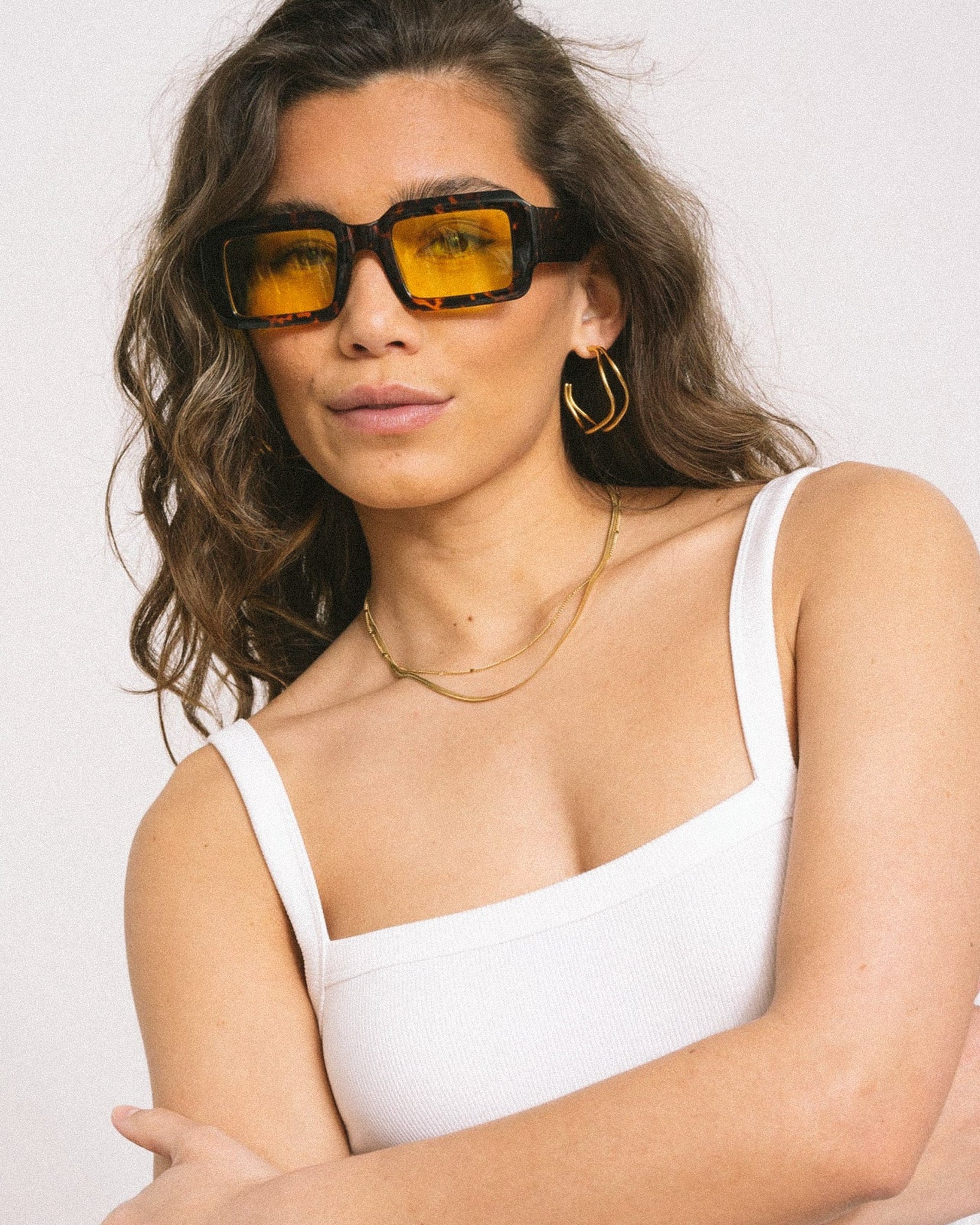Rechteckige Sonnenbrille mit Rahmen im Schildpatt-Print und orange-gelben Gläsern. Auf der Innenseite ein Augenzwinkern mit dem Tiltil-Logo und natürlich wird sie mit einem weichen Etui geliefert, sodass Sie die Brille problemlos überallhin mitnehmen können!